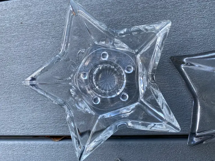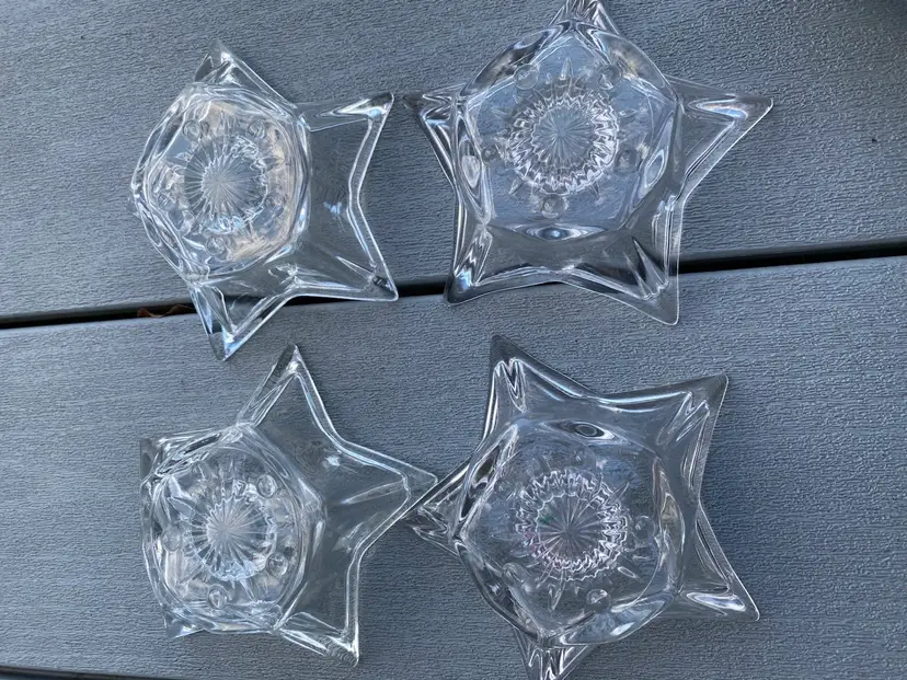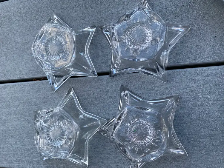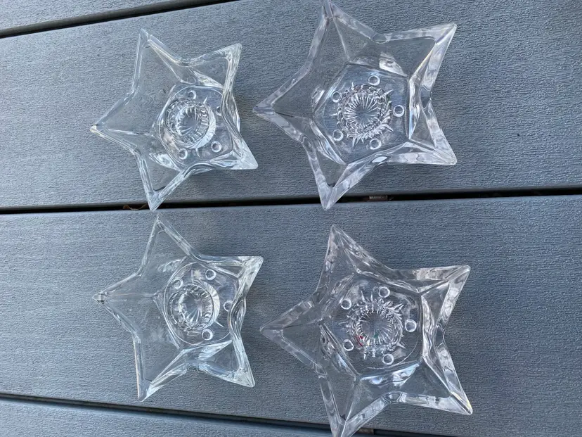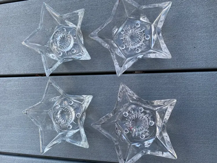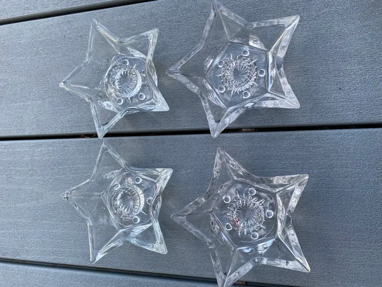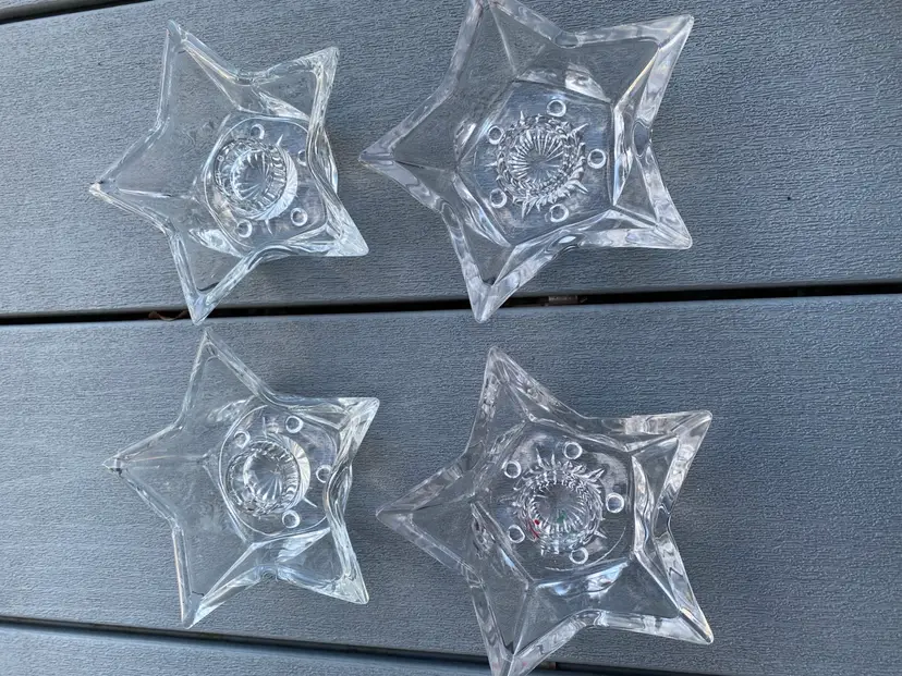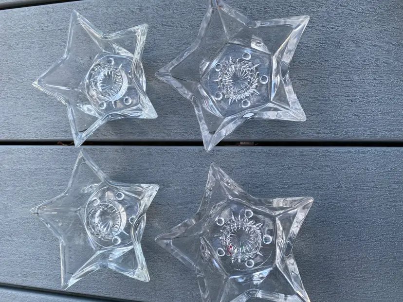 Here are 2 sets of 2 pair of Vintage Hazel Atlas Clear Pressed Glass Star Candle Holders. These lovely heavy glass star candle holders. were made by Hazel Atlas (circa 1950-1970) and hold tapered pillar candles. They have a starburst pattern on the bottom with 5 raised dots. These candle holders would make a wonderful addition to any wedding, holiday or home decor or collection. Please select whether you would like to buy 1 pair (2 candlestick holders) or 2 pair (4 candlestick holders).