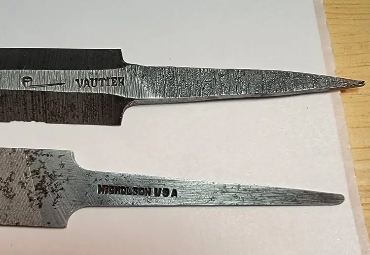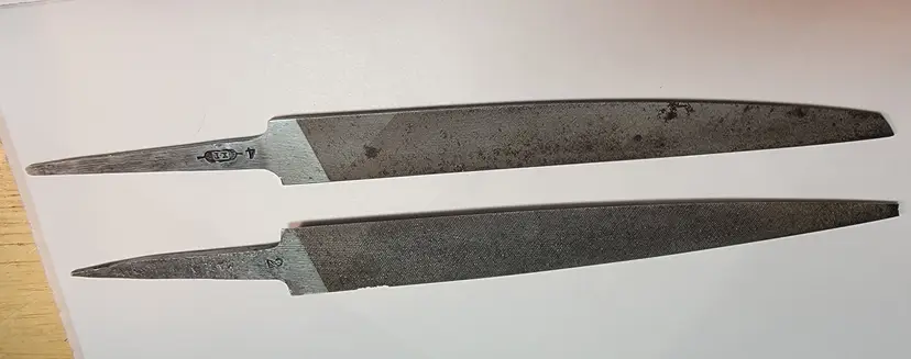 Up for sale are 2 Swiss-type encasement files. These are usually use in watchmaking and jeweler work where precision filing is required. They can also be used by any craft where very fine file cutting is needed. These 2 files are made by 2 of the finest file makers. One is made by Vautier, a known Swiss/French manufacturer of escapement and needle files. The tapered, flat shape with a fine point and consistent width is common in barrette, crossing, or knife-shaped escapement files.Extremely fine tooth pattern, likely a very fine Swiss cut (possibly Cut #4–6+).It is used for removing minimal material with high precision. the 2nd.one has the cartouche of K.F and was made for Nicholson File Co. by German tool maker "Krieger & Föhr" a well known German manufacturer of fine files and precision tools. Their tools were widely used by jewelers, instrument makers, and horologists. These files could be used by many woodworks who wanted very fine precision files to work on all kinds of woodworking tool.