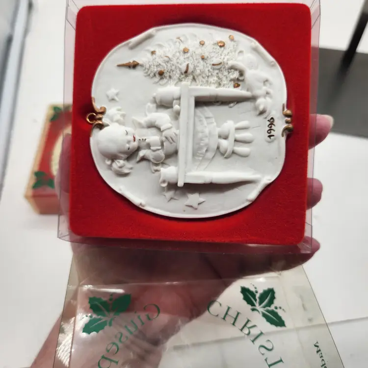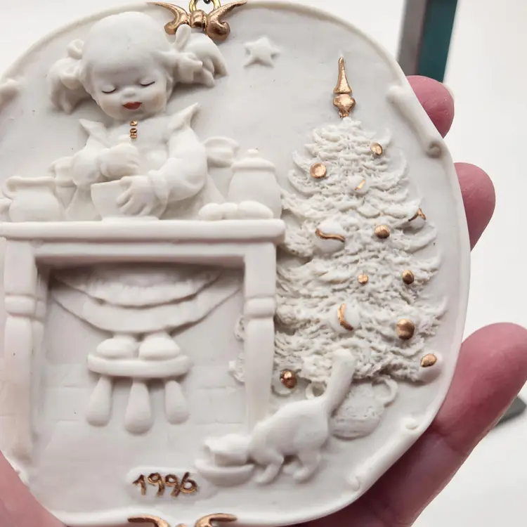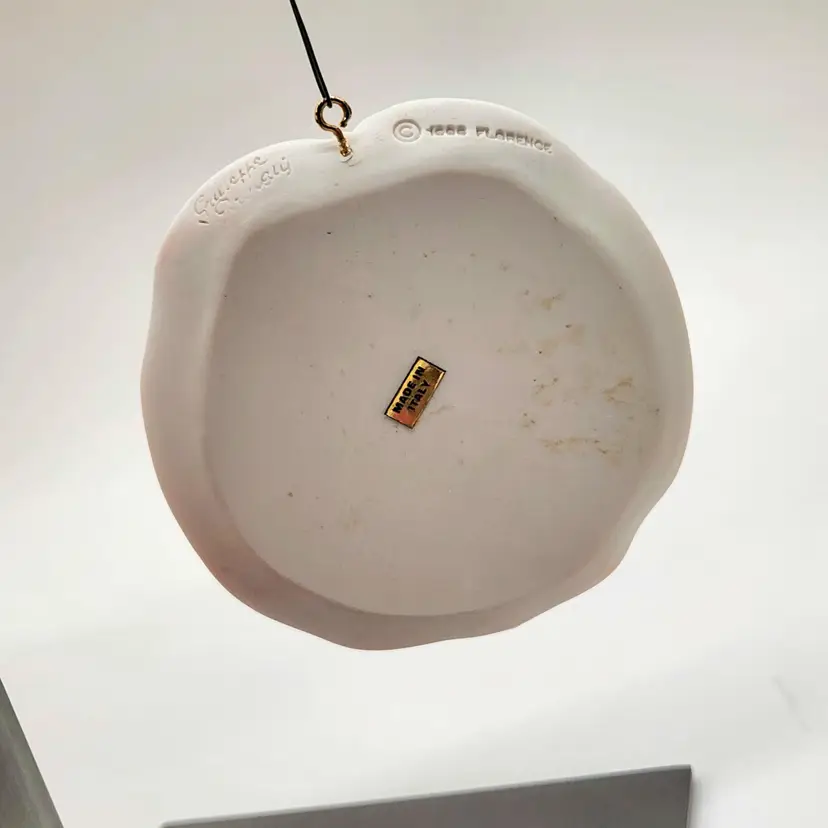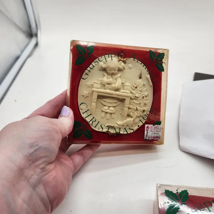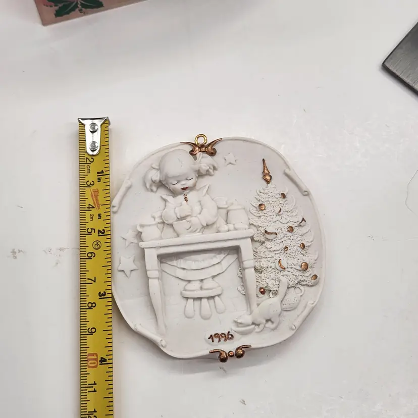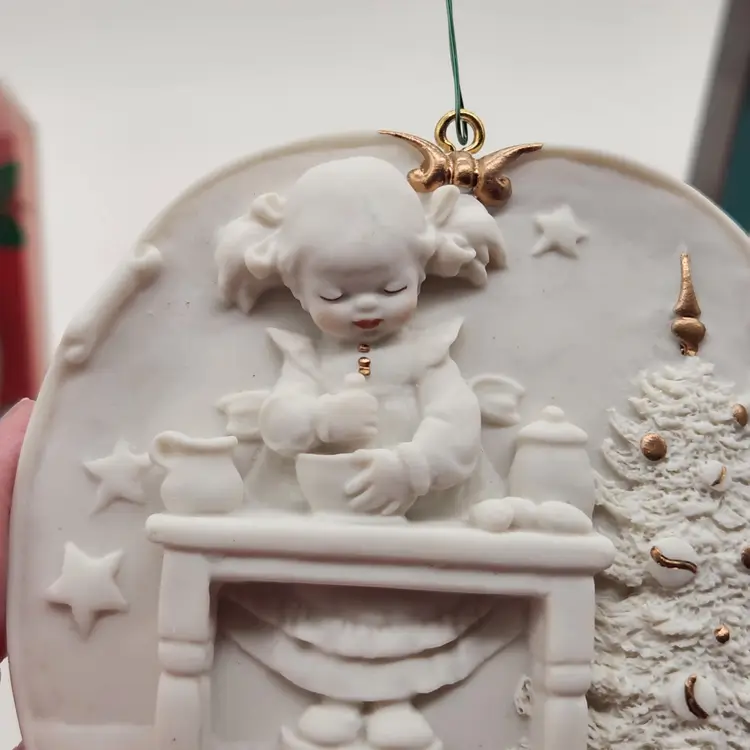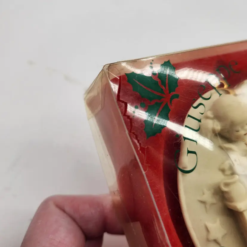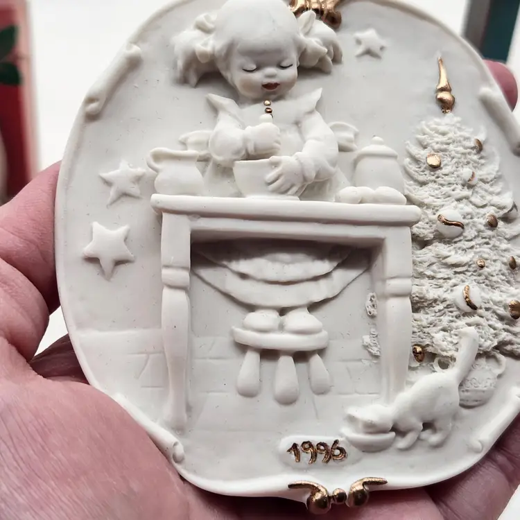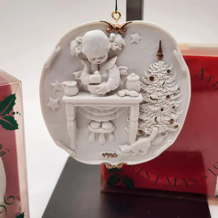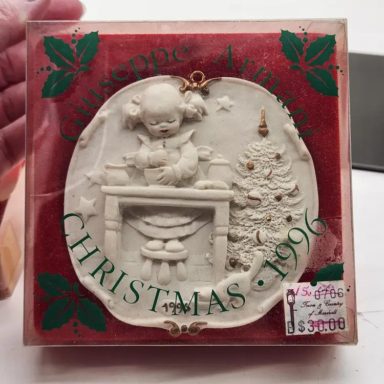 Both have no damages or flaws. The one display box is damaged in a couple of places as well as discolored, the other is in good shape for its age. These are vintage from 1996 by Giuseppe Armani featuring a young girl baking something for Christmas in a bisque porcelain plaque/wall plate/ ornament. Handmade ornament from Italy. The round porcelain plaque features a festive Christmas baking scene designed by the renowned artist Giorgio Armani. The detailed hand-painted white and gold colors.