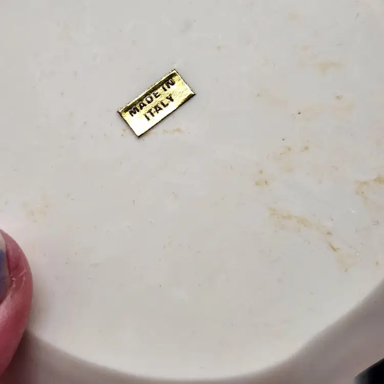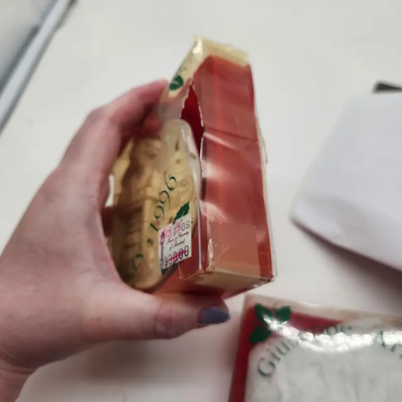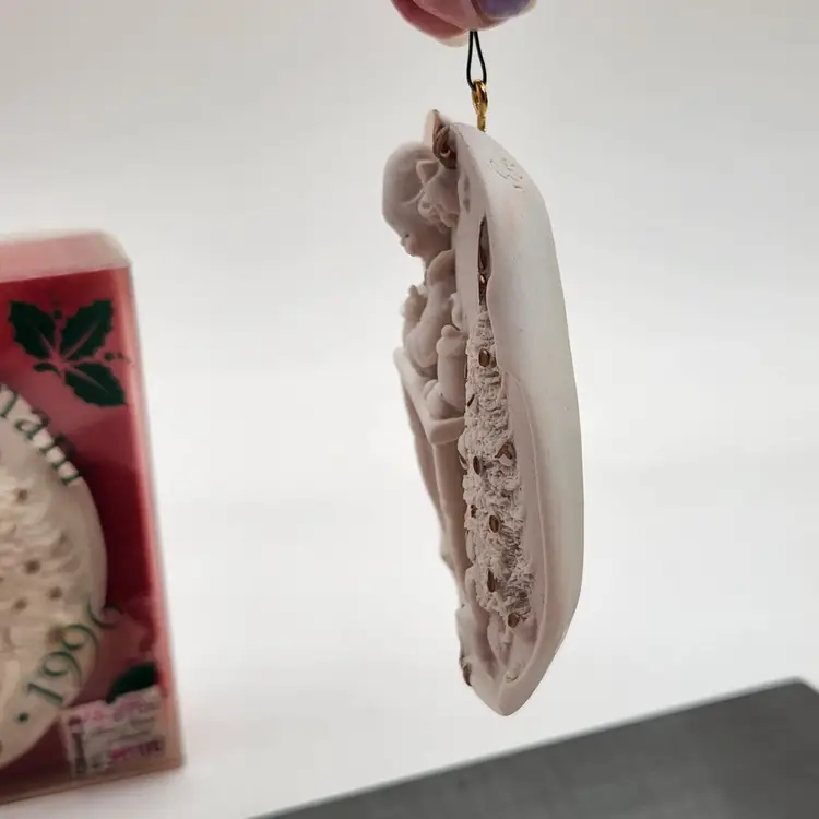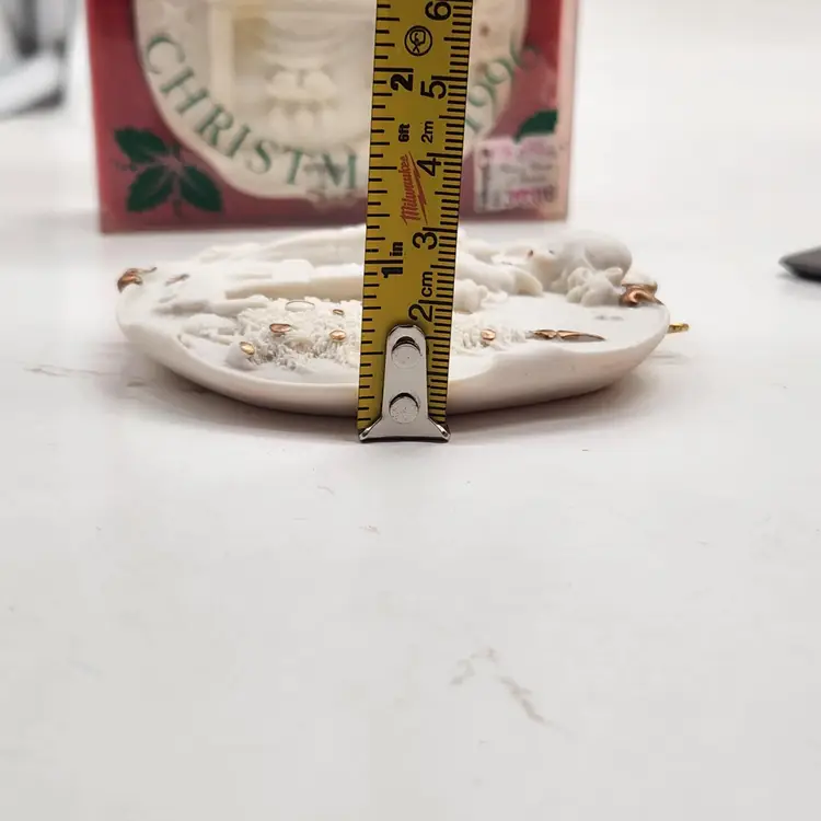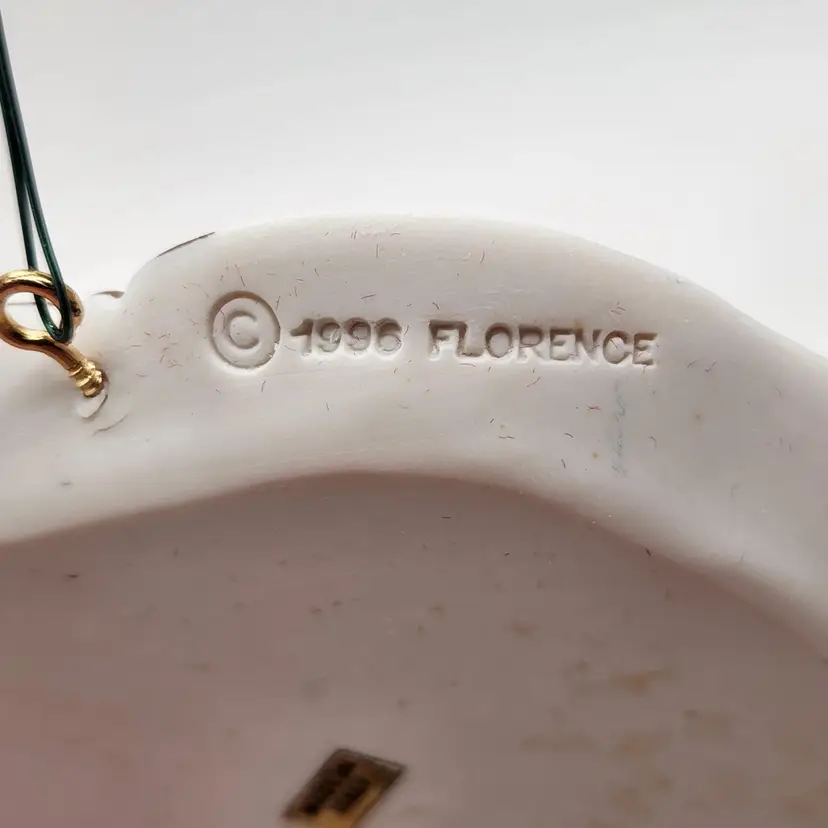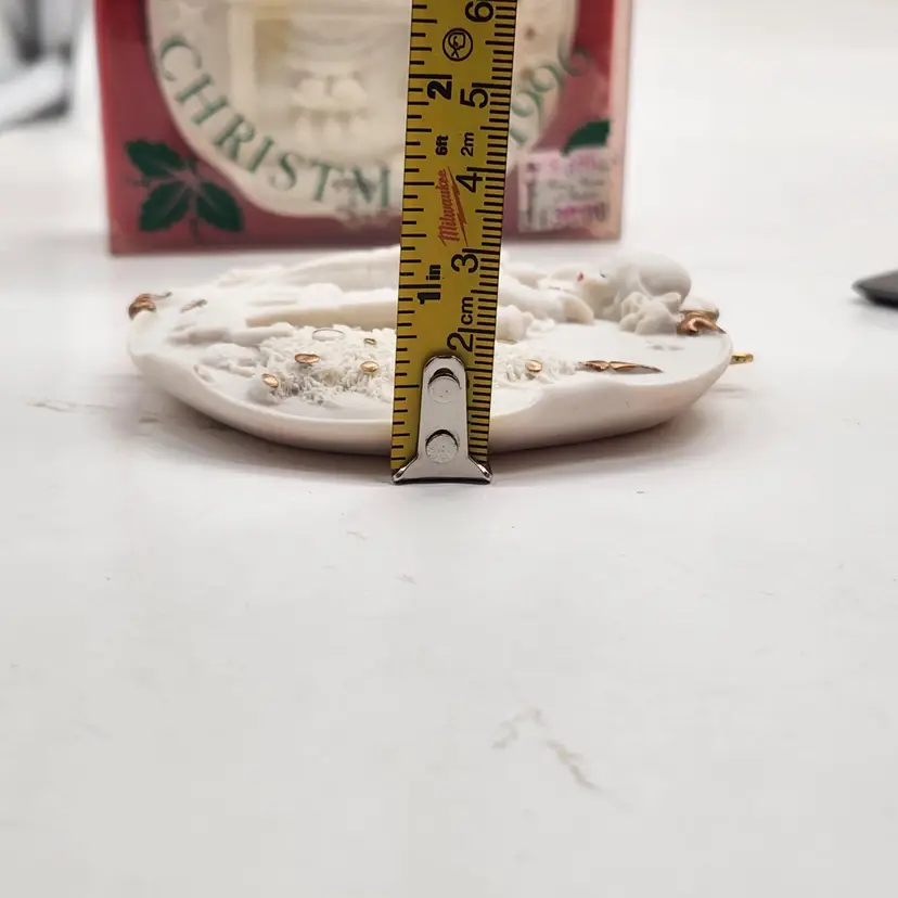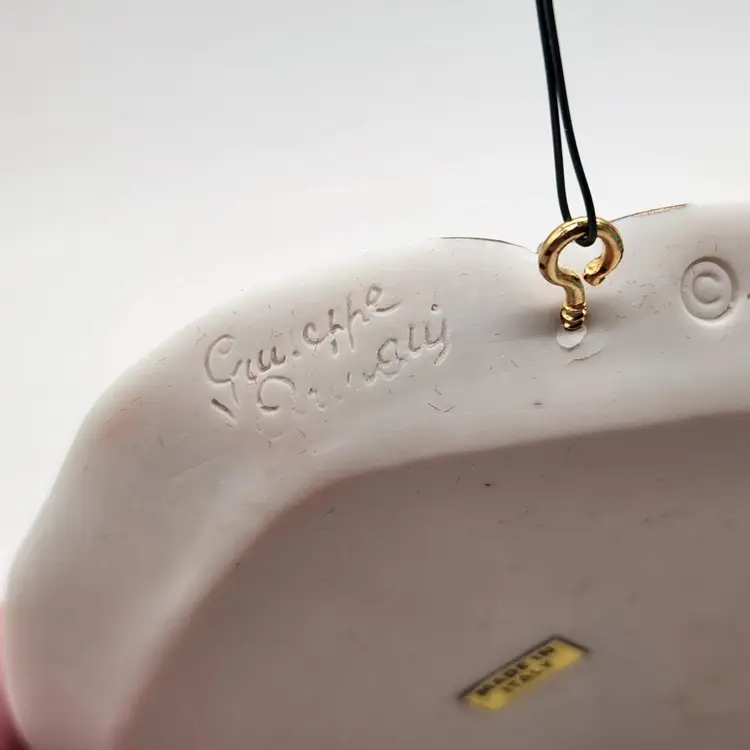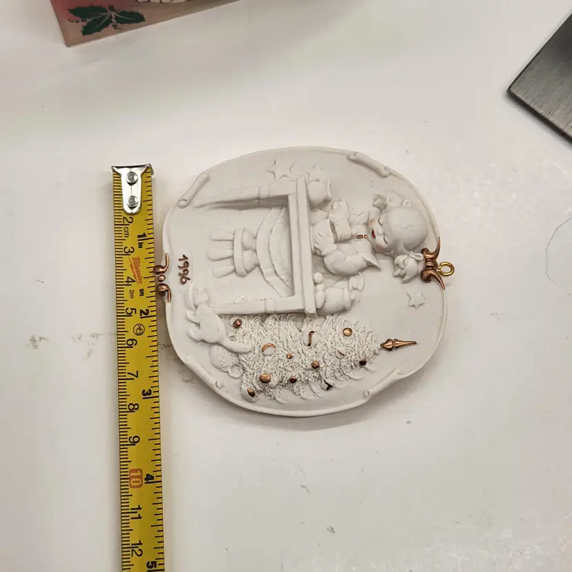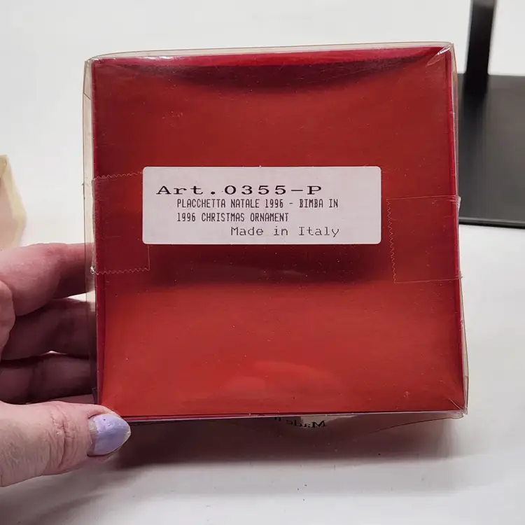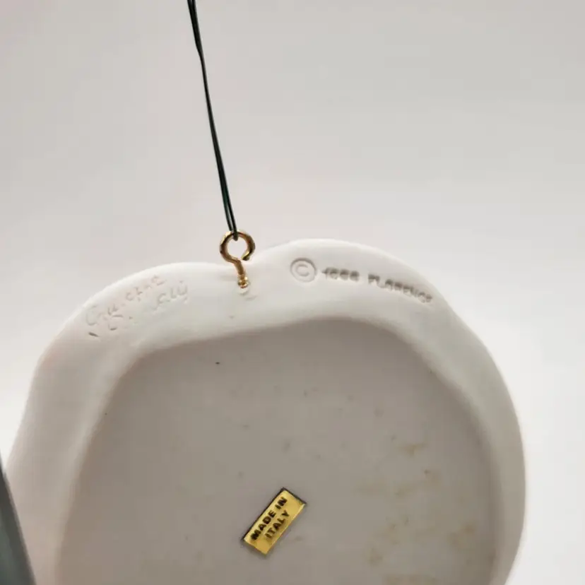Both have no damages or flaws. The one display box is damaged in a couple of places as well as discolored, the other is in good shape for its age. These are vintage from 1996 by Giuseppe Armani featuring a young girl baking something for Christmas in a bisque porcelain plaque/wall plate/ ornament. Handmade ornament from Italy. The round porcelain plaque features a festive Christmas baking scene designed by the renowned artist Giorgio Armani. The detailed hand-painted white and gold colors.