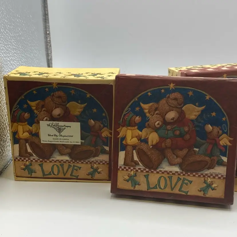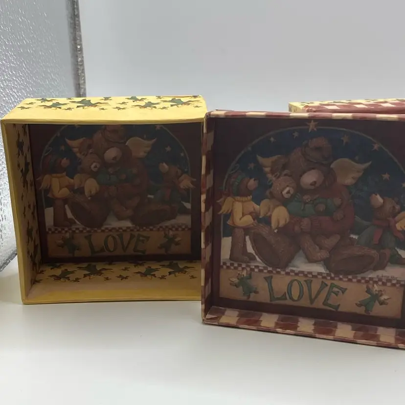 4 boxes with design on inside and outside of all lids and boxes. Largest box is 3.25”x3.25”x1.75” Smallest box is 2.25”x2.25”x1.25”
