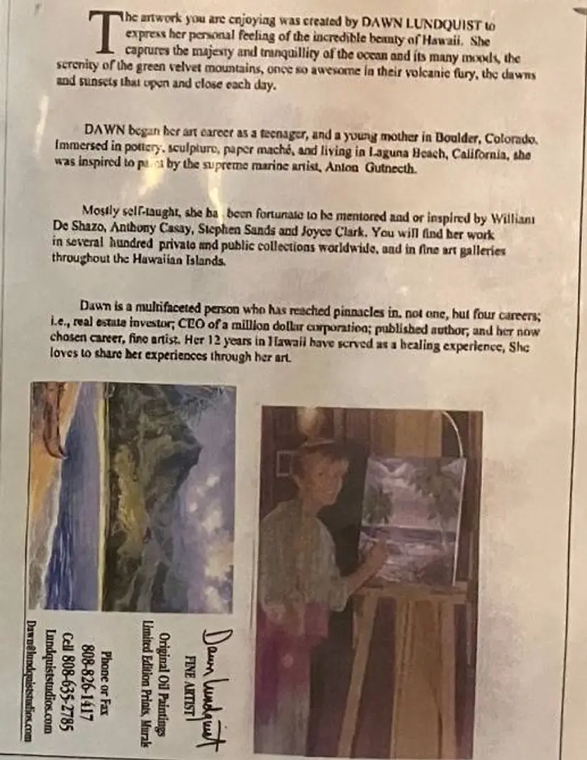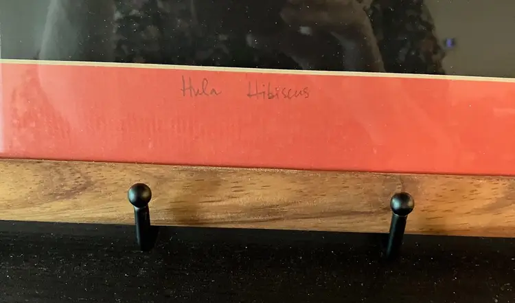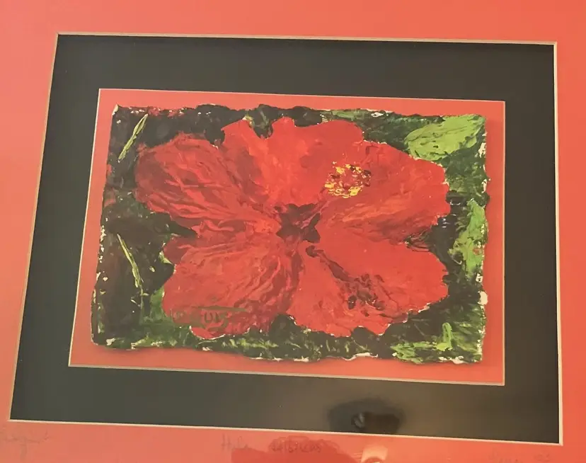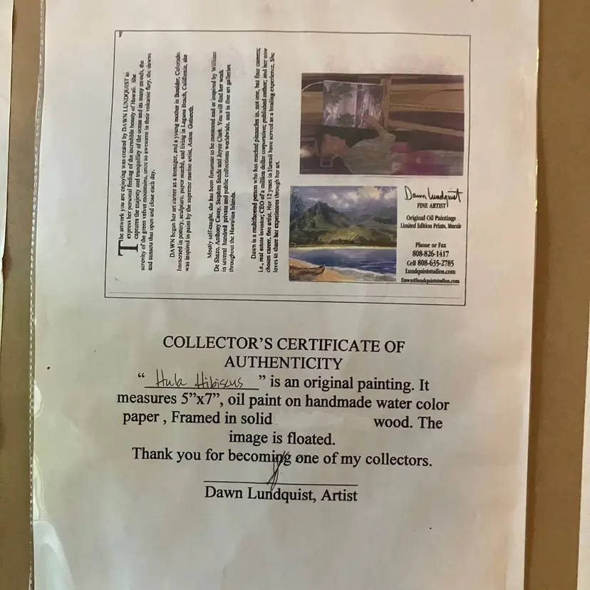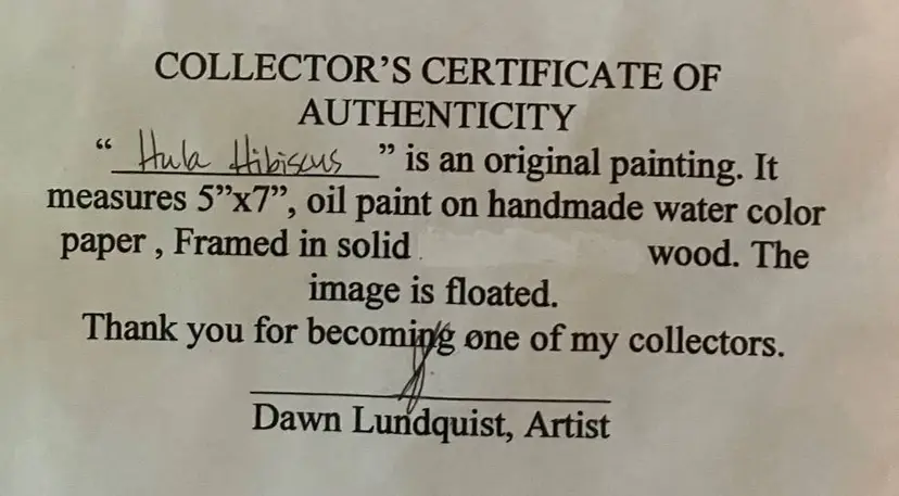Collector's Certification Authenticity: "Hula Hibiscus" is an original painting. It measures 5" by 7" oil paint on handmade water color paper framed in solid wood. The image is floated. By Dawn Lundquist. Overall measurements: 12 3/4" by 15 3/4" by 1". No condition issues.