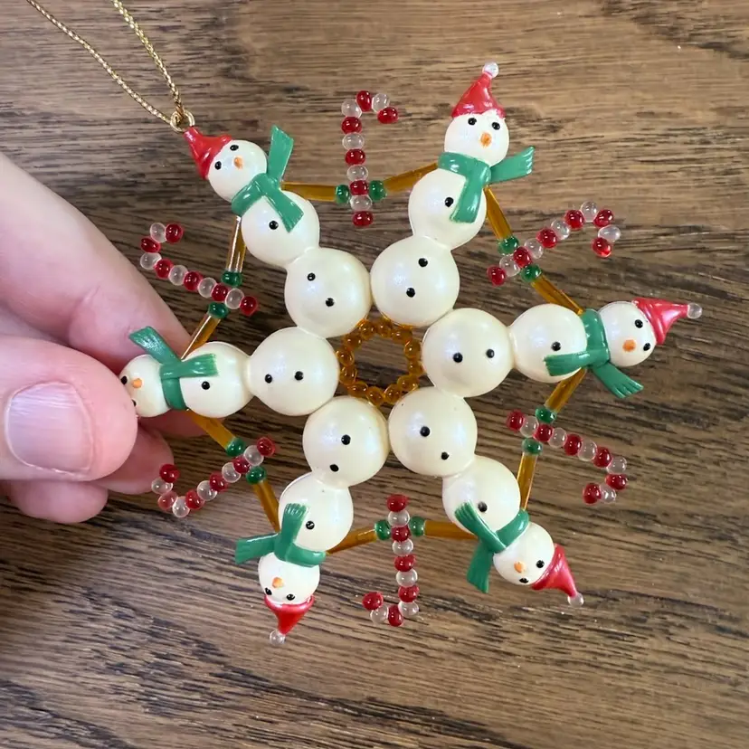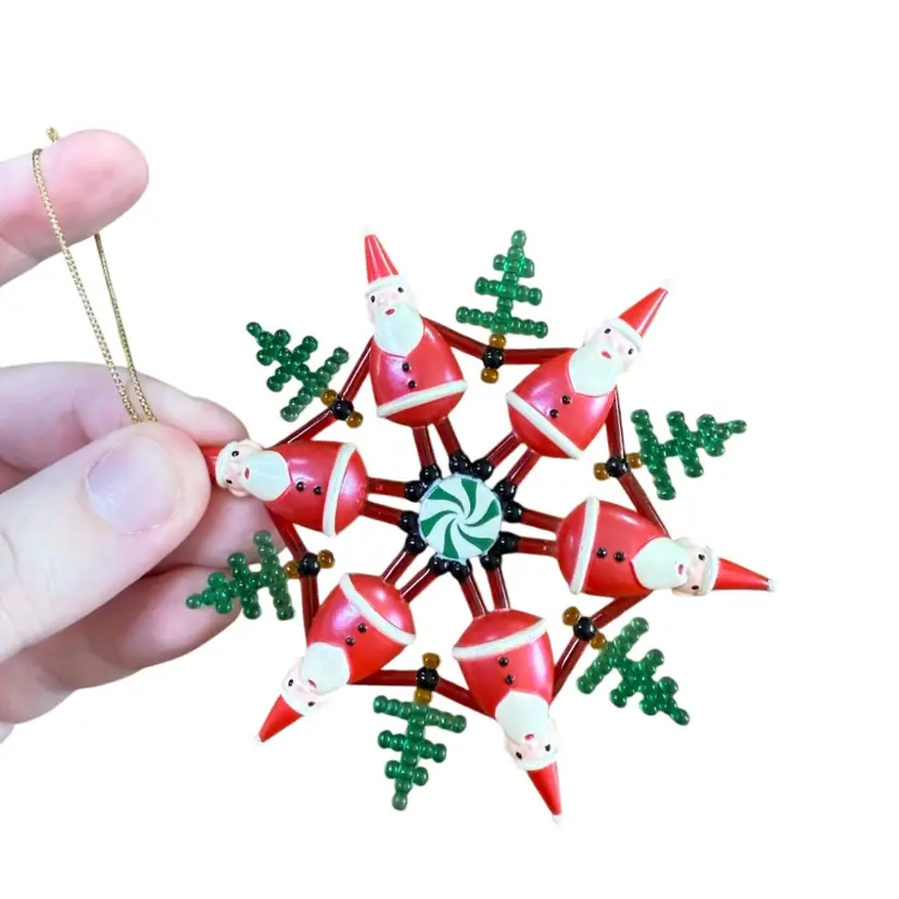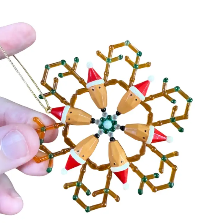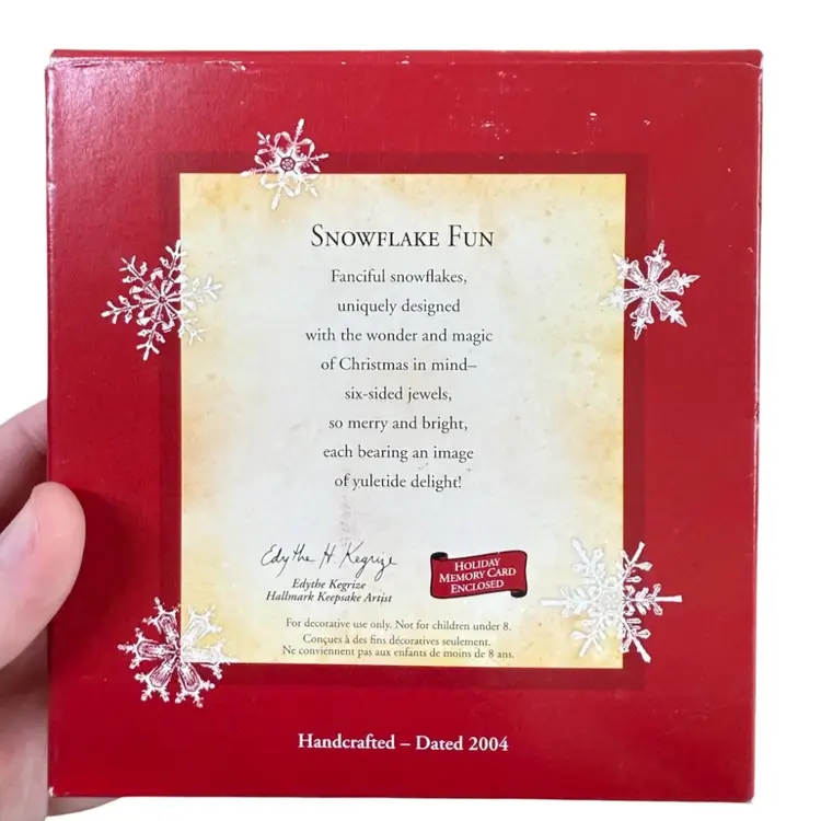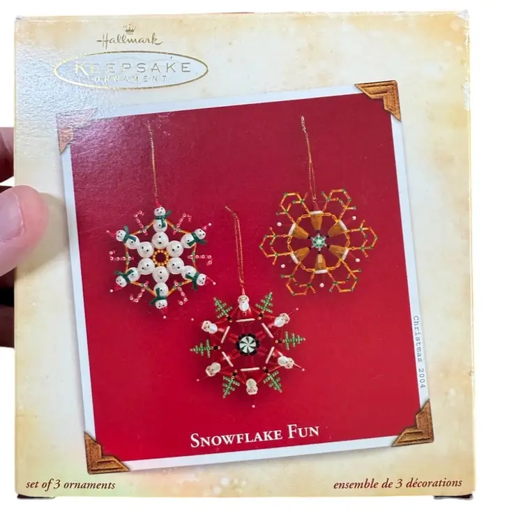 A three piece set of Hallmark ornaments, 2004. Each ornament is in the shape of a snowflake and features a Christmas character - snowman, Santa and reindeer. No issues! Includes original box.