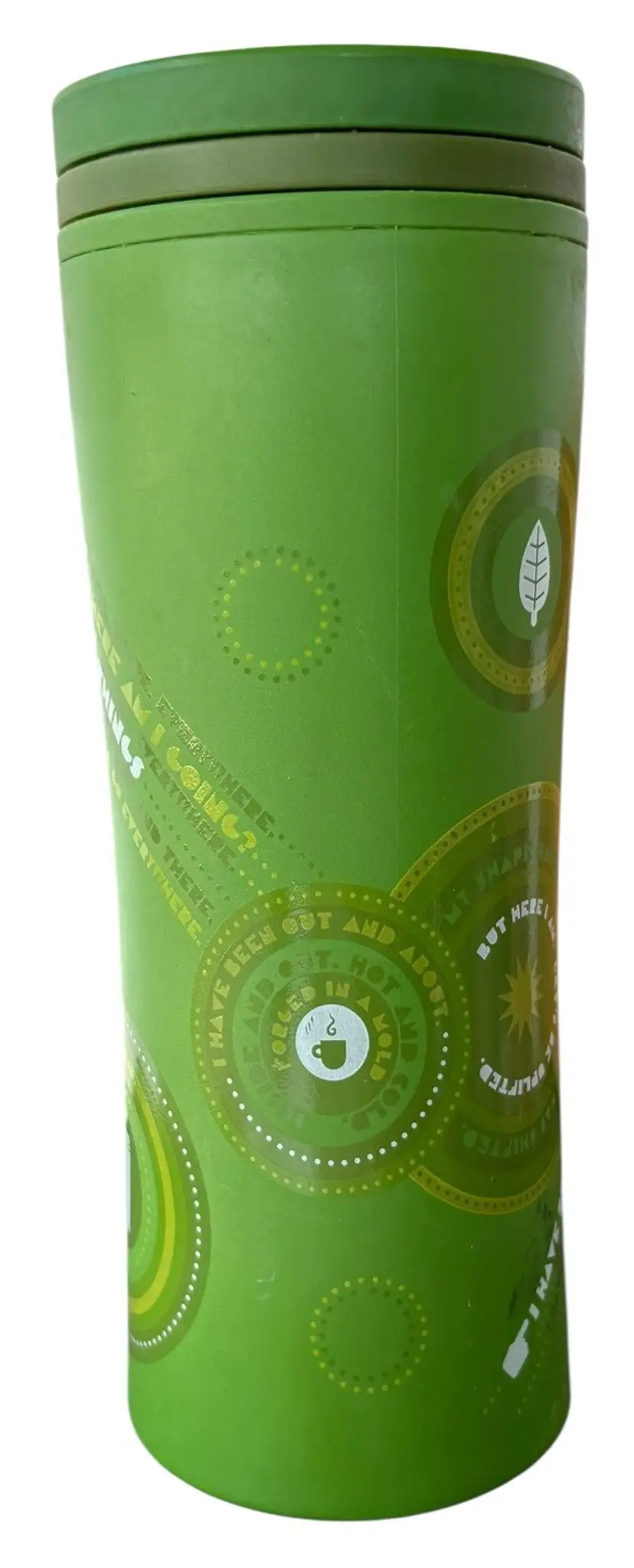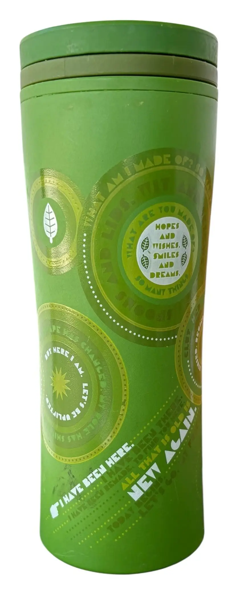 The 2010 Starbucks Tumbler 16oz Green Where Have I Been Twist Lid Travel Plastic Cup is a collectible advertising item for Starbucks. This original green tumbler features a twist lid design and a theme centered around coffee and tea. The 2010 creation date adds to its vintage appeal, making it a unique and sought-after piece for coffee and tea enthusiasts as well as Starbucks collectors.