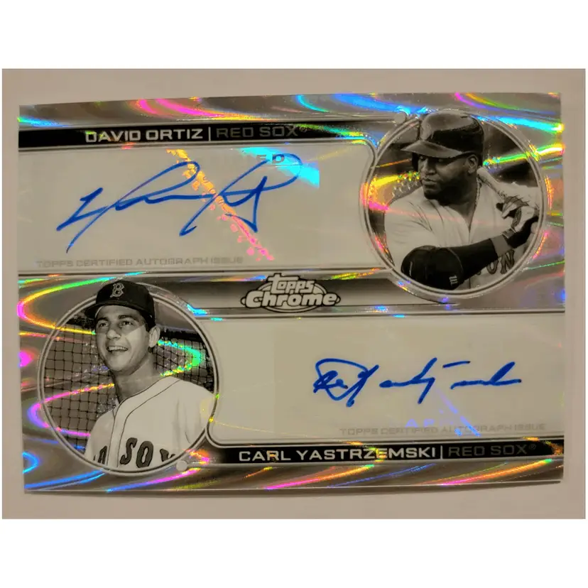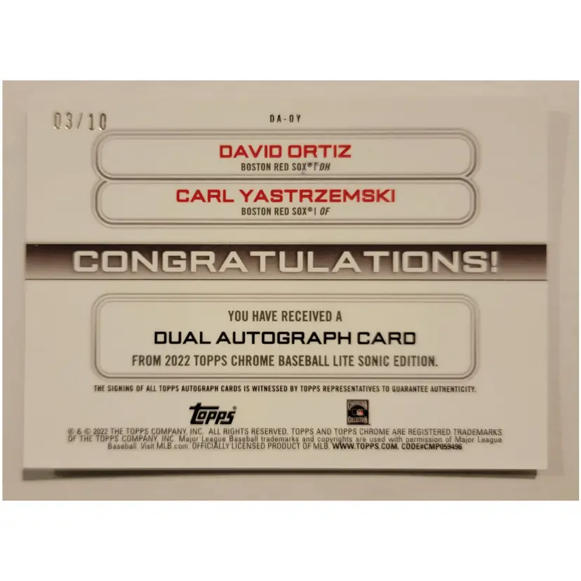 This listing is for a 2022 Topps Chrome Sonic Black and White RayWave Refractor Autograph card of David Ortiz and Carl Yastrzemski, card #DA-OY, and #'d 3/10.