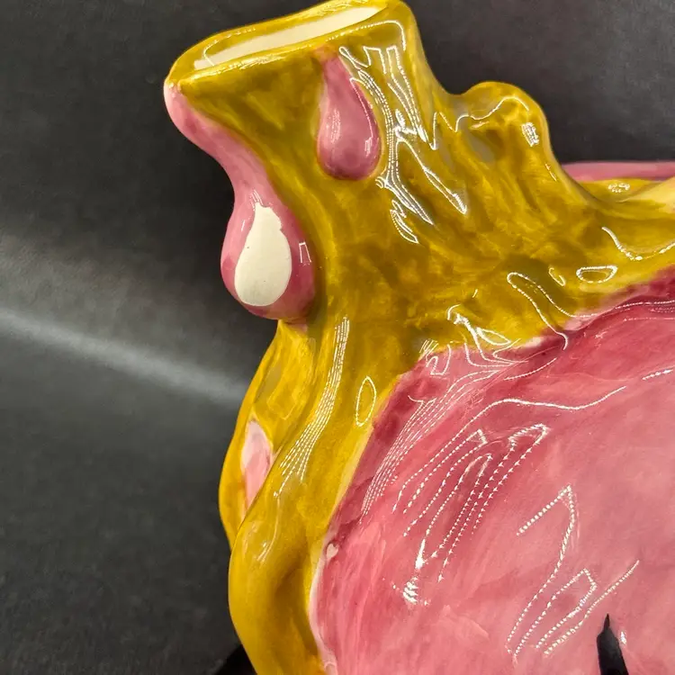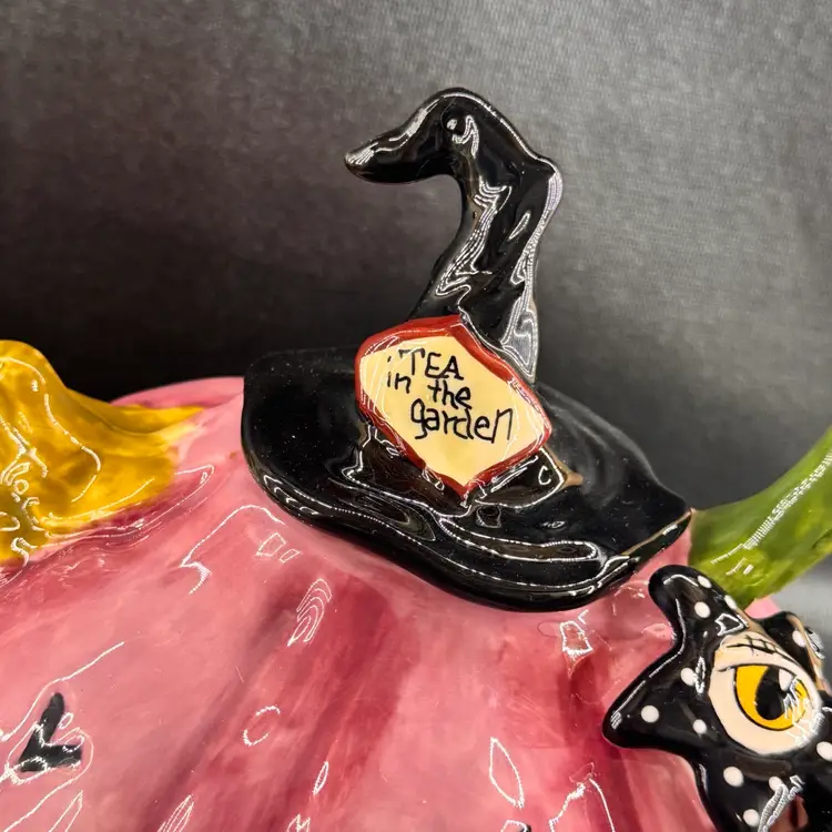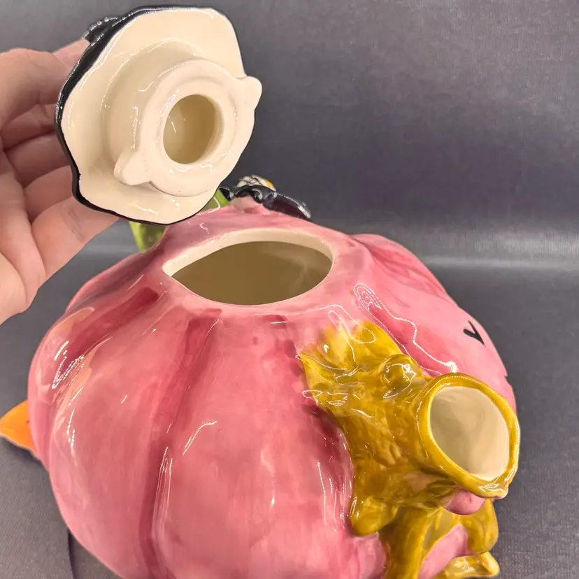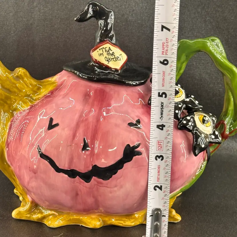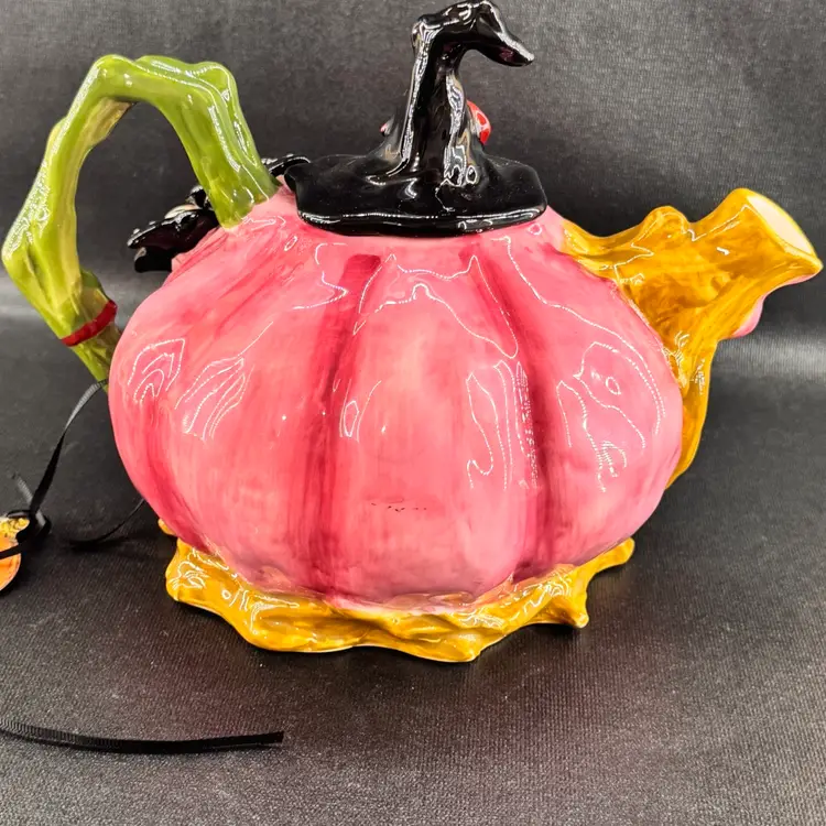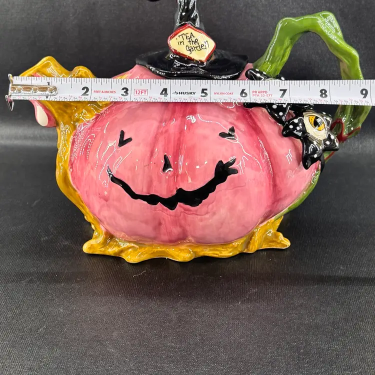 Still has tag. No chips or cracks, but is missing a section of pink paint off the spout. See photos. Approximately 7.5” tall, and 9” wide.