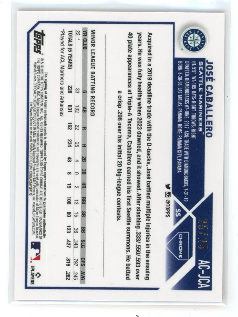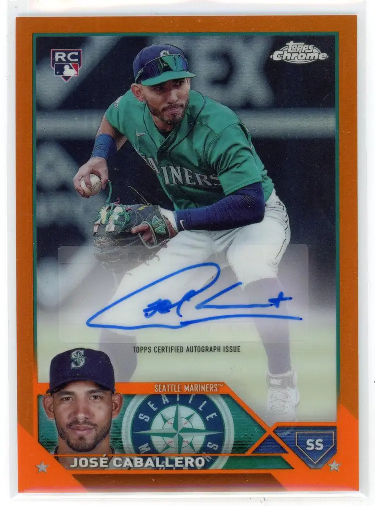 Catch this slick-fielding shortstop in action with the 2020 Topps Chrome Jose Caballero Rookie Card. This orange refractor edition is topped off with a certified autograph, making it a standout addition to any Mariners fan's collection. Limited in quantity and high in demand, this card is a surefire hit for collectors chasing the next big star. Secure this gem before it slides out of reach!