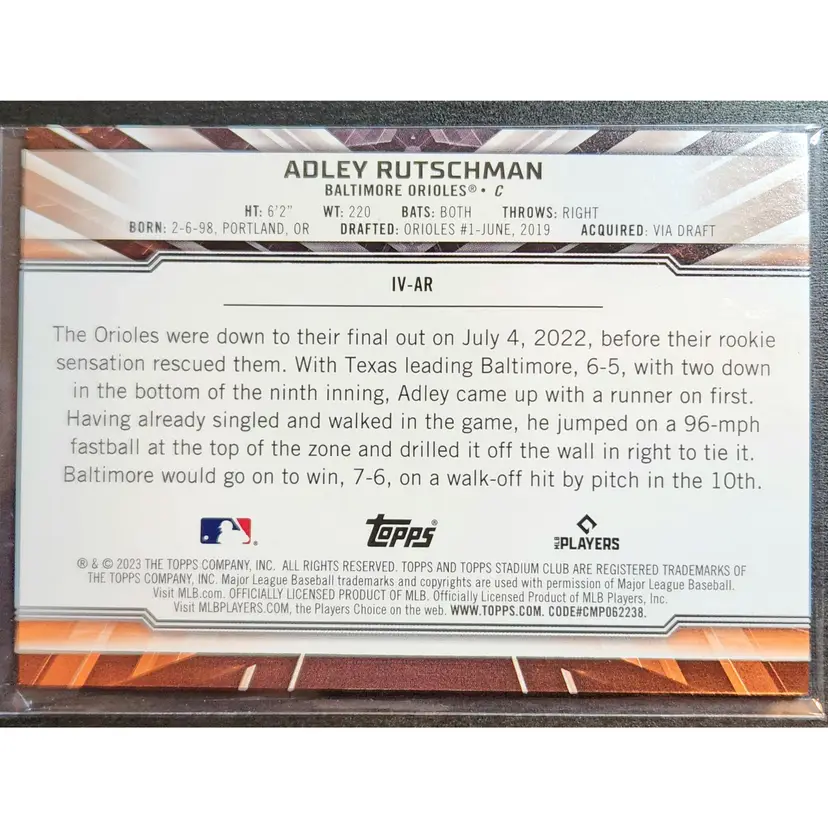 This is a great Adley Rutschman insert from the new Stadium Club release. The card is a thicker insert, so there is some minor corner wear.