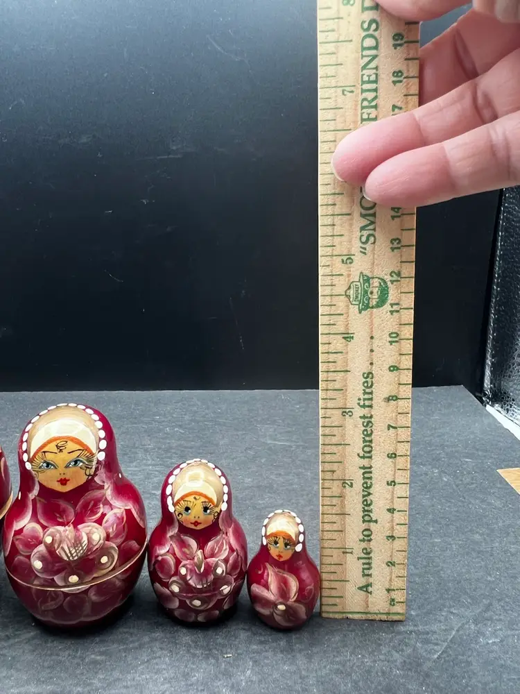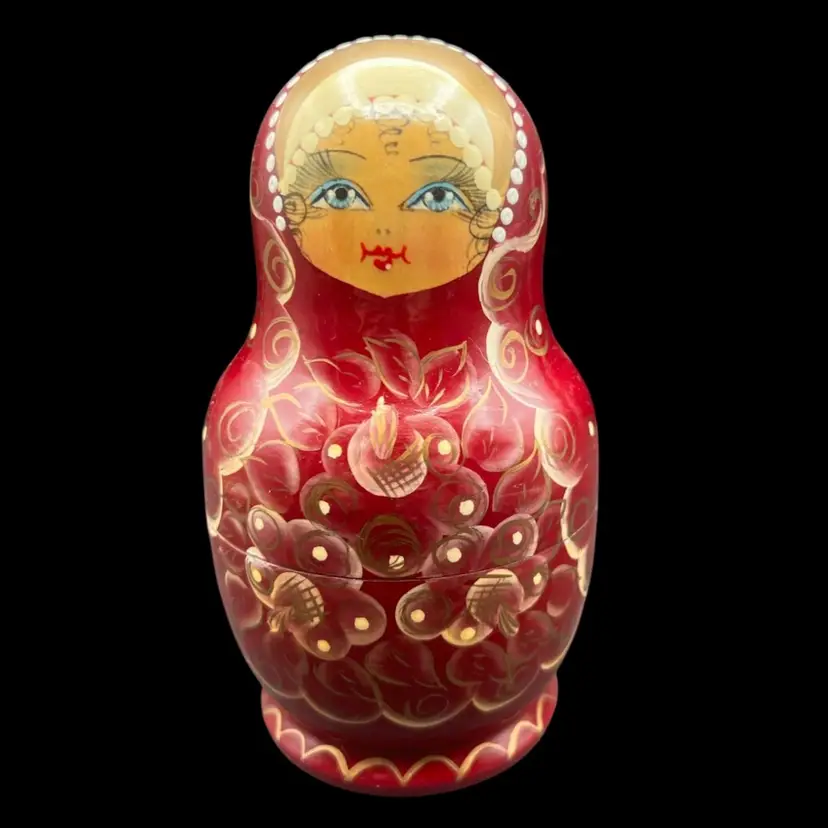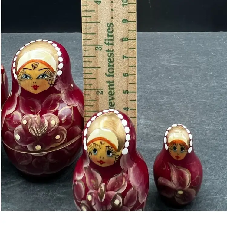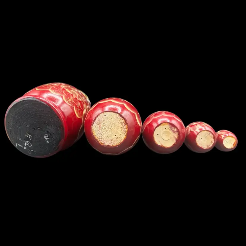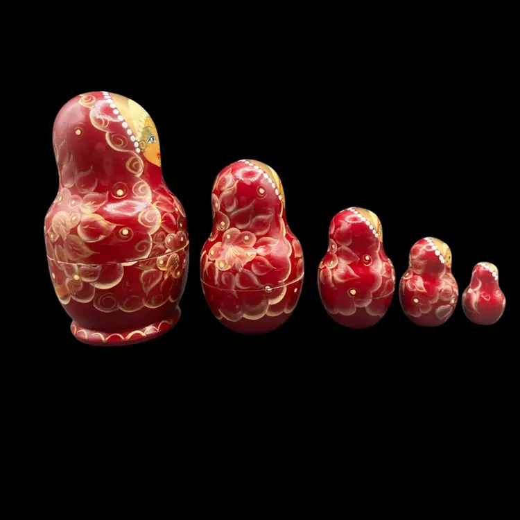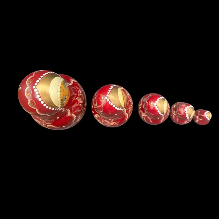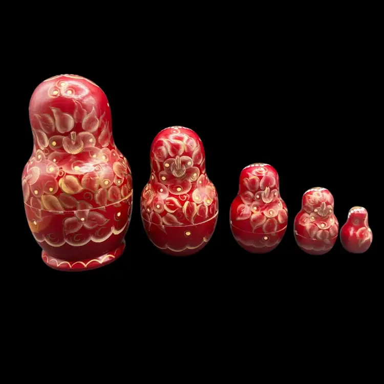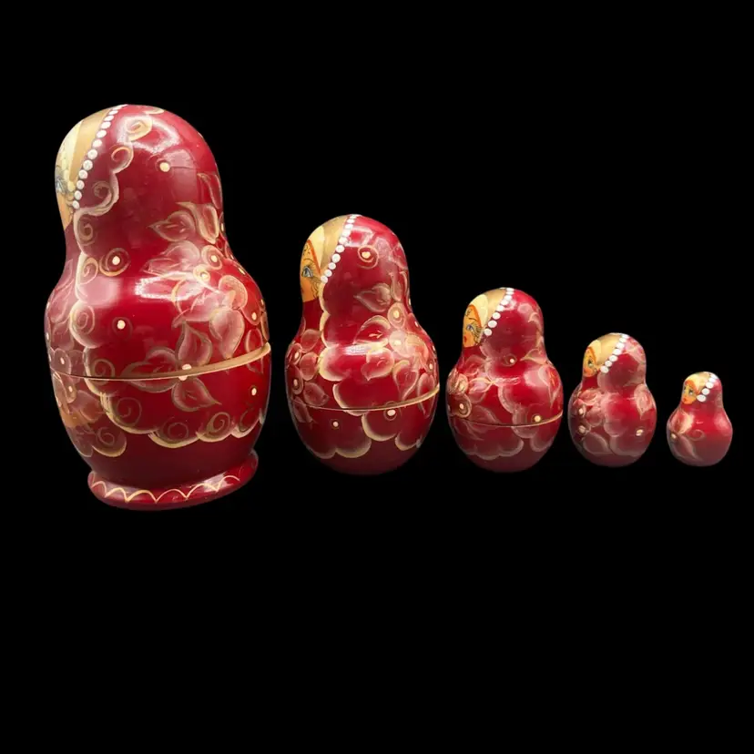 Vintage Handmade And Hand Painted Set Of 5 wooden Nesting Matryoshka Dolls. Lady, Floral, Red, White & Gold. Marked and Signed On Bottom - I cannot make out the name/signature Measurement 3/4” to 3” In very good condition.
