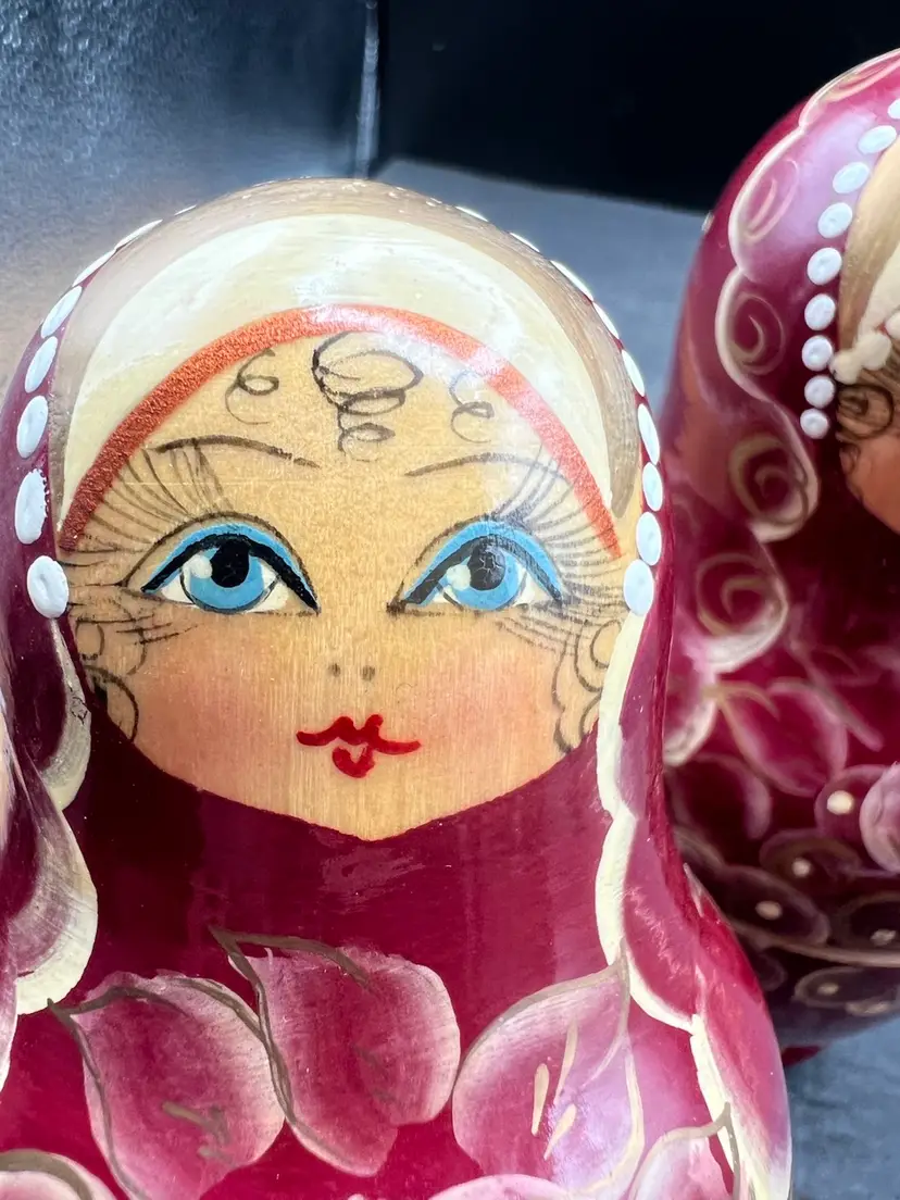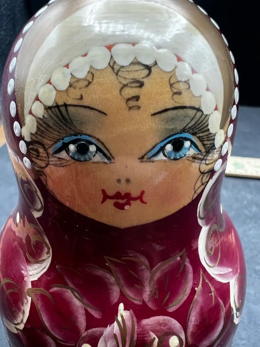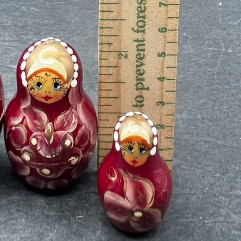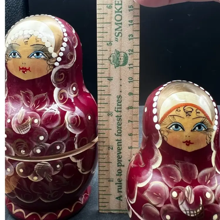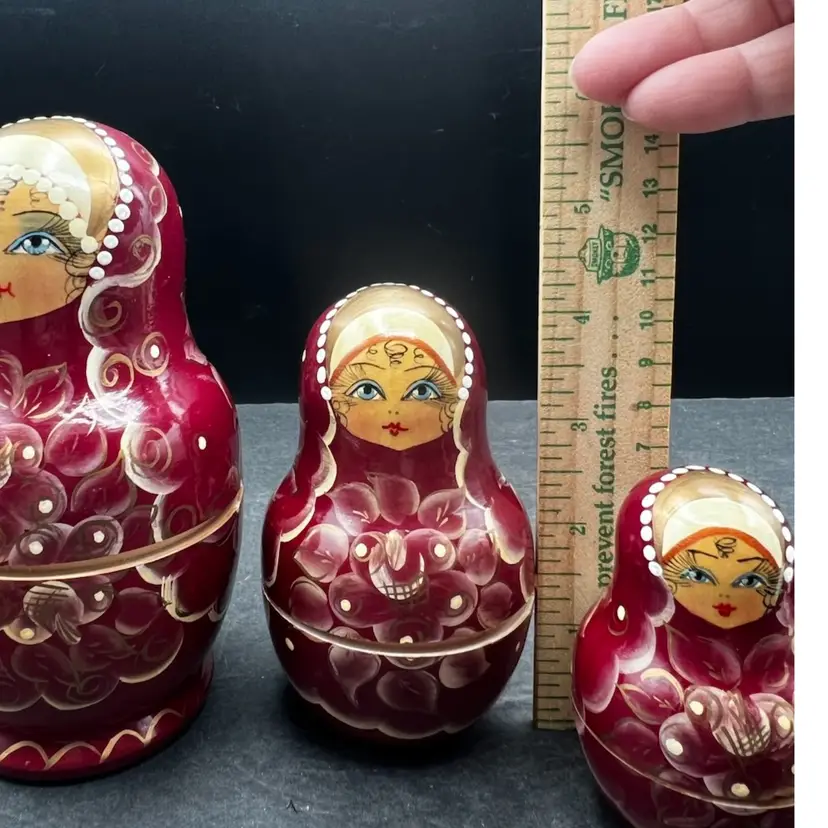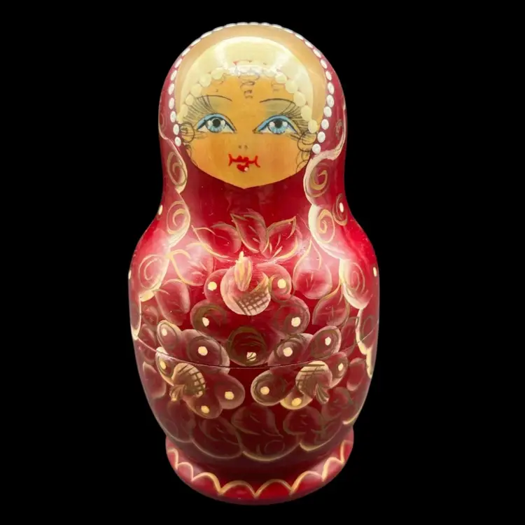 Vintage Handmade And Hand Painted Set Of 5 wooden Nesting Matryoshka Dolls. Lady, Floral, Red, White & Gold. Marked and Signed On Bottom - I cannot make out the name/signature Measurement 3/4” to 3” In very good condition.