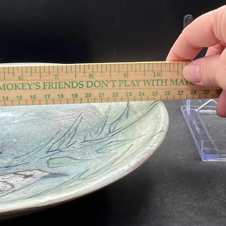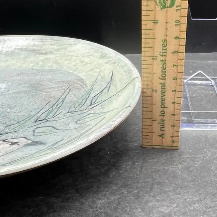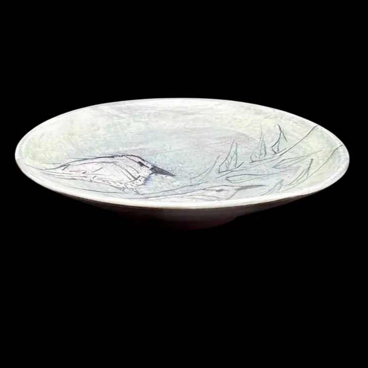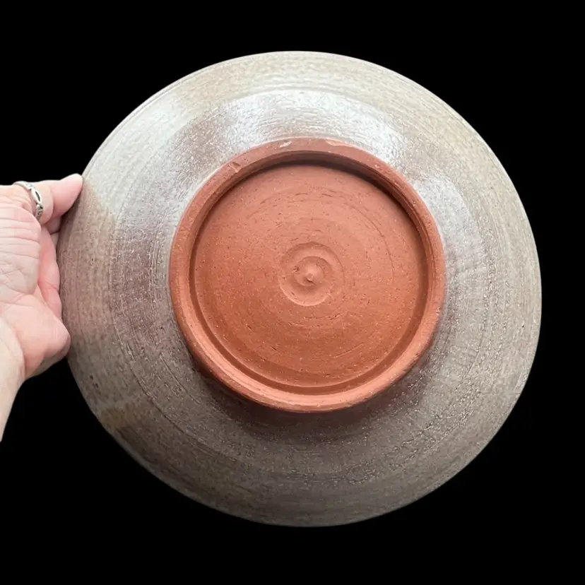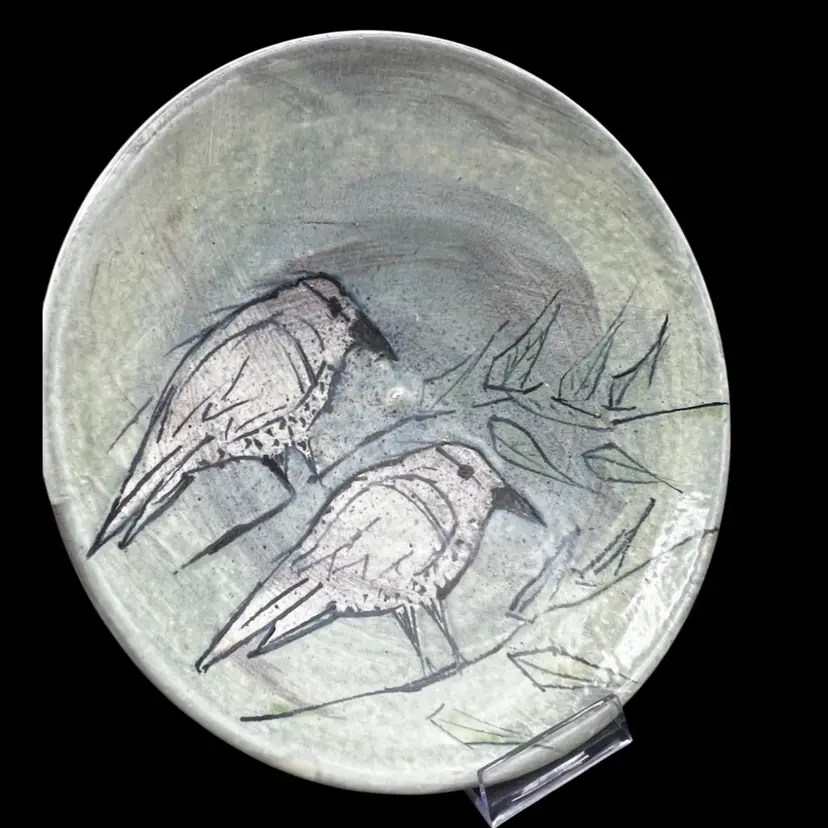 Vintage Hand Thrown Pottery Bowl With Birds And Leaf Design. 10” In Diameter In very good condition, no chips or cracks