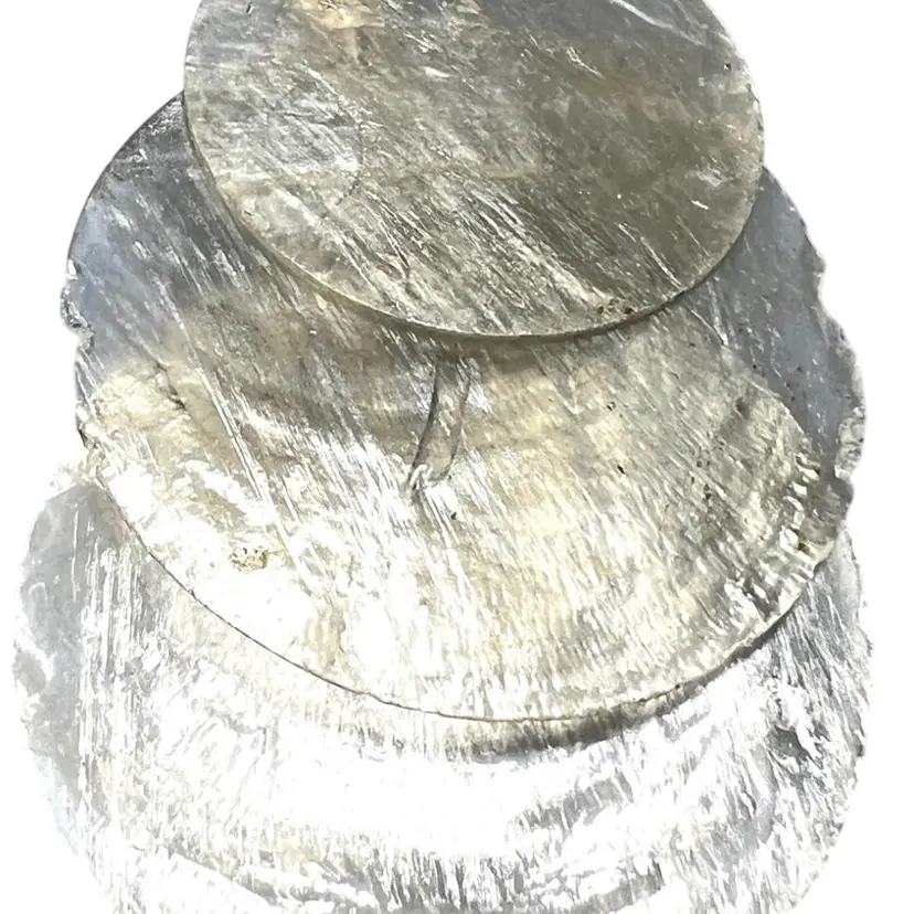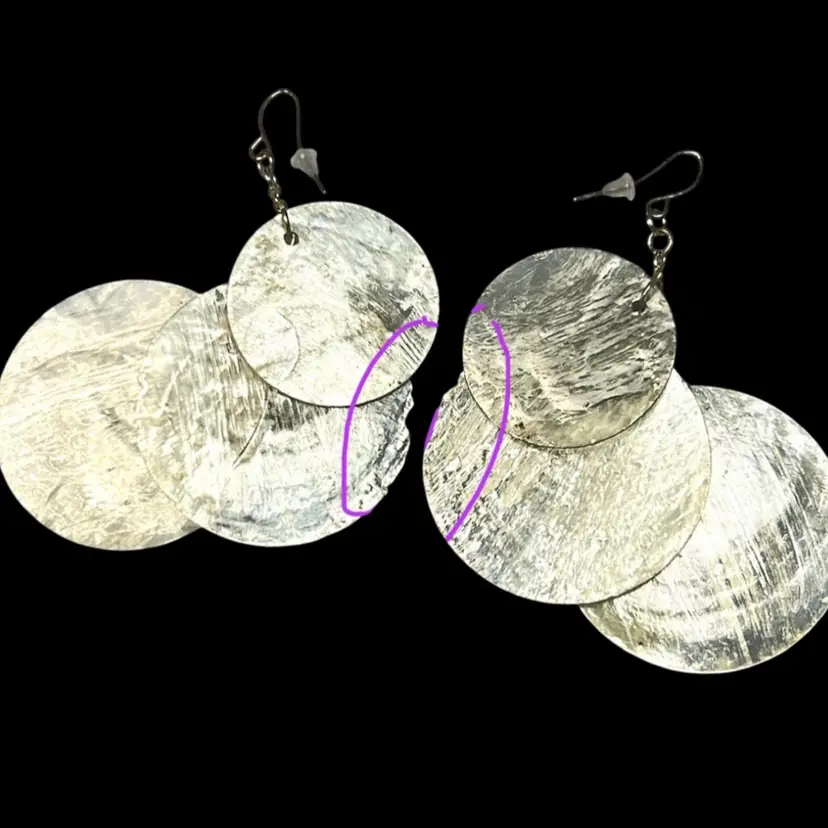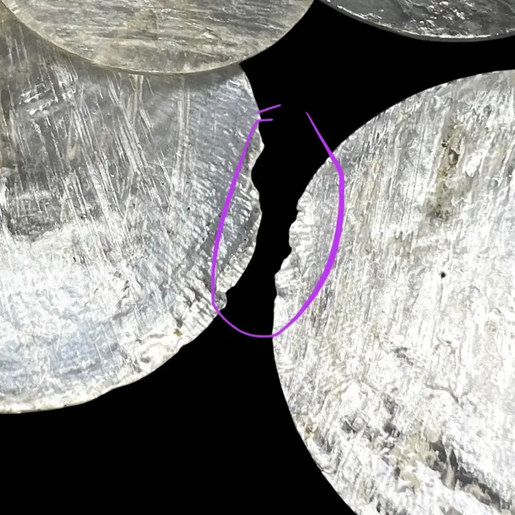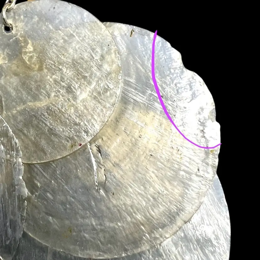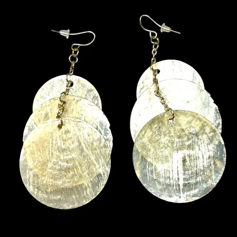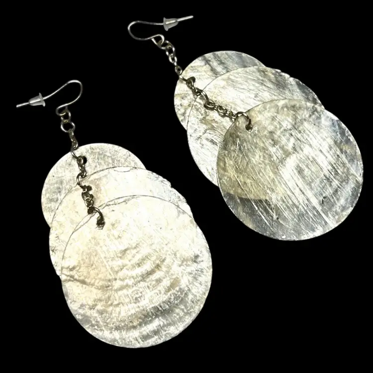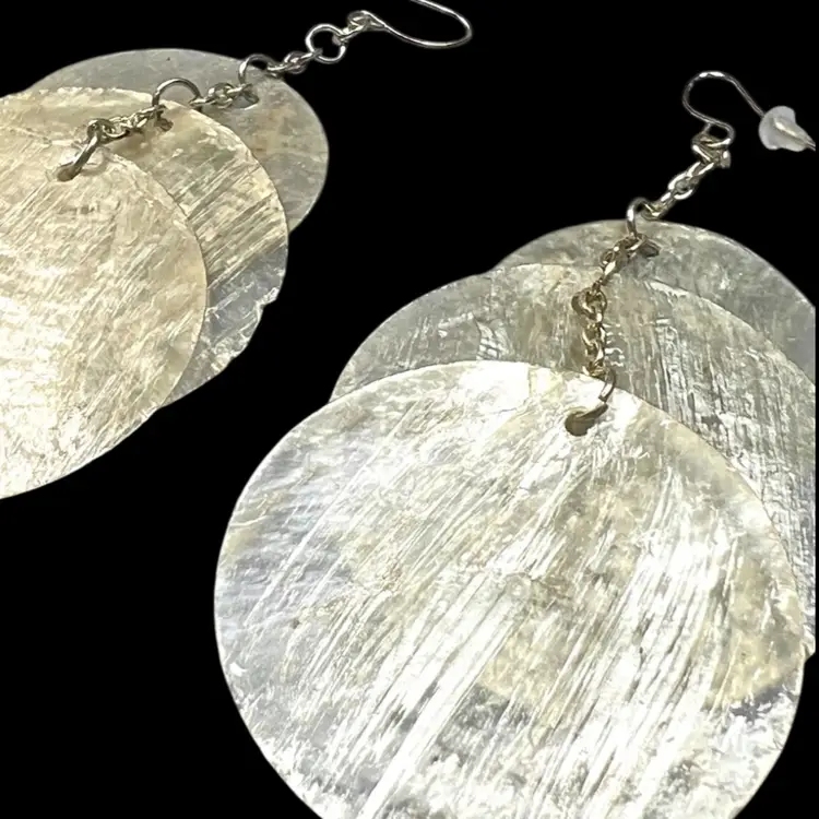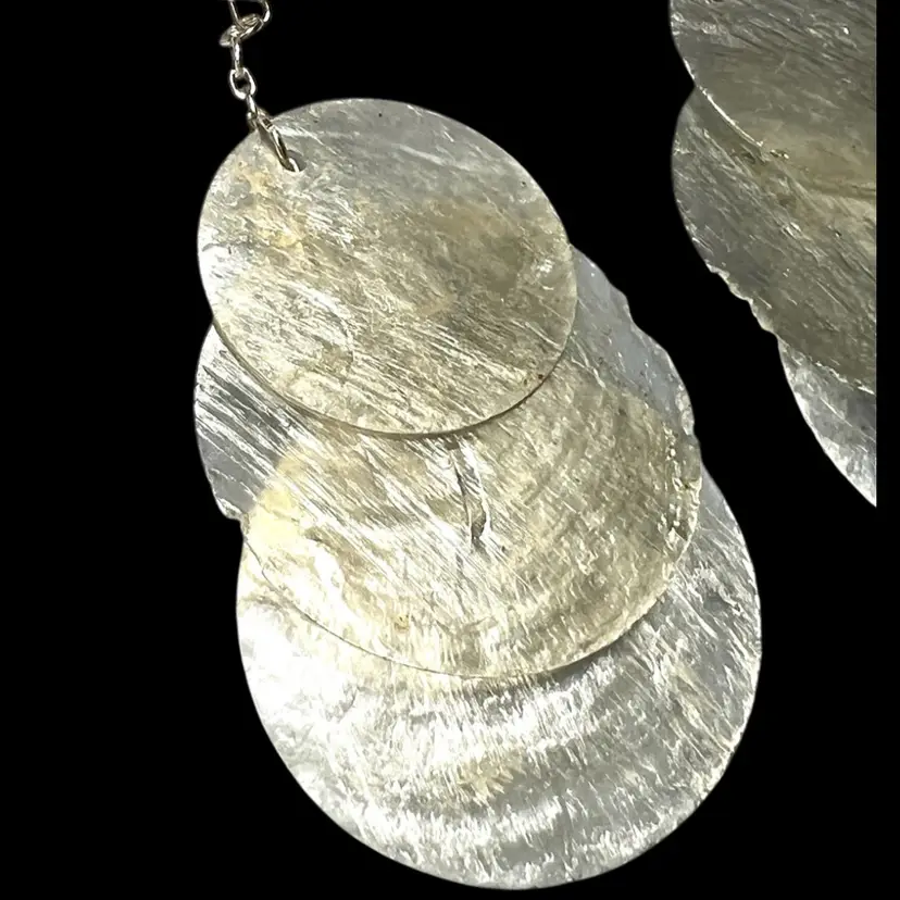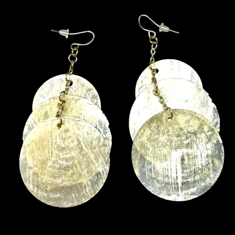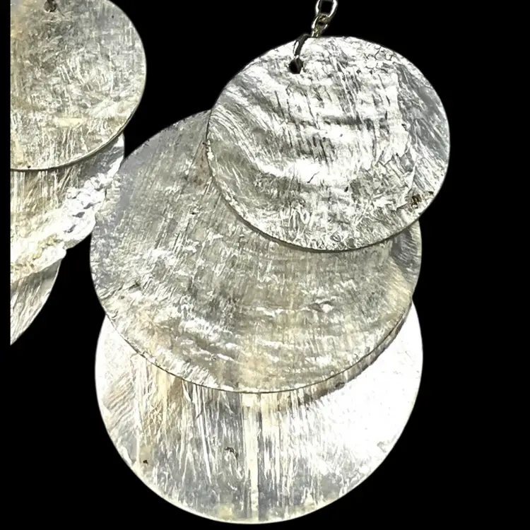Off White Silvery Shiny Capiz Shell Chandelier Earrings. Shells are thin & translucent. Sizes: 1-1/8” and two 1-1/2”. Hardware Is Silver-Tone. Drop length 3-1/4” Weighs: Lightweight < 1 ounce Condition: Middle shell of both earrings have little nips off the inside edges- please see the two photos with circled areas in purple. Right earring has a nipped off edge on outer edge- please see last photo.