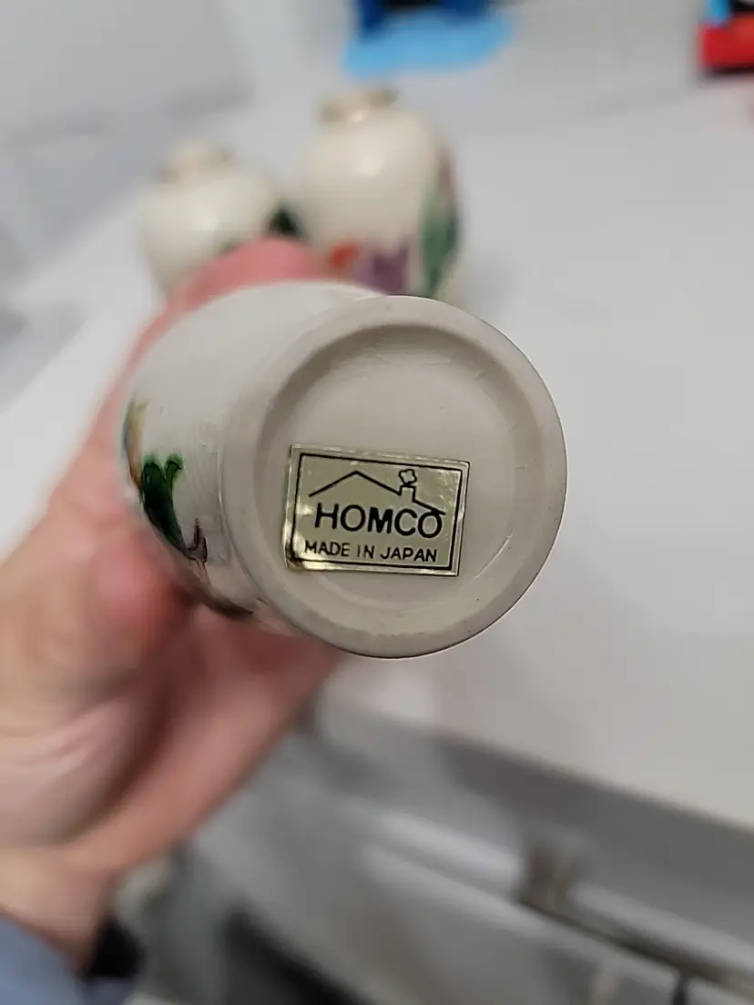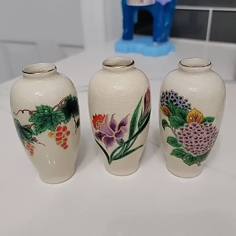 This Homco bud vase set includes 3 vintage pieces, each featuring a crackle ceramic style with hand painted floral design. The gold trim and creme tones add a classic touch, perfect for any room.• Set of 3 Homco bud vases • Vintage style • Features crackle floral design • Gold trim detailing • Creme toned color.... Estimated production date of 1958-1972 based on the gold tag.