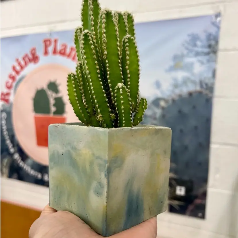 Hand poured concrete planter using green and blue dye for color. Drainage included.