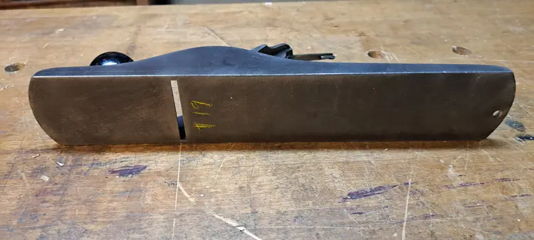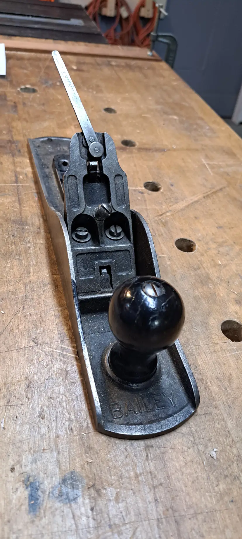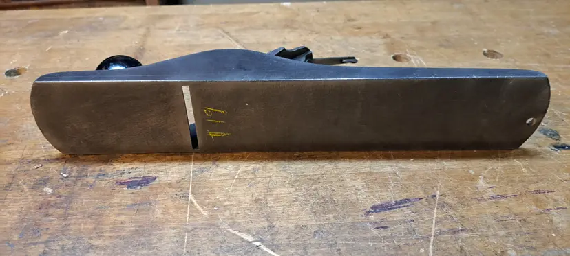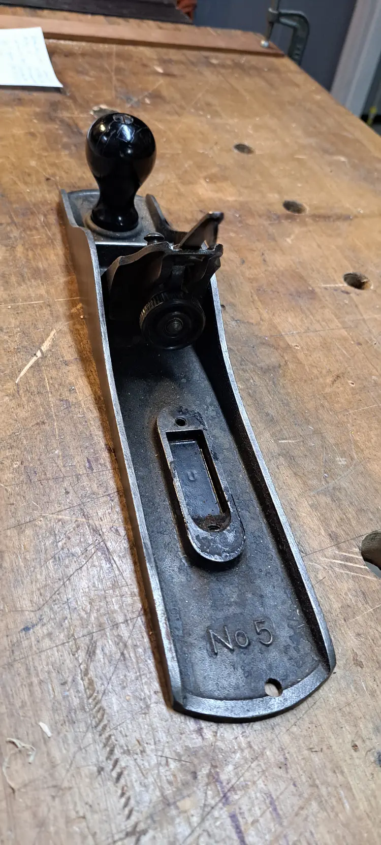 Stanley Bailey #5 Type 19 body and frog that someone tried to make a Type 17 out of by using a Type 17 adjuster wheel and painting the knob black, I robbed the tote of it, it was broken in several places, missing the horn and fixed with epoxy, painted black. yeah, it was a mess, but works great on my #7 scrub plane. Oh yeah, it has a hang hole in the heal, I hate when people do that! I was going to make a scrub out of it out of some random parts I have here, but I have a couple other jack planes that are complete, but just random parts, so I will use one of them.