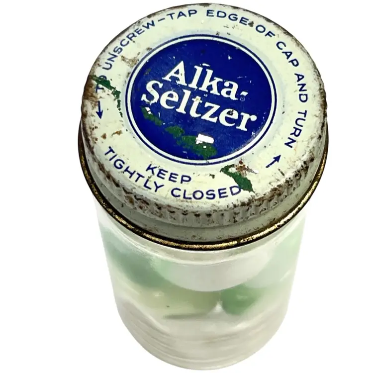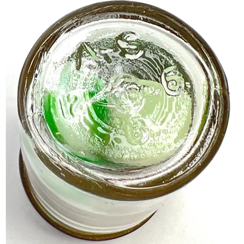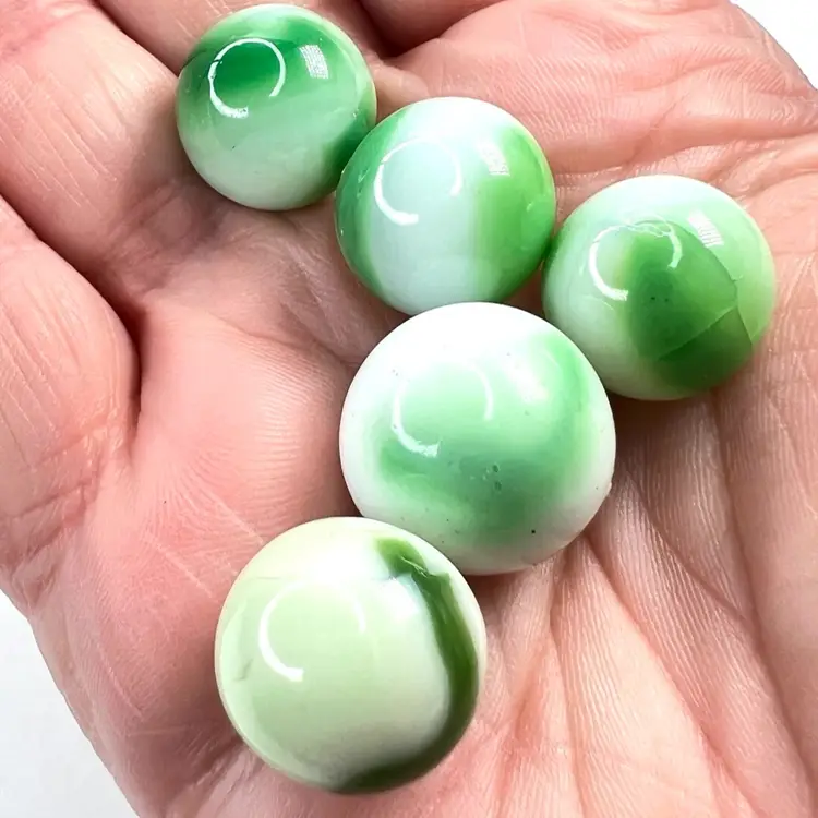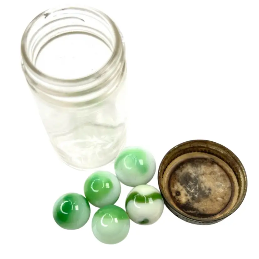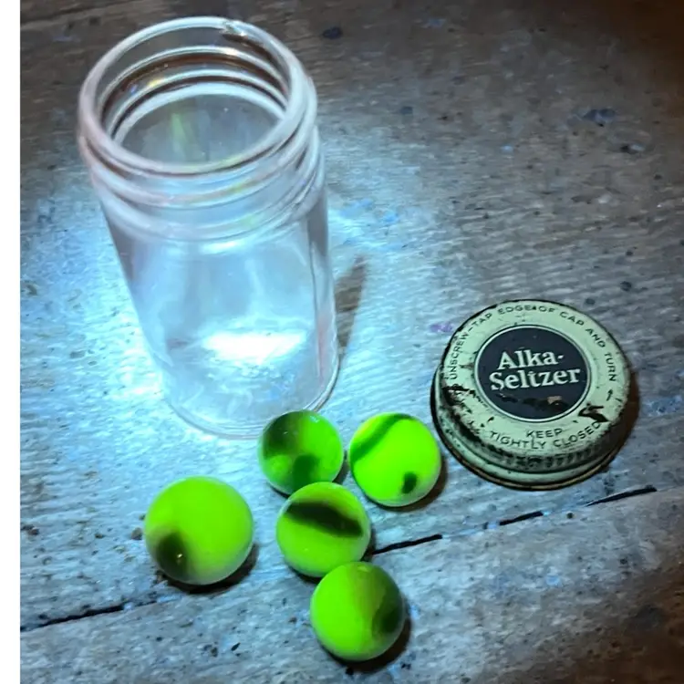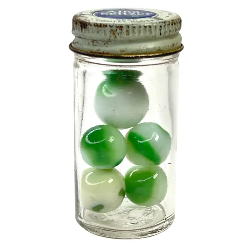 Beautiful shiny green & white swirled marbles. ALL are uranium and glow brightly under UV blacklight. Variety of sizes: 3 are 1/2” 1 is 5/8” 1 is 3/4” The marbles come in a nice vintage Alka-Seltzer glass jar. Marked on bottom with “A-S”, logo and numbers. Jar is 2-5/8” H x 1-1/4” Diameter Condition: Jar- No chips or cracks; Marbles- Minimal wear/cracking, no chips. Weighs 3 ounces.