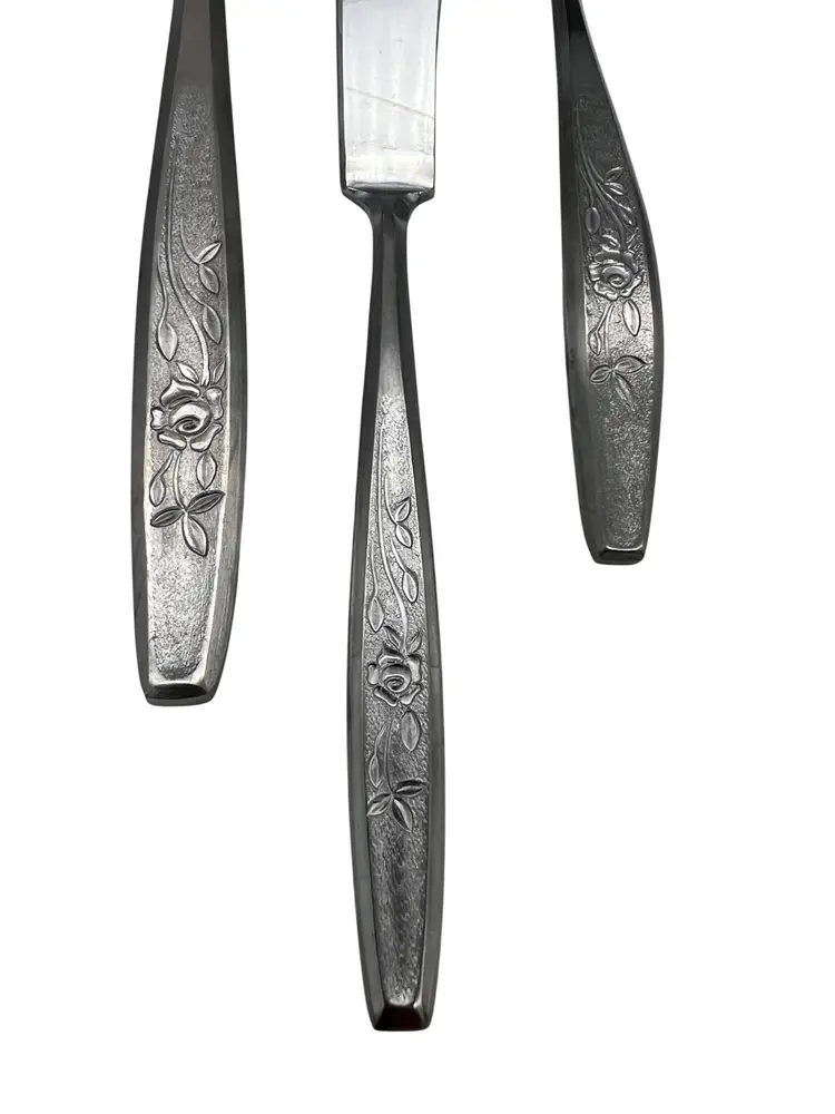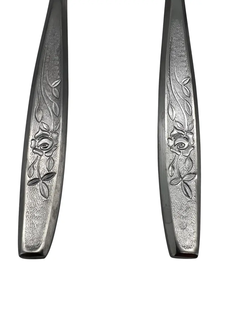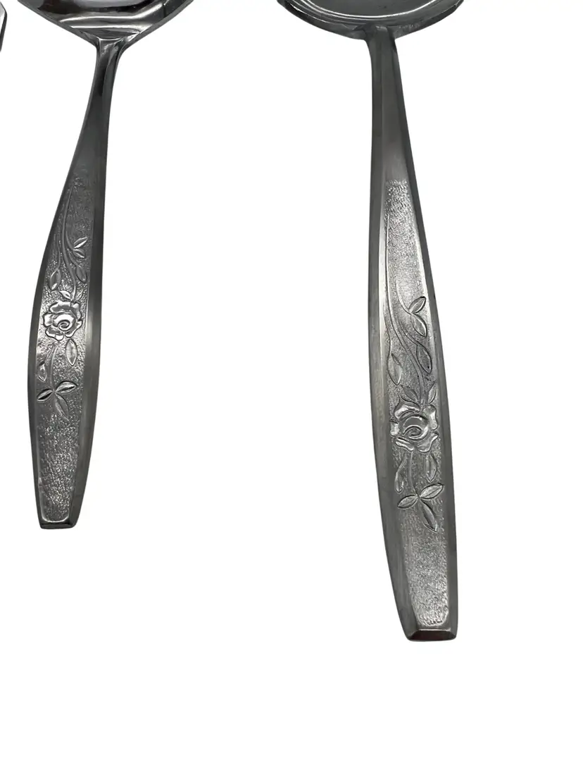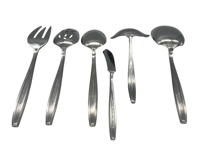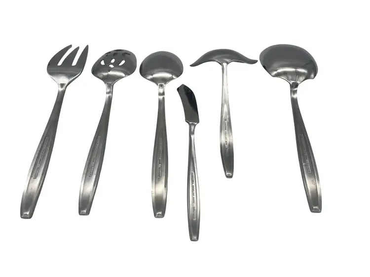 This vintage 6-piece serving set from Hull in the discontinued Viscount pattern has a charming floral design on the handles. Crafted of durable stainless steel, perfect for hosting dinners or adding a vintage touch to your dining table. The set includes essential serving utensils including cold meat fork, slotted spoon, serving spoon, master butter knife, gravy ladle, and a casserole spoon.