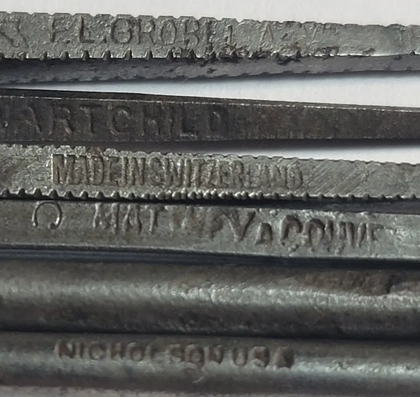 Up for bid are 6 of the finest precision needle files you can find anywhere. They are all classified as watchmaker encasement files. The names on the files are from some of the finest Swiss, German , and French tool makers. One file made by Vallorbe is a flat triangle file, 2 files, one by F.L. Grobet and one by Vautier have round tapered file on one end and a burnishing tool on the other end. One just says made in France, but you can tell it is very high quality. Most of Nicholson small precision files were made in Germany or Switzerland. Although use by watchmakers and Jewelers, they can be used by anyone needing very fine file work.