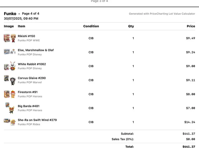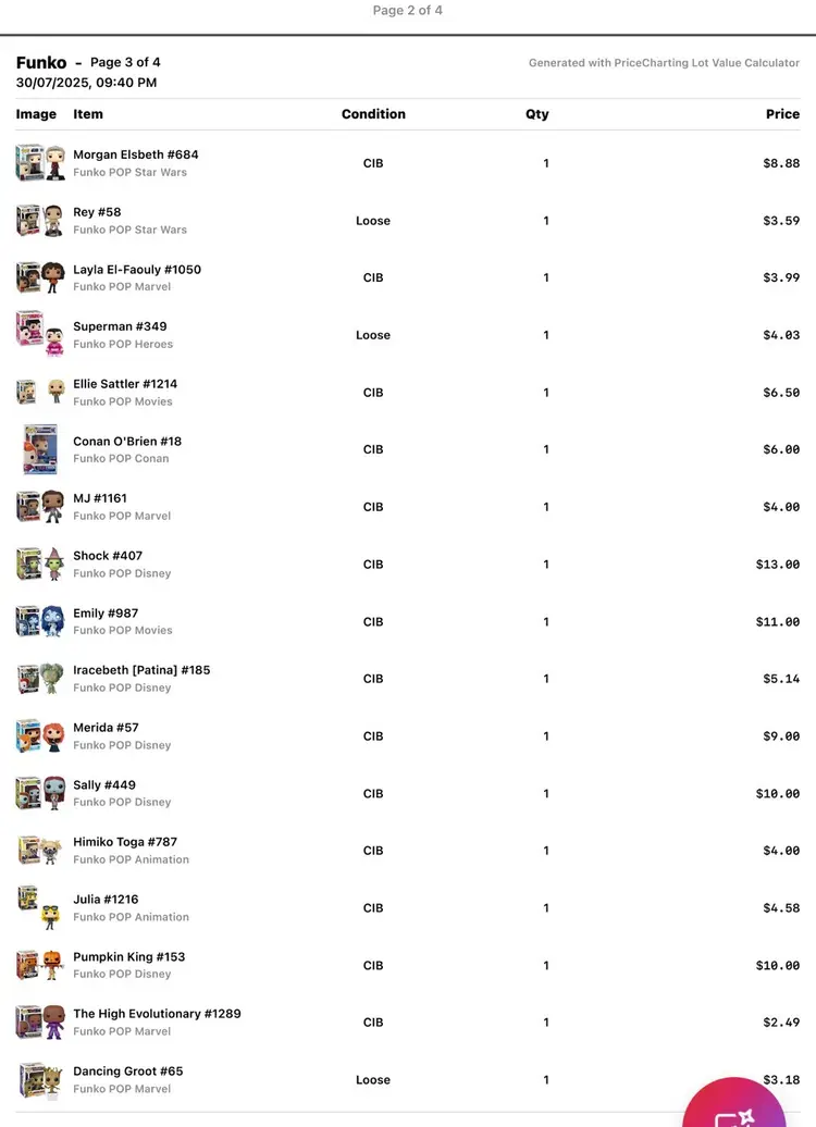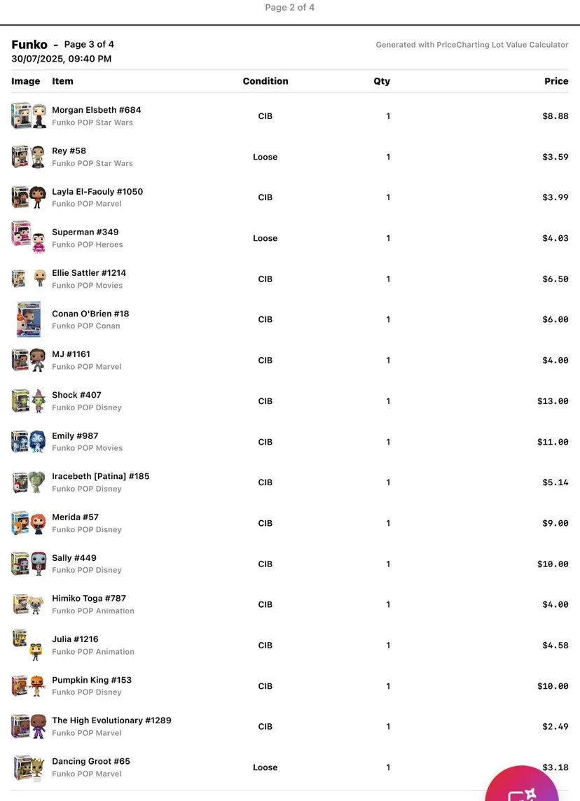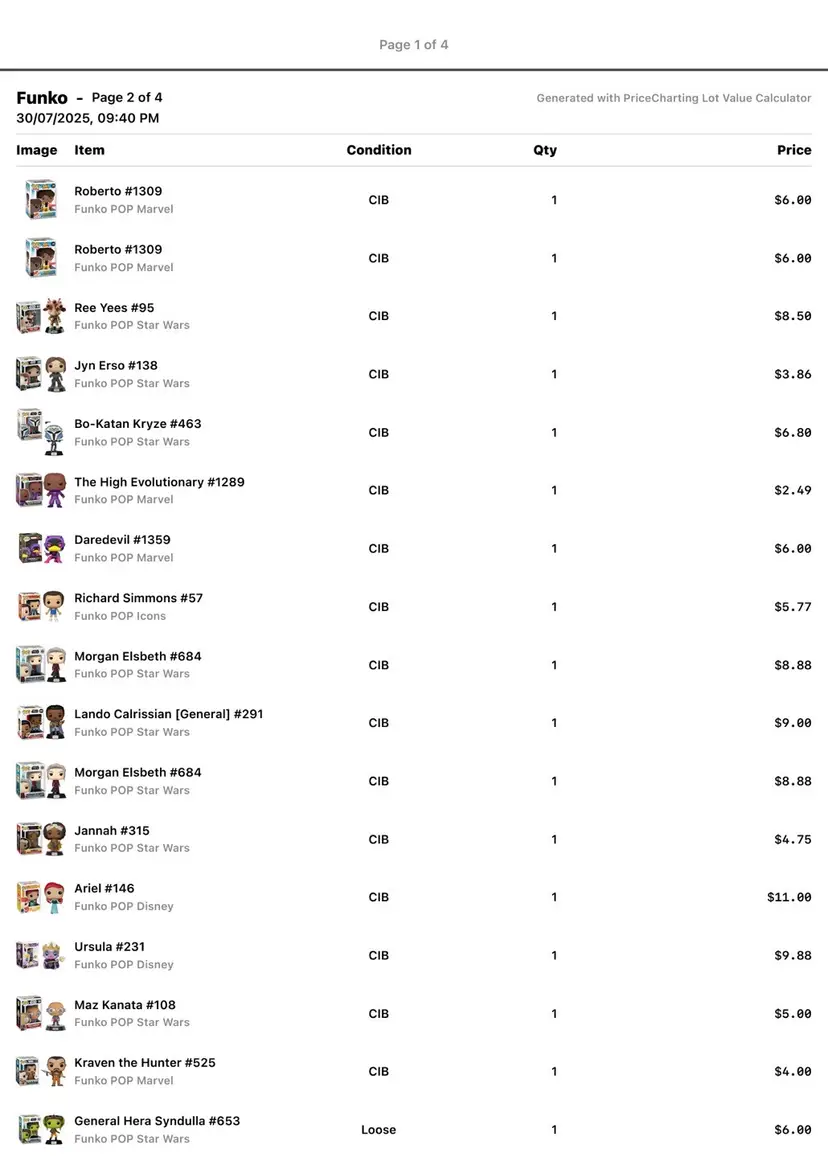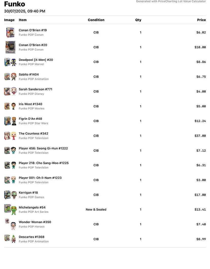 I have a random collection to sell. They’re listed in the list in screenshot, plus the following: 2 more Descartes $8.99 $8.99; Justin Fields #237 football $12; locked in Leslie parks and recreation $15; Rodimus and Galvatron transformers $25. Total value if nm boxes (minus a few I left as in loose condition) $511.35. These are not all in nm condition. Most have at least one damaged corner, even if minimal. Some have more damage to the packaging. A few are in the plastic cases. I think it’s 60 Funkos in total.