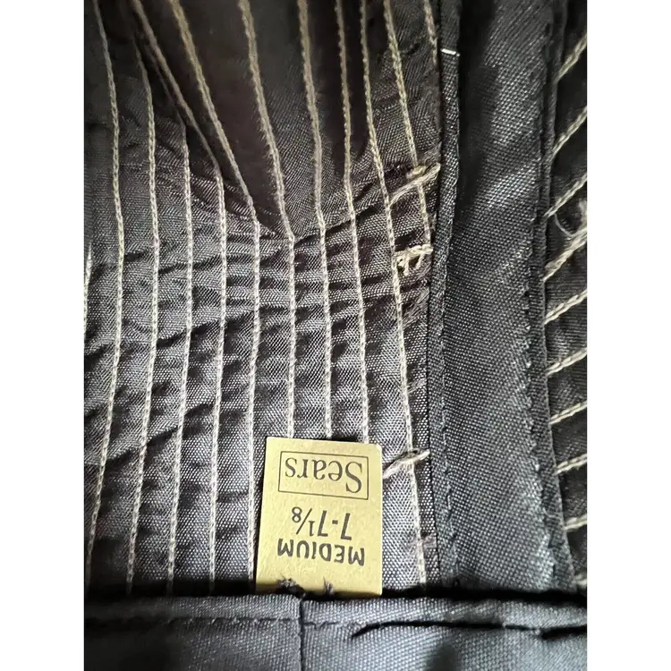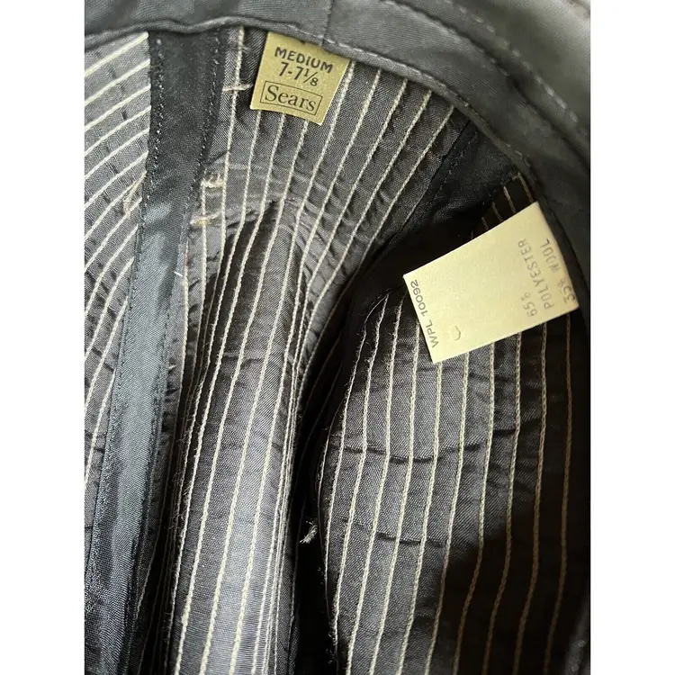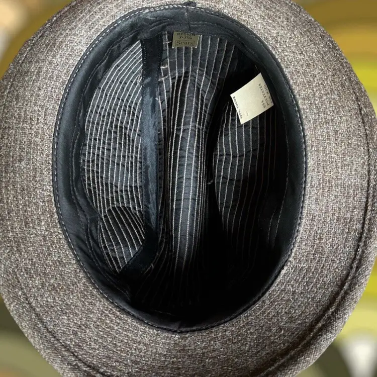 Brand: Sears Color: Gray Decade: 1970s Style: Fedora Adjustment Type: Fitted Look: Tailored Occasion: Everyday Material: Tweed Original/Reproduction: Original Size: 7 1/8