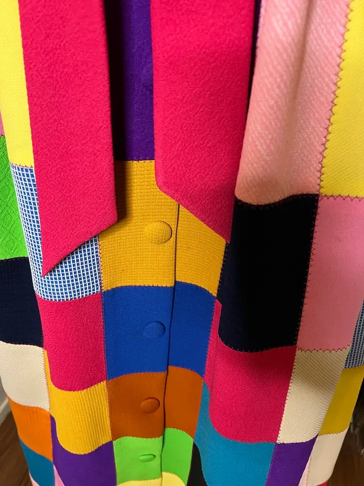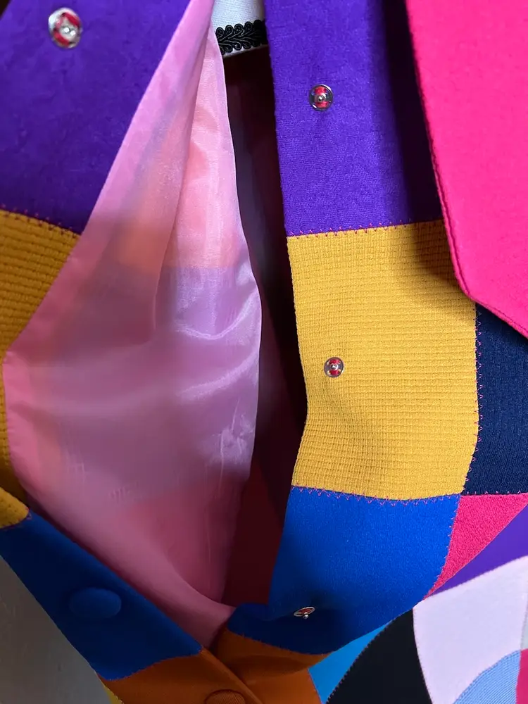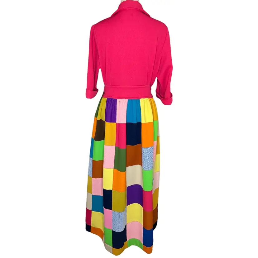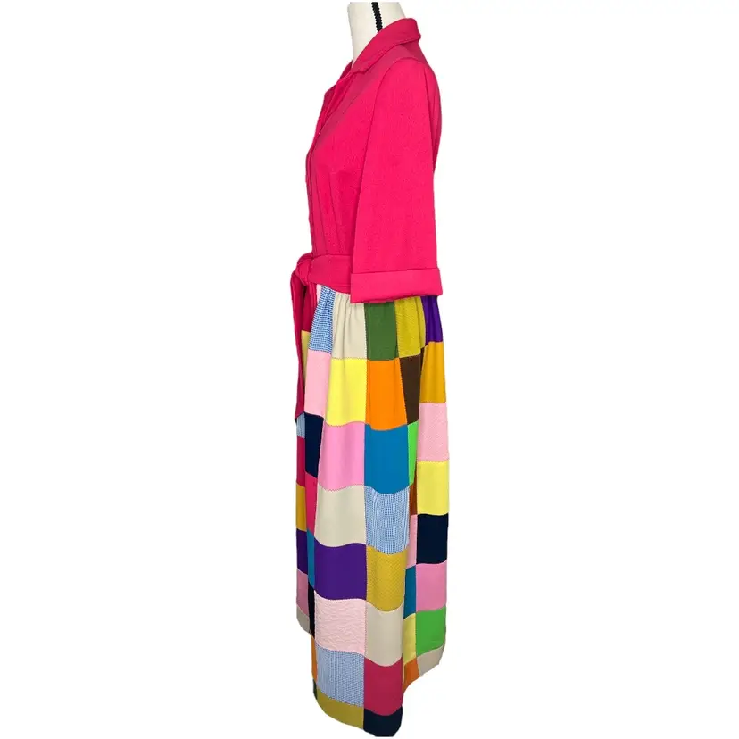 70’s Vintage Patchwork Double Knit Groovy Pink Multi Covered Button Long Dress Groovy maxi dress with fully lined patchwork skirt and fuchsia pink top. Removable tie waist belt, exaggerated fabric button covered front snaps. Skirt is fully lined. Arms can be worn down or rolled up for different looks. One of a kind piece with NO FLAWS! No brand tag present, measures at a Medium/Large Chest:38” Waist:32” Arm length:11” Hip:42” Length:53.5” No flaws, smoke free environment!