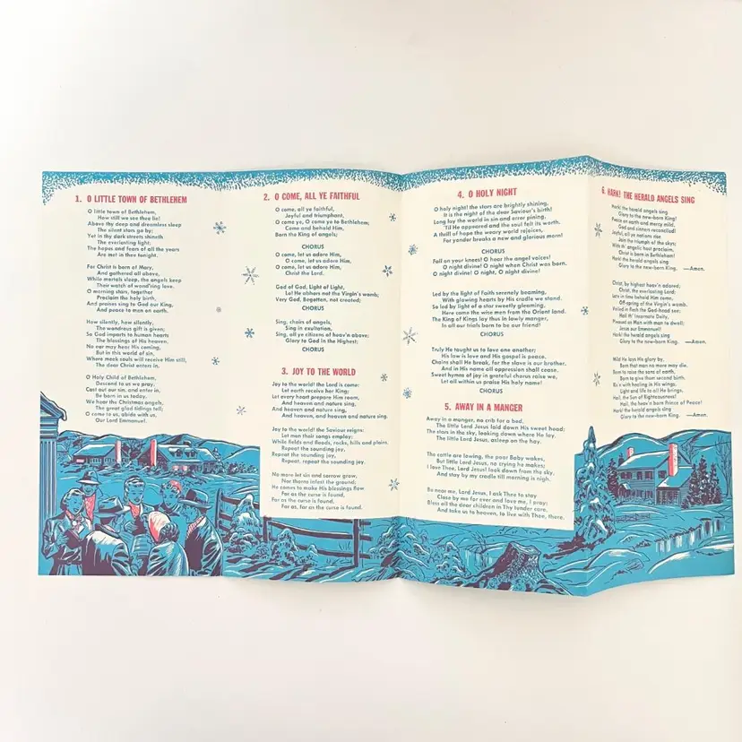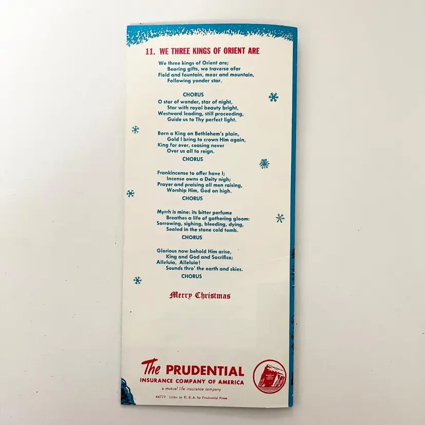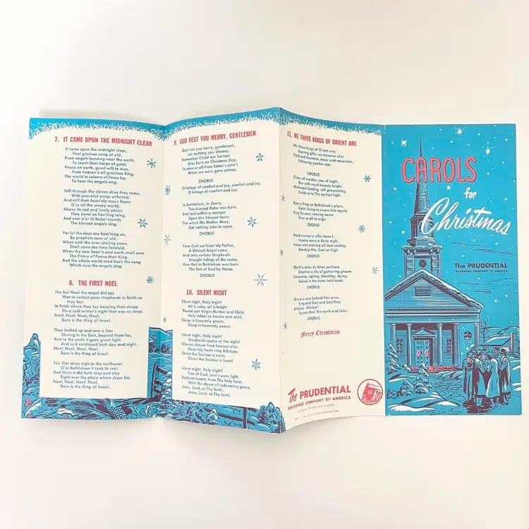 Carols for Christmas Song Book Prudential Insurance Company Vintage 1960s 11 Christmas Carols O Little Town of Bethlehem O Come All Ye Faithful Joy to the World O Holy Night Away in a Manger Hark! The Herald Angels Sing It Came Upon a Midnight Clear The First Noel God Rest You Merry Gentlemen Silent Night We Three Kings of Orient Are 8 Fold-Out Brochures Condition: Wear around the edges and on the corners Measures 9-1/4 inches x 4 inches Packaged in a plastic sleeve inside a rigid envelope Visit my store to see more vintage ephemera, advertising, novelties, gifts, estate sale and yard sale finds https://district.net/u/finderspickerspaper SKU Christmas