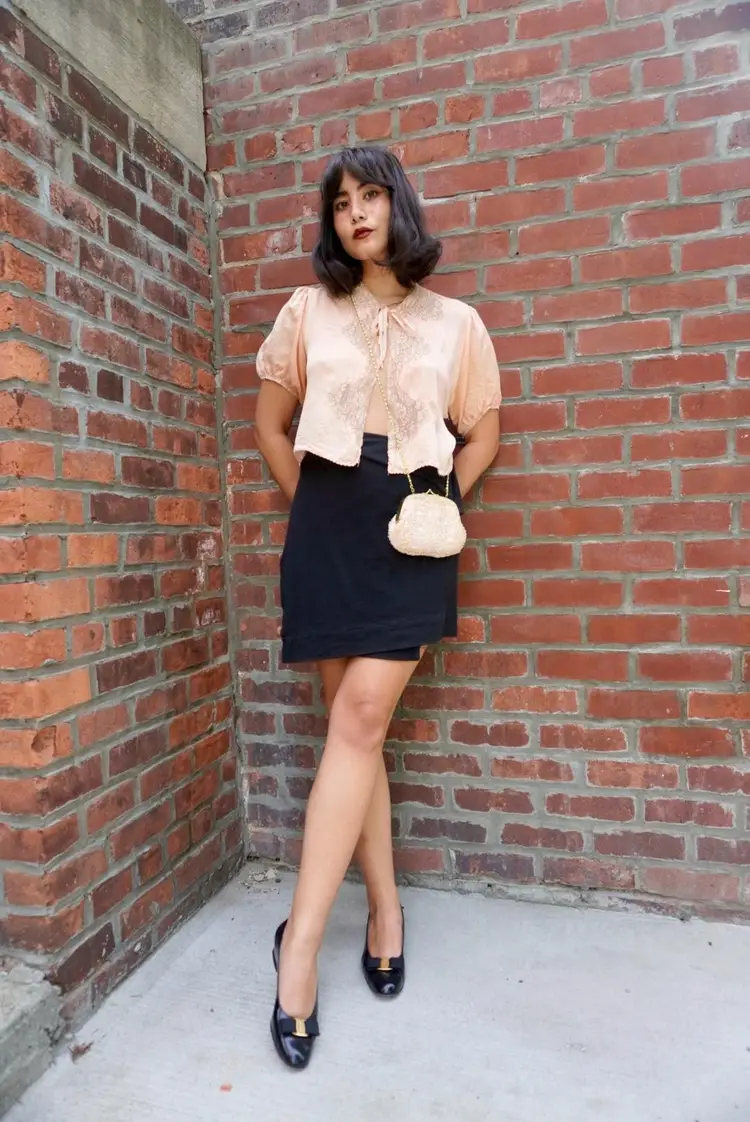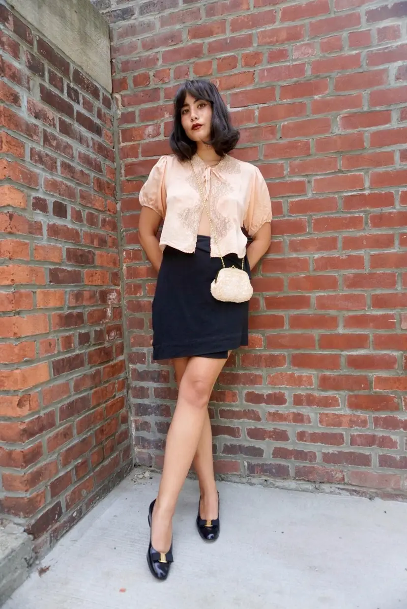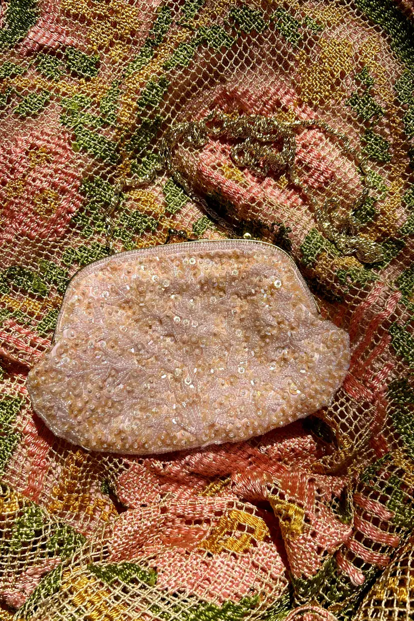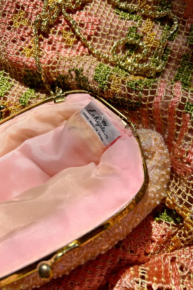 A darling little pouch bag, covered in iridescent beads and sequins. Snap top closure with a hinged metal frame. Gold tone hardware. Long chain strap can be tucked in for the bag to be worn/used as a clutch.