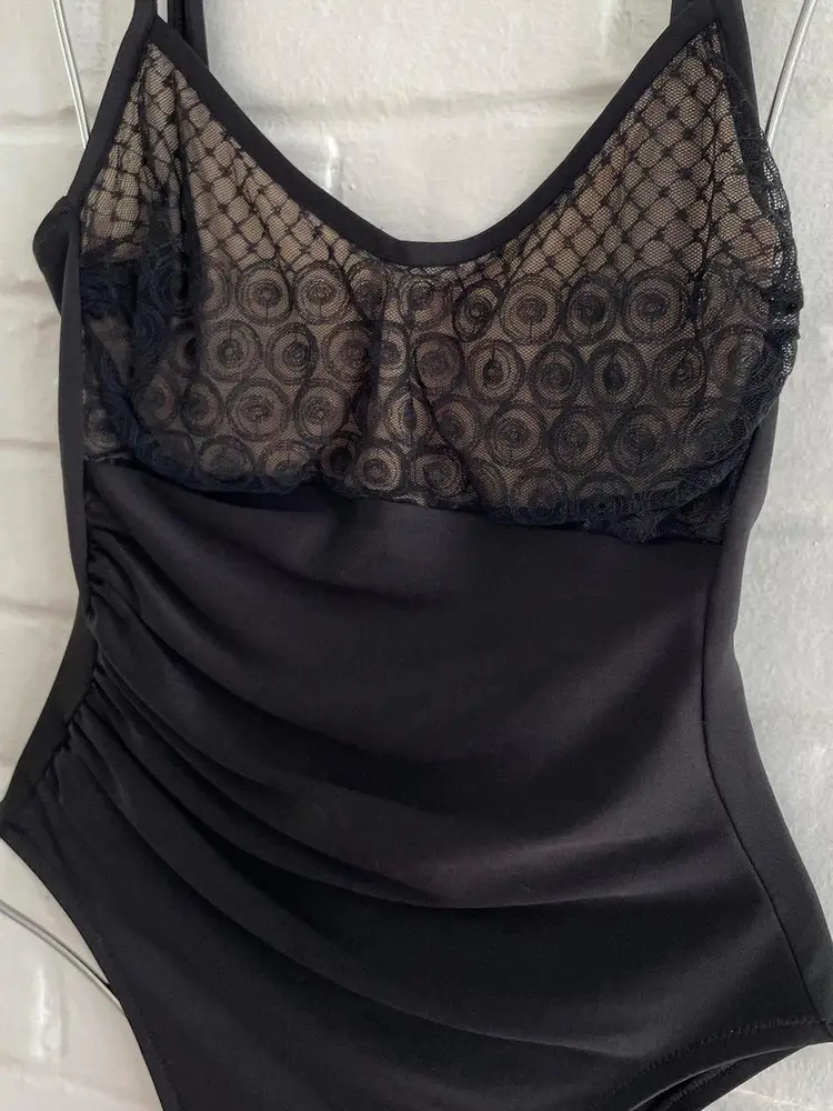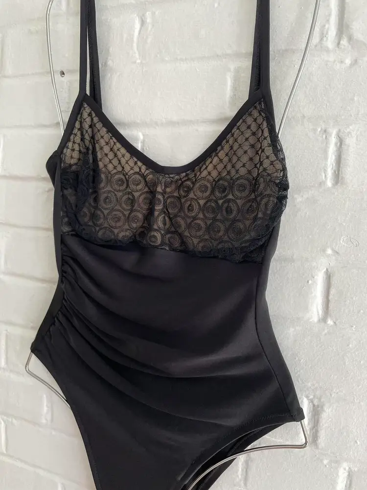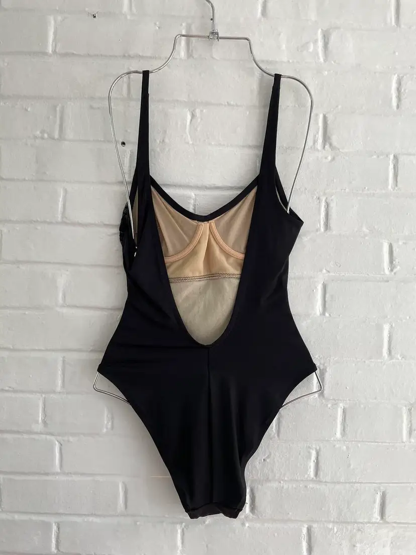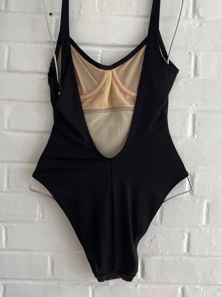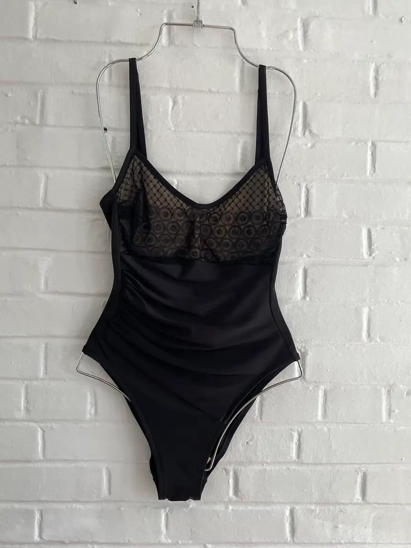 By La Perla. Vintage 90s Italian luxury lingerie designer black one piece swimsuit. With a sheer embroidered mesh panel on the bust. Super flattering. Low scoop cut on the back. Labeled a 44 IT. Ideal for a size medium. In great condition