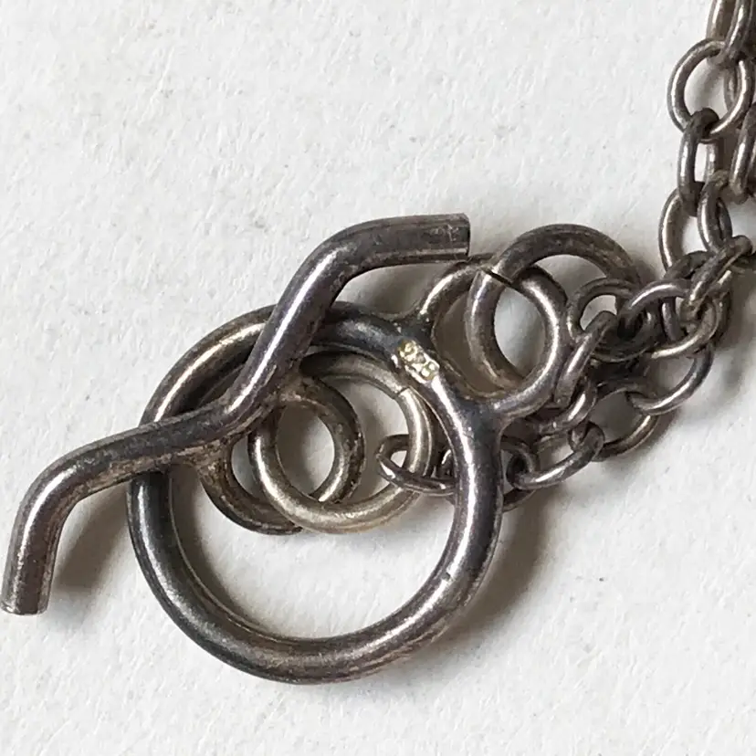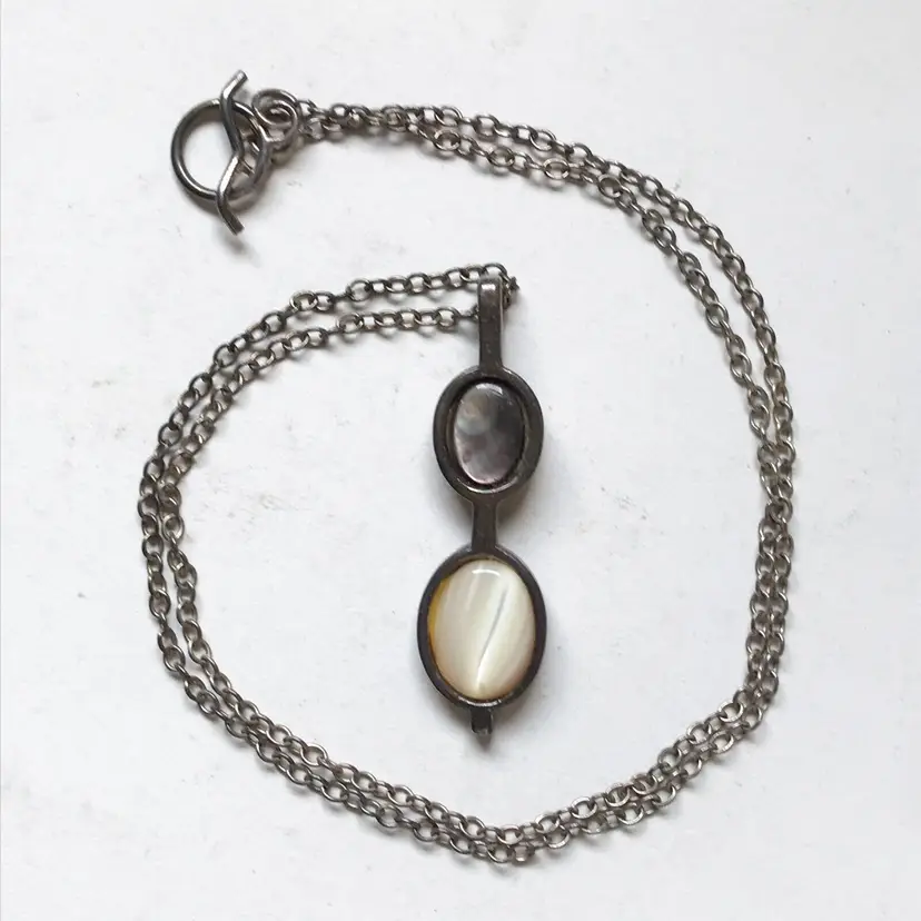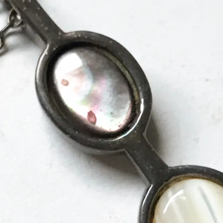 Necklace features a pendant with two cabochons that look to be mother of pearl and abalone. Marked "925" on pendant and necklace.