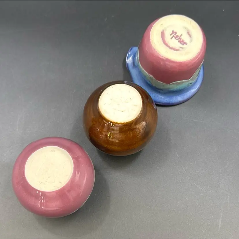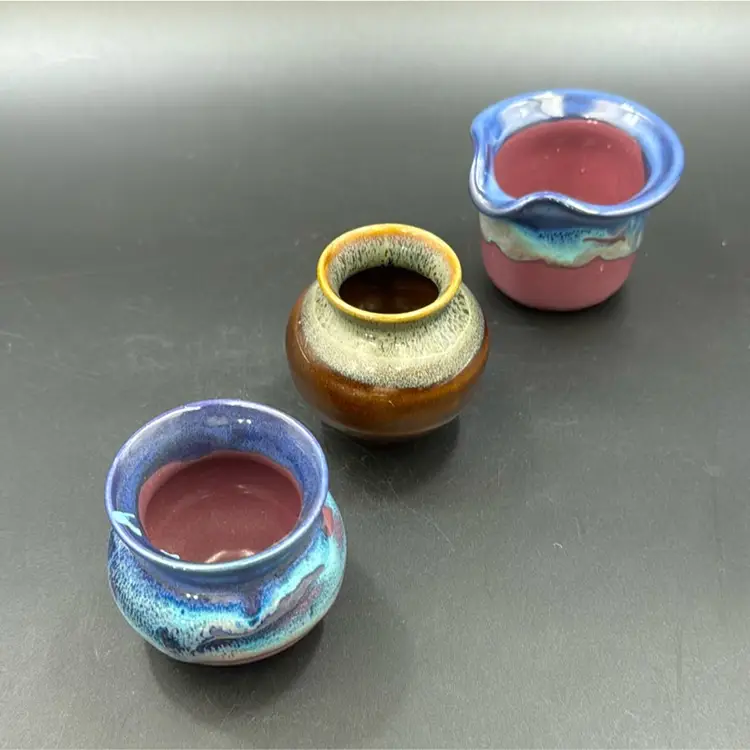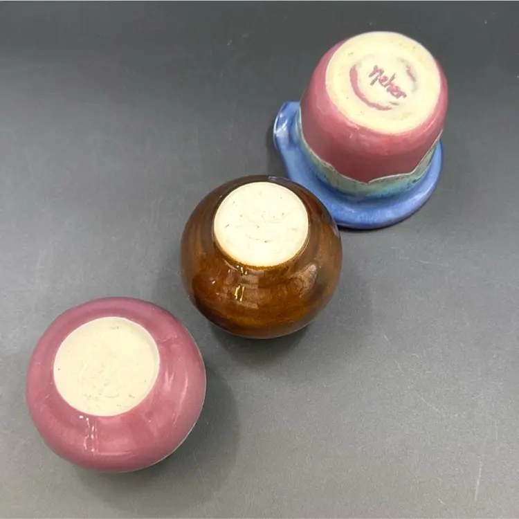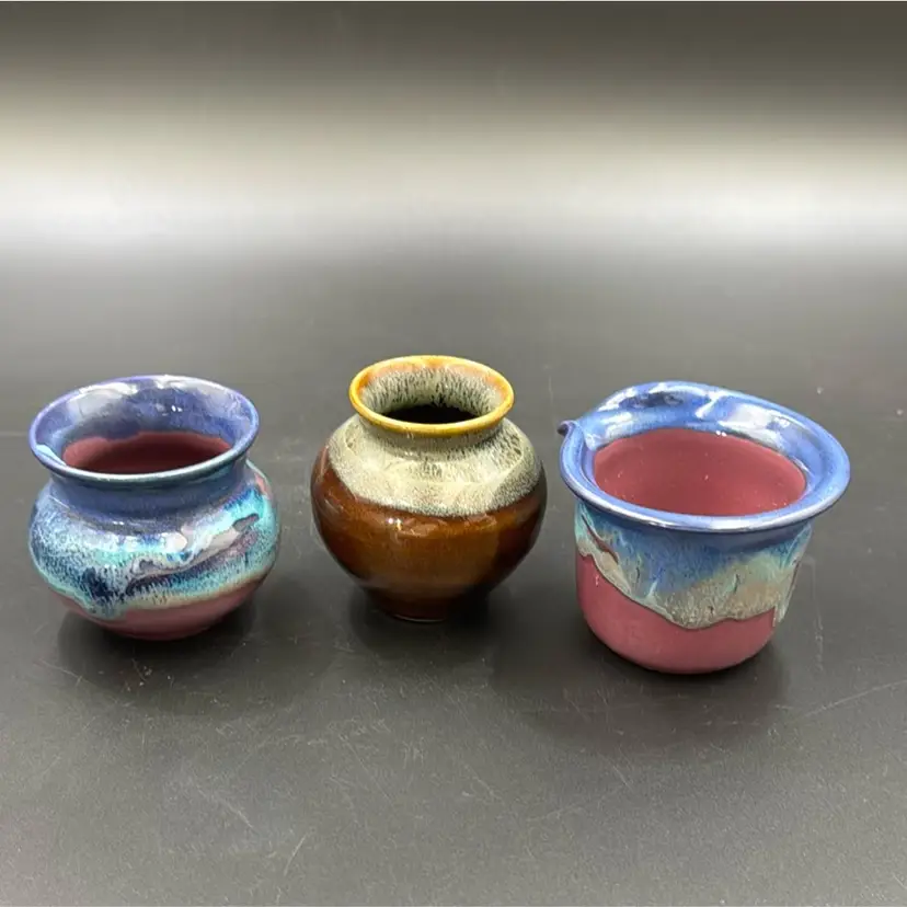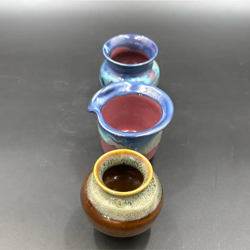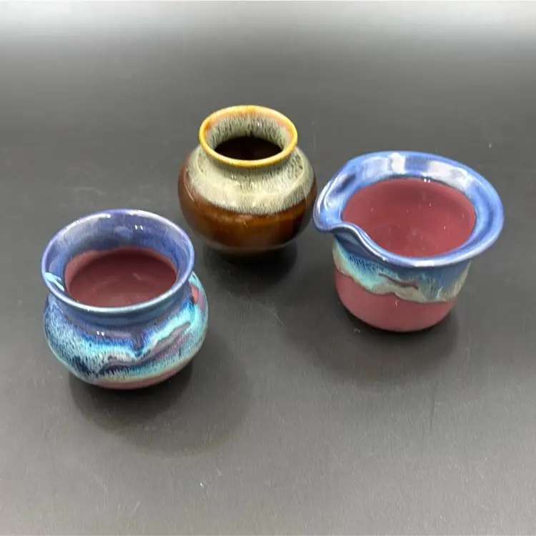 Brown vase is 33/4”T 3”W blue and purple vase or sugar dish21/2” 21/2”W has a splash of turquoise glaze on the lip of the vase. Purple and blue creamer. 21/4”T 3”W all three pieces are signed and no chips, cracks or breaks on any of them. They are smalls