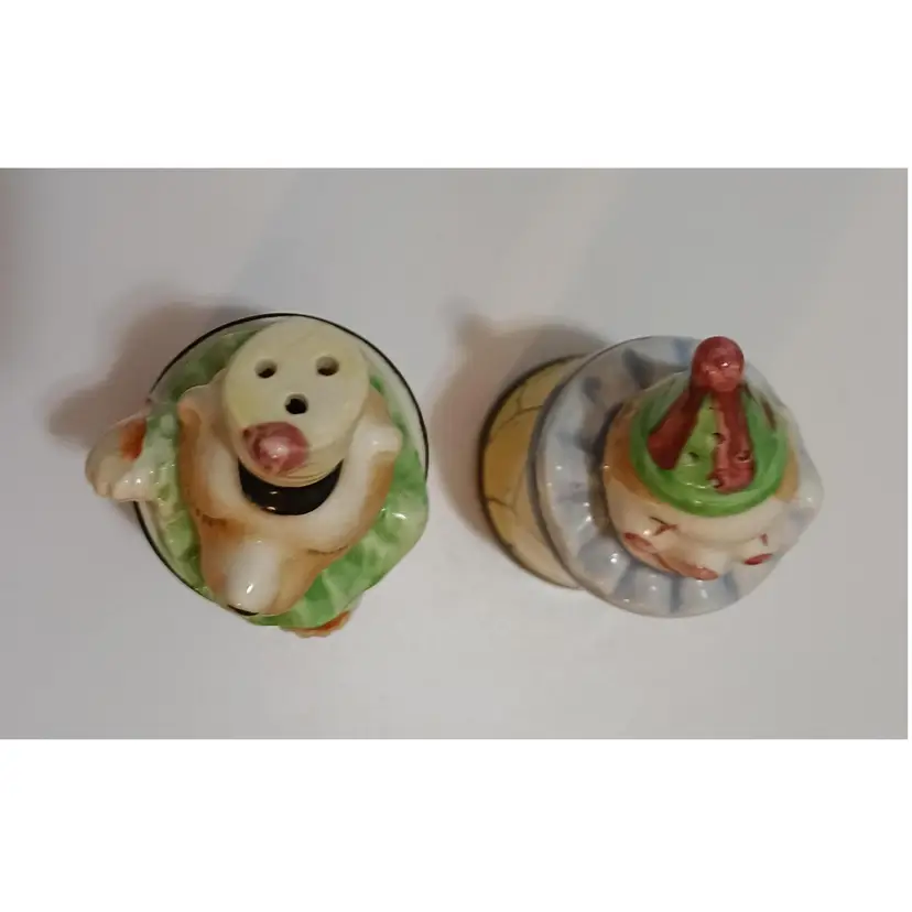 Adorable Vintage Circus Act Salt N Pepper Shakers; Cheerful and Sweet with no chips or cracks; a slight bit of crazing but hardly noticeable. These are so cute! 4" Tall x 2" Wide.