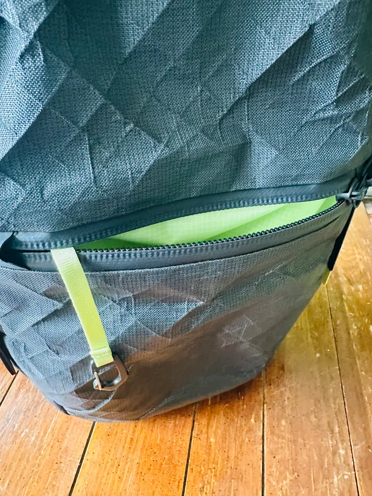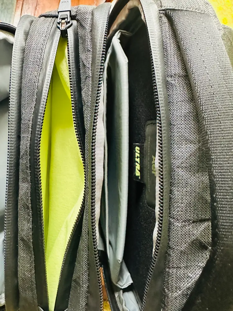 My favorite features of this bag: very comfortable straps and back panel, I like the look of the Ultra material and it held up really great on rainy days. I walk a half hour to work and nothing inside got wet even in a downpour. I also love the pop of color for many of the inside pockets you get with the Ultra version, and those cute green pockets tend to be really soft too. The sunglasses pocket up top for example, nice and soft and super handy for my glasses and a protein bar. The laptop protection is great. Really smooth zippers despite water resistant coating. I also liked the D ring above the water bottle pocket and used it all the time, whether to secure a water bottle or umbrella or to clip other things. I didn’t travel with it, but the luggage passthrough is horizontal to keep the bag upright which is a nice touch.