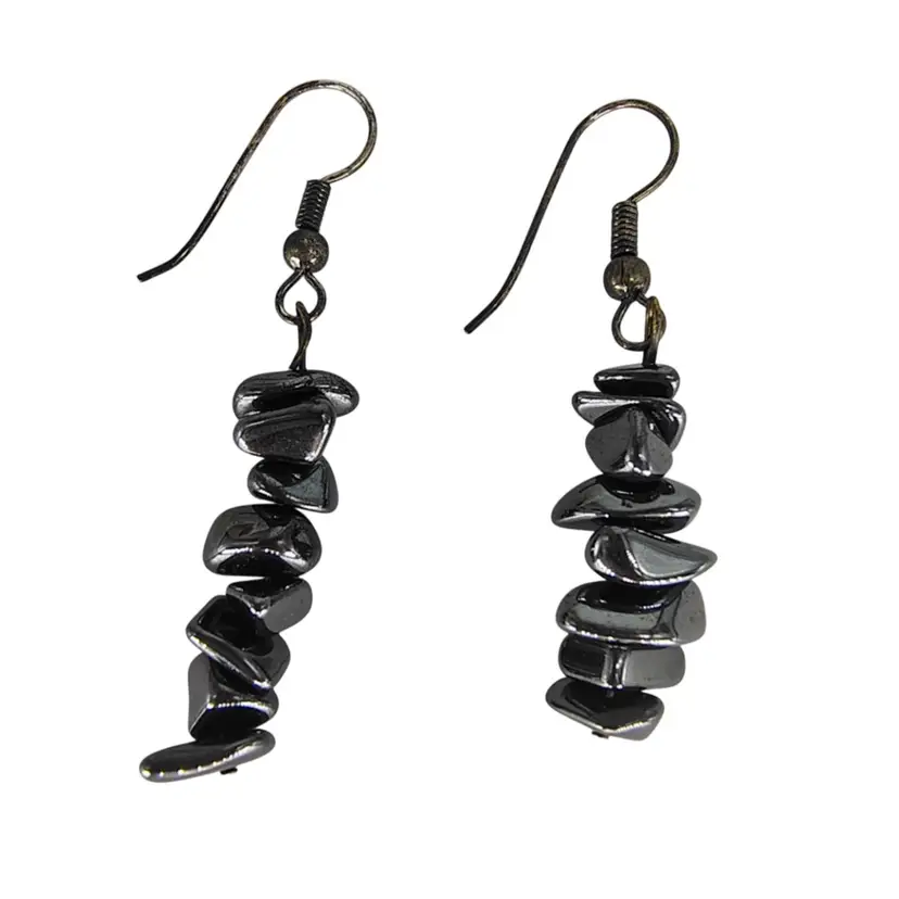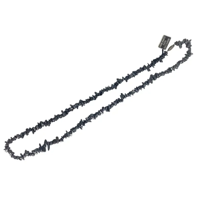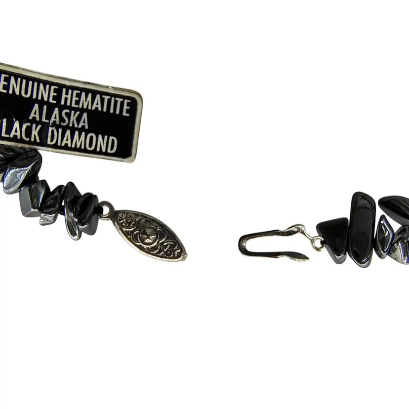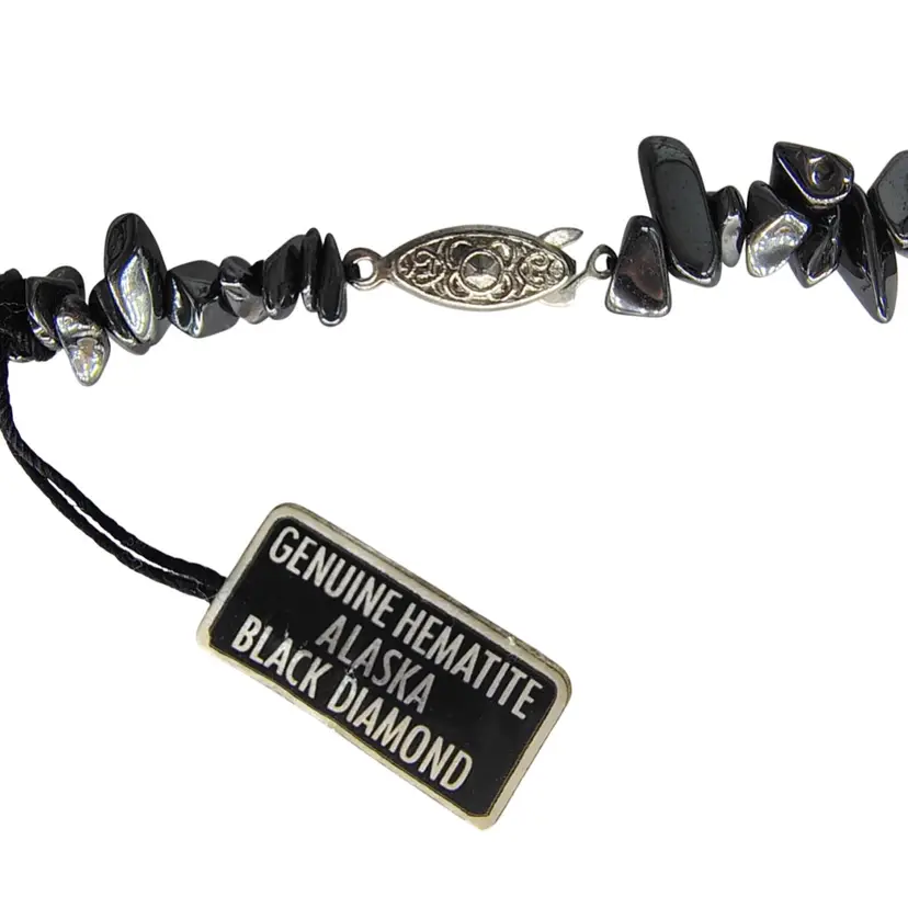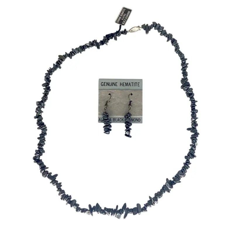 Brand/Label: Alaska Black Diamond Material: Genuine hematite stone chips Color: Metallic dark gray / gunmetal tone Necklace Length: 24 inches Earrings Length: 1 inch (pierced hooks) Clasp Type: Box clasp Condition: Excellent — no damage; both pieces retain original hang tag and display card