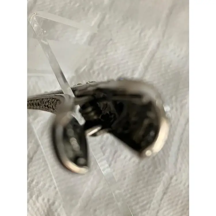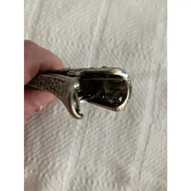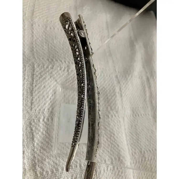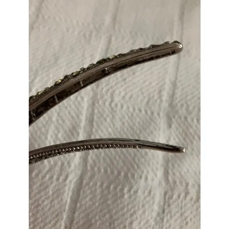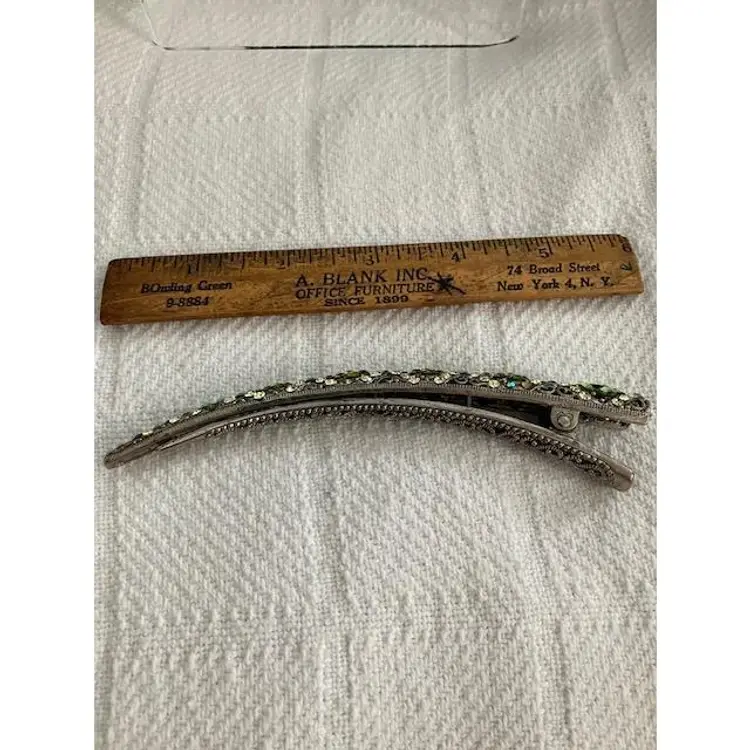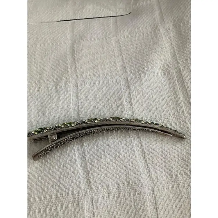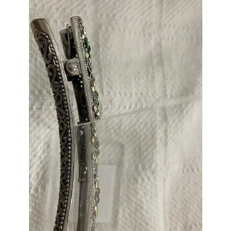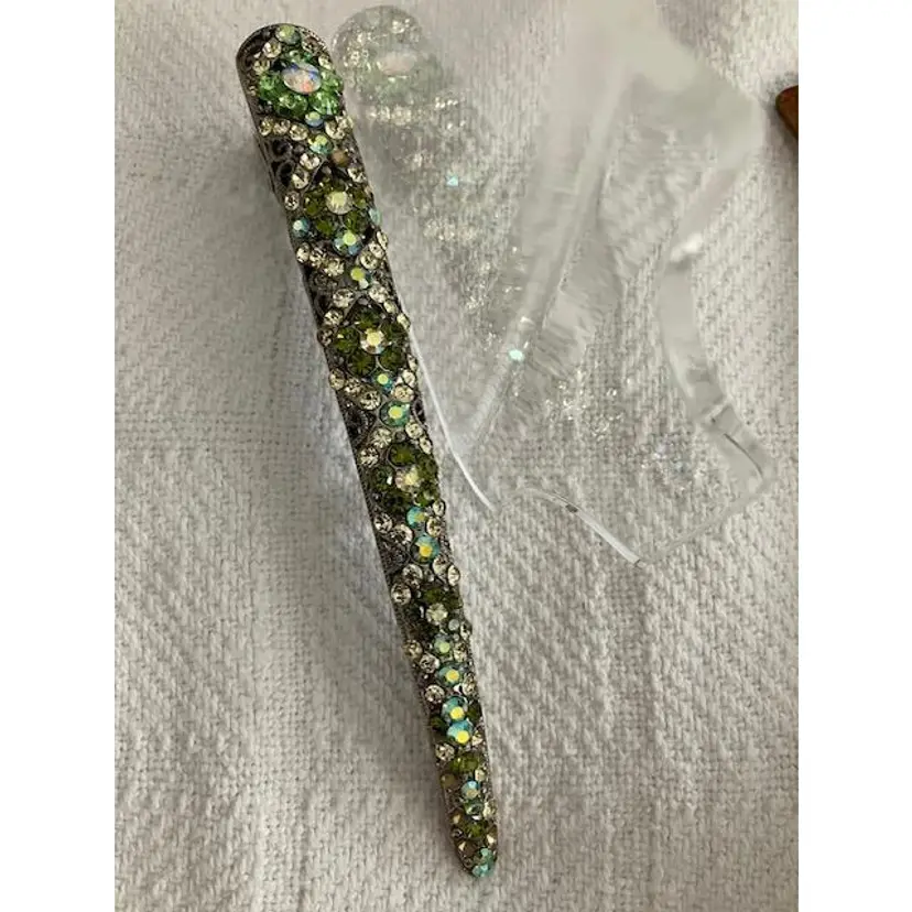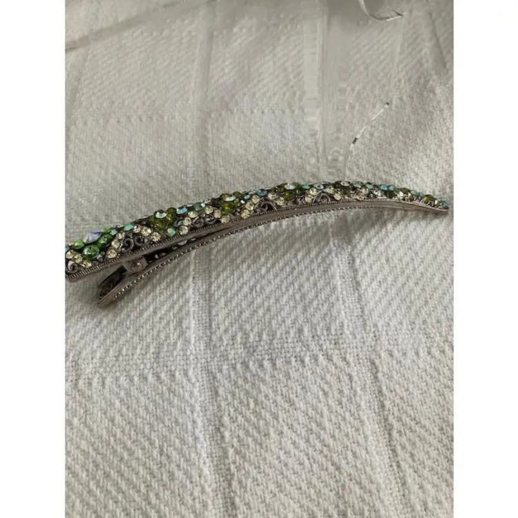 Sliver tone with green & white rhinestones. Many are Aurora Borealis. Back has great filigree design. 5 1/4" x 1". Weighs 44.70 grams. It has a good bit of tarnish on the inside.