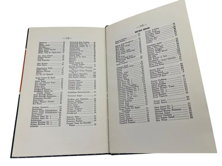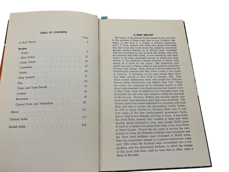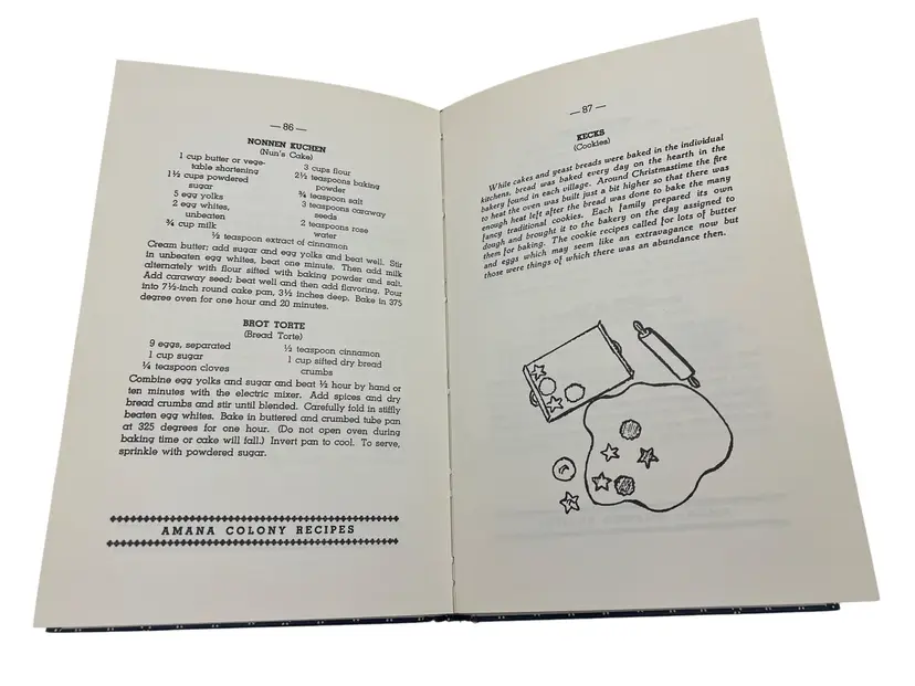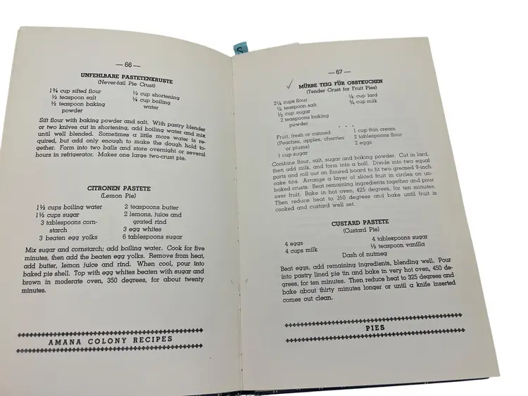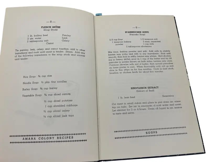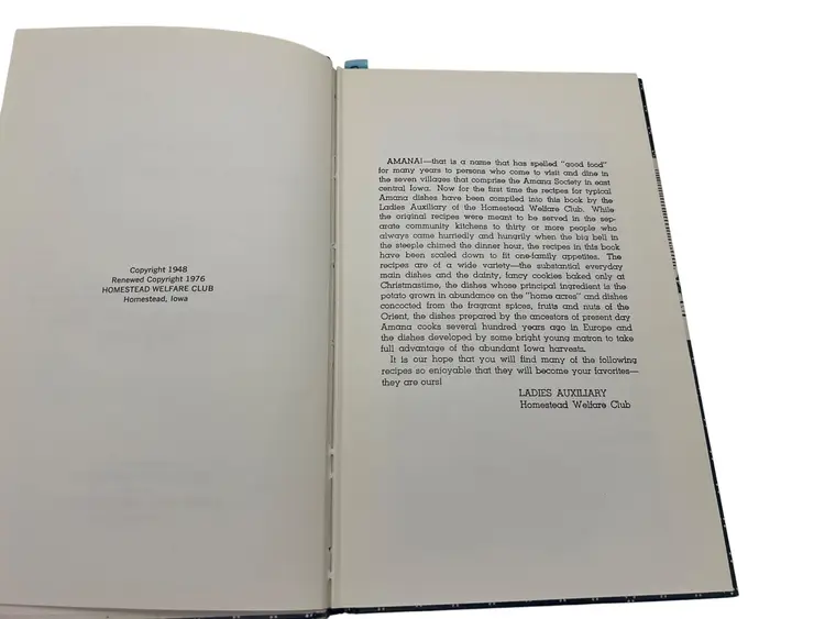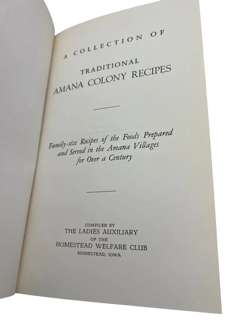 Classic community cookbook from the Amana Colonies in Iowa. 1976 renewed edition of the 1948 original, compiled by the Ladies Auxiliary of the Homestead Welfare Club. Hardcover with patterned boards, 120 pages, illustrated. Recipe titles appear in German with English beneath, and the book includes German and English indexes. Family-size recipes reflecting the Amana Colonies’ German-American food traditions—soups, mains, vegetables, pies, cakes, cookies, beverages, and canning. Clean, vintage reference and display piece for regional and ethnic cookbook collectors.