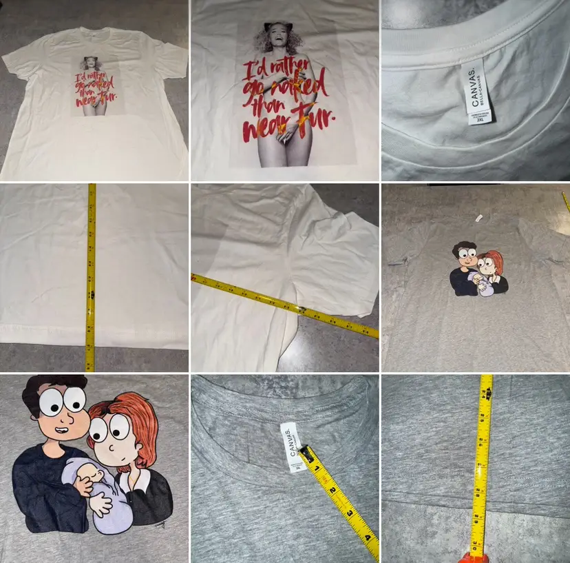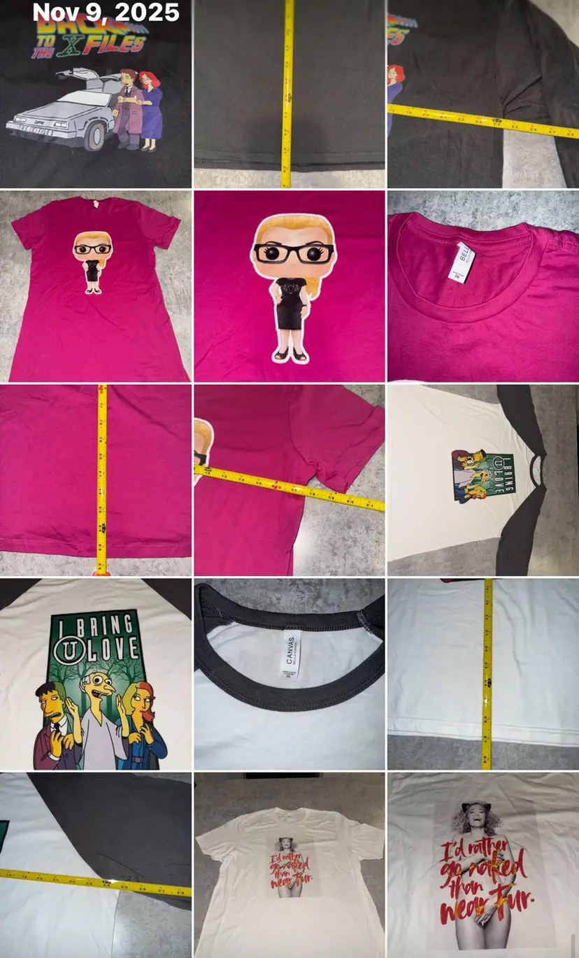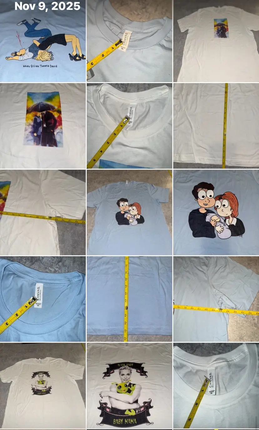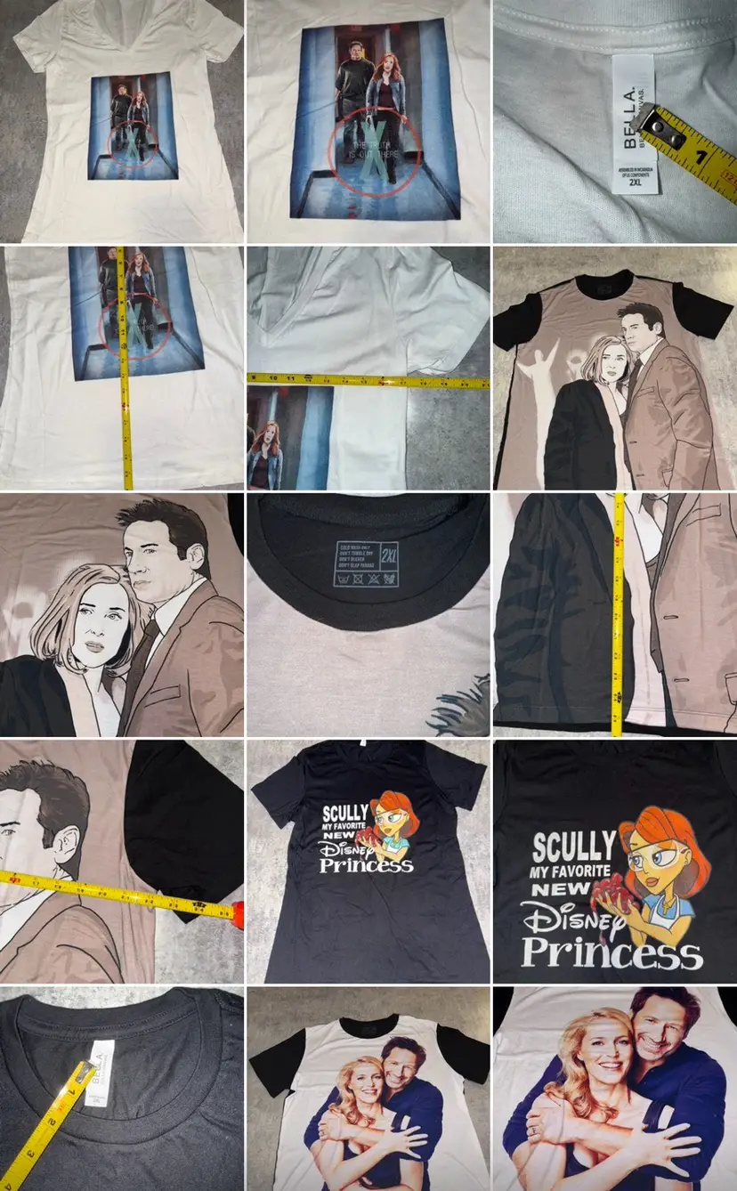 They only allow you 10 photos so I did my best of what I can make with a collage There’s 18 T-shirts The early photos to two exes are more like a juniors 2X and then you can see the larger two and three exes. There’s a really nice assortment.