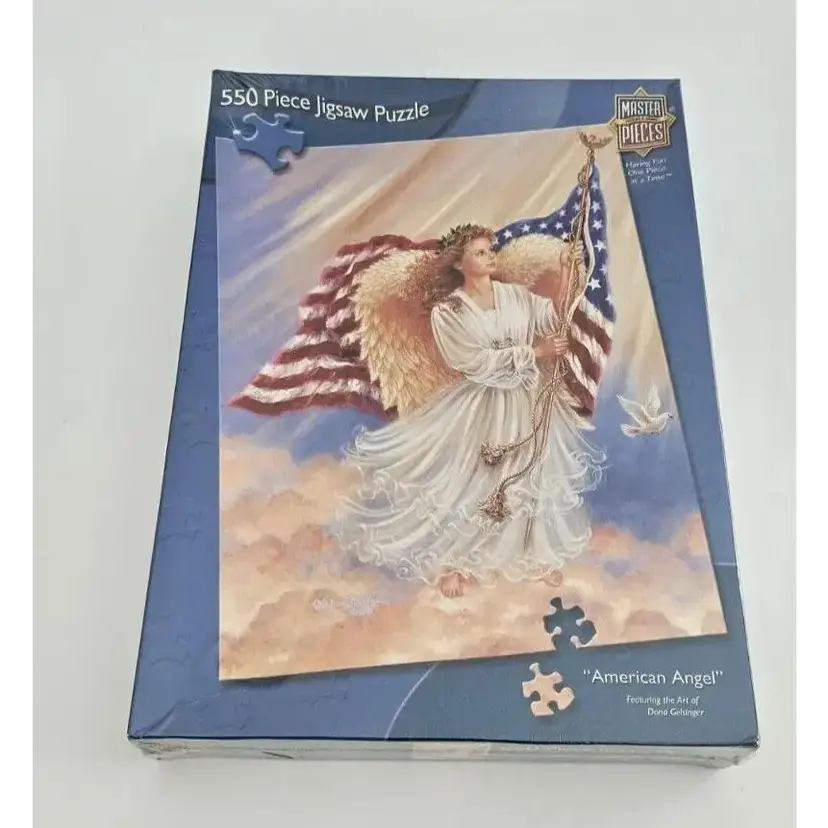 Dive into the serene beauty of 'American Angel' with this 550 piece jigsaw puzzle. Featuring the art of Dona Gelsinger, this puzzle showcases a heavenly angel holding the American flag, surrounded by clouds and a peaceful dove. Perfect for puzzle enthusiasts and art lovers alike.