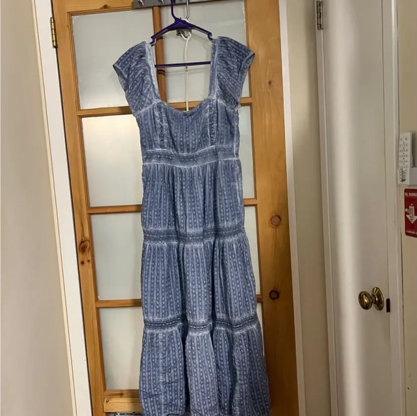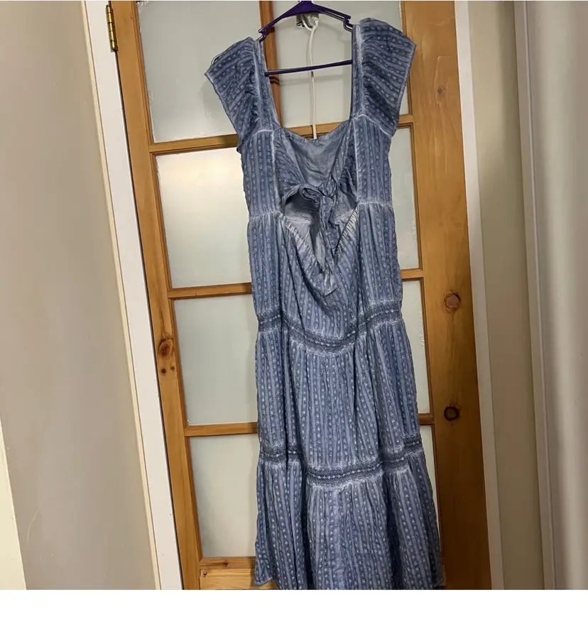 Generous Size. Looks like it could fit up to a Medium. Fit and Flare. Perfect Summer dress!