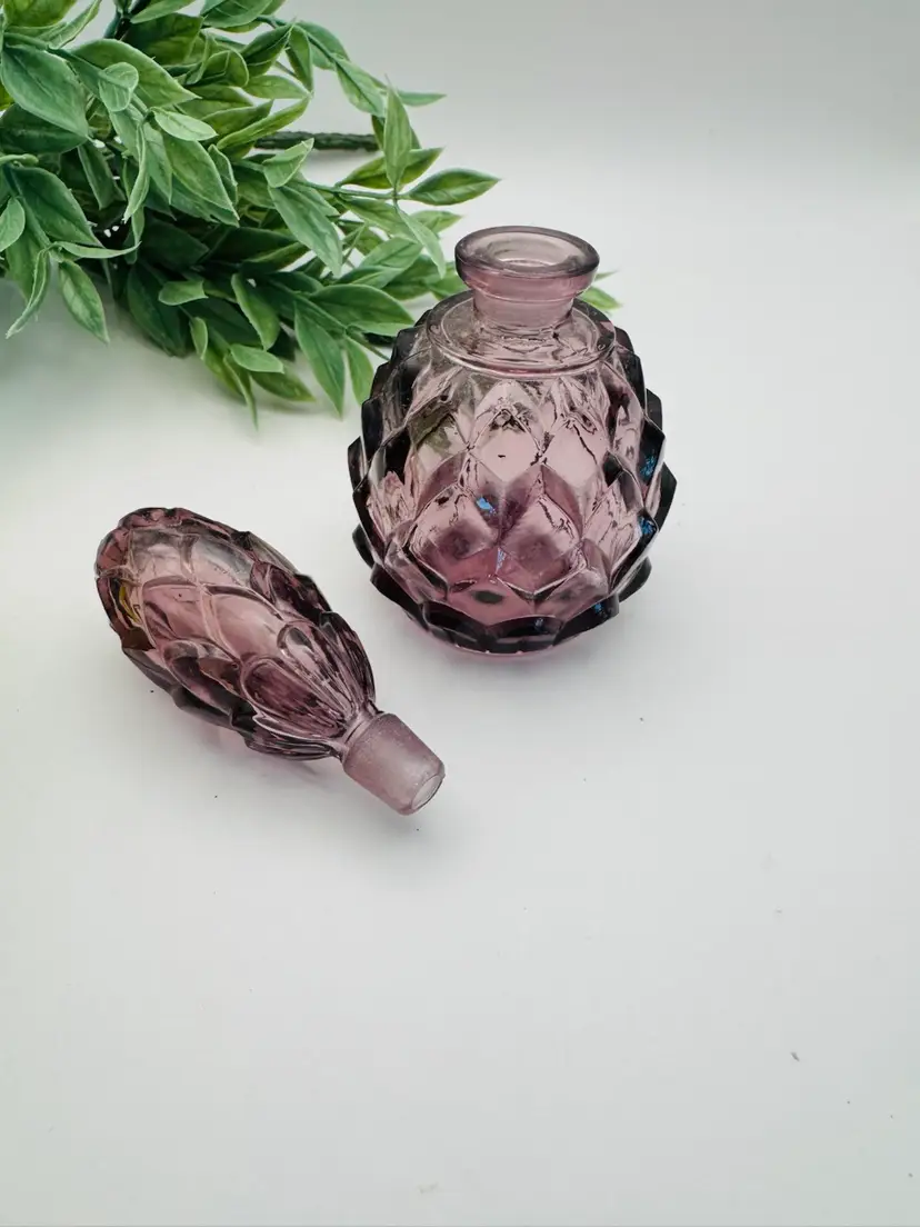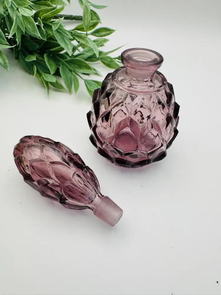 Beautiful amethyst perfume bottle. Glass stopper, no chips. 5” tall, 2.25 diameter
