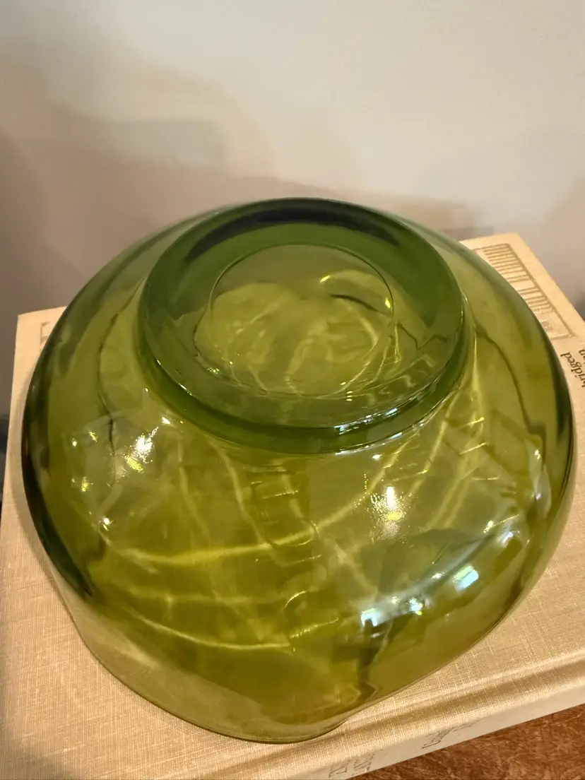 Vintage Anchor Hocking Avocado Green Glass Bowl. This iconic retro set adds a touch of mid-century charm to any gathering. In excellent pre-owned condition with no chips, cracks, or significant wear. Perfect for entertaining or as a decorative centerpiece. A classic piece of mid-century modern kitchenware.