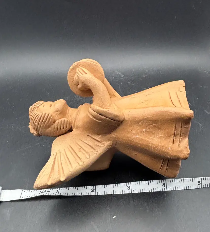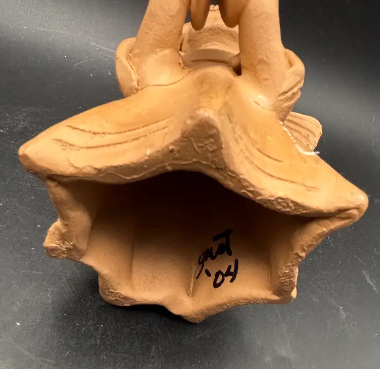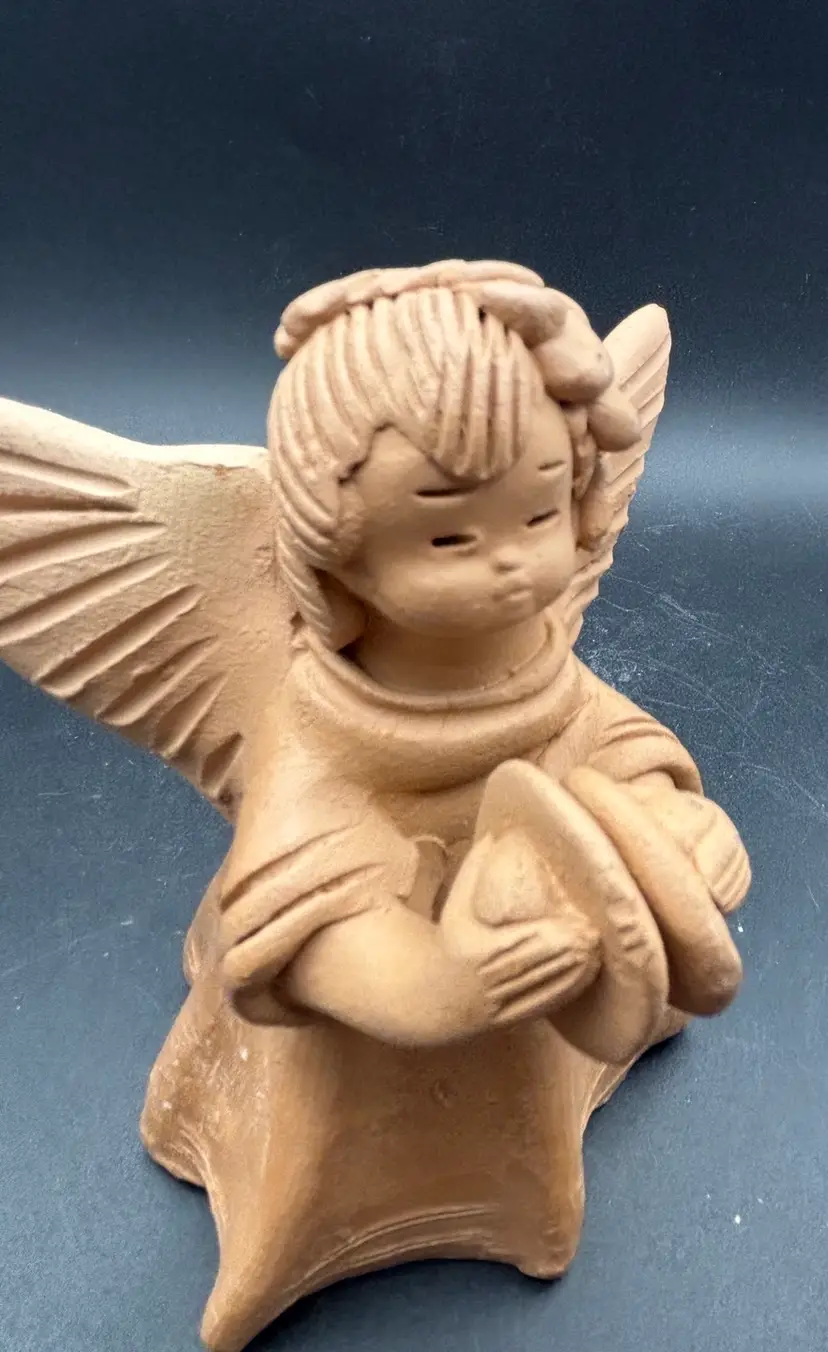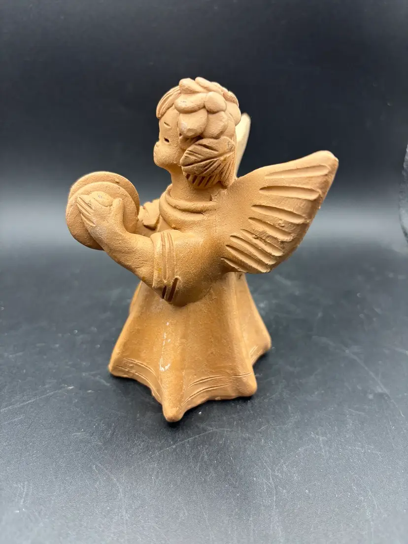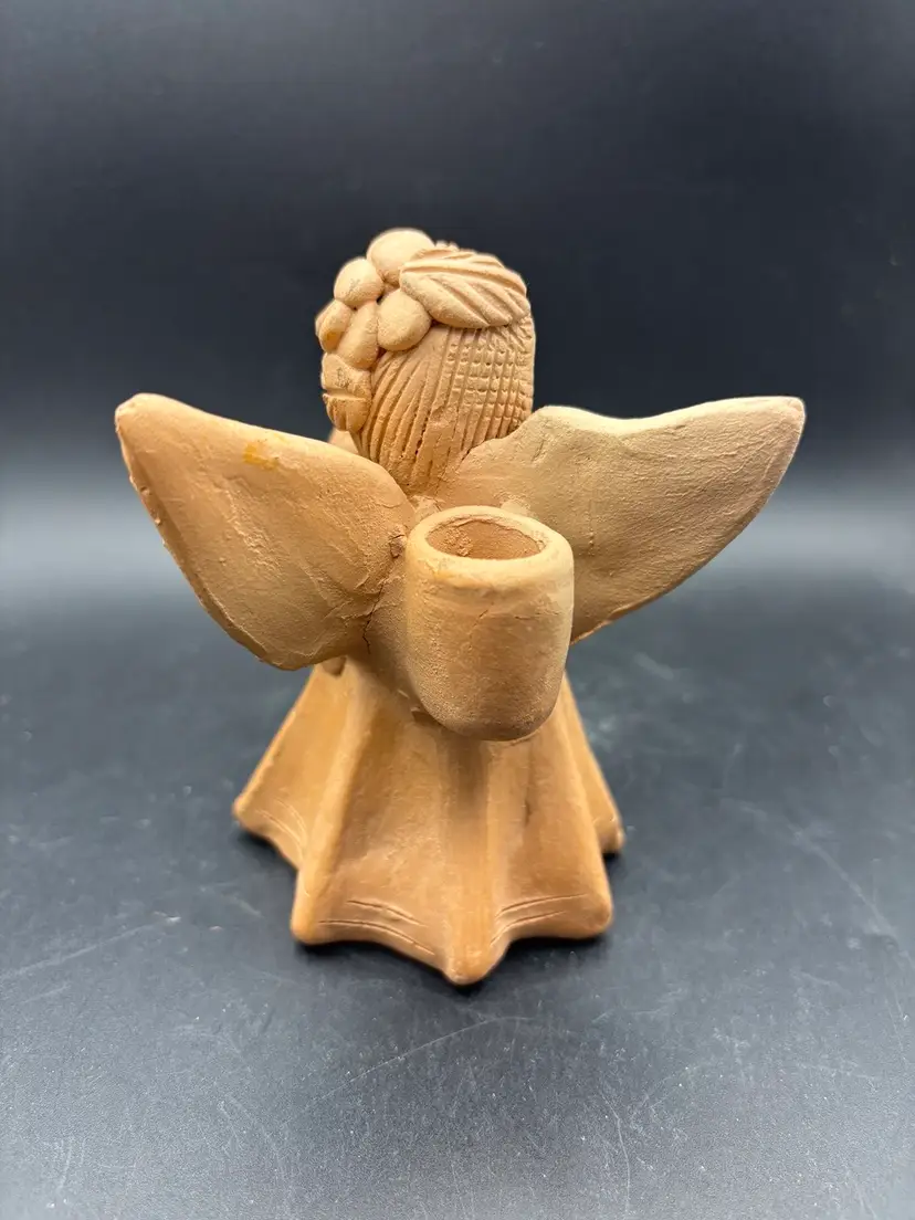 This sweet angel is celebrating by banging her cymbals. The candleholder is signed and dated '04. I think it was made in Guatemala. See photos for condition and size. I find no dings or cracks. F2565.06