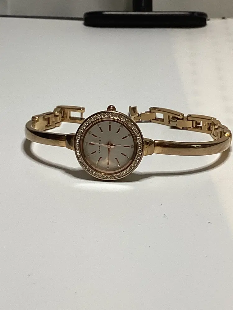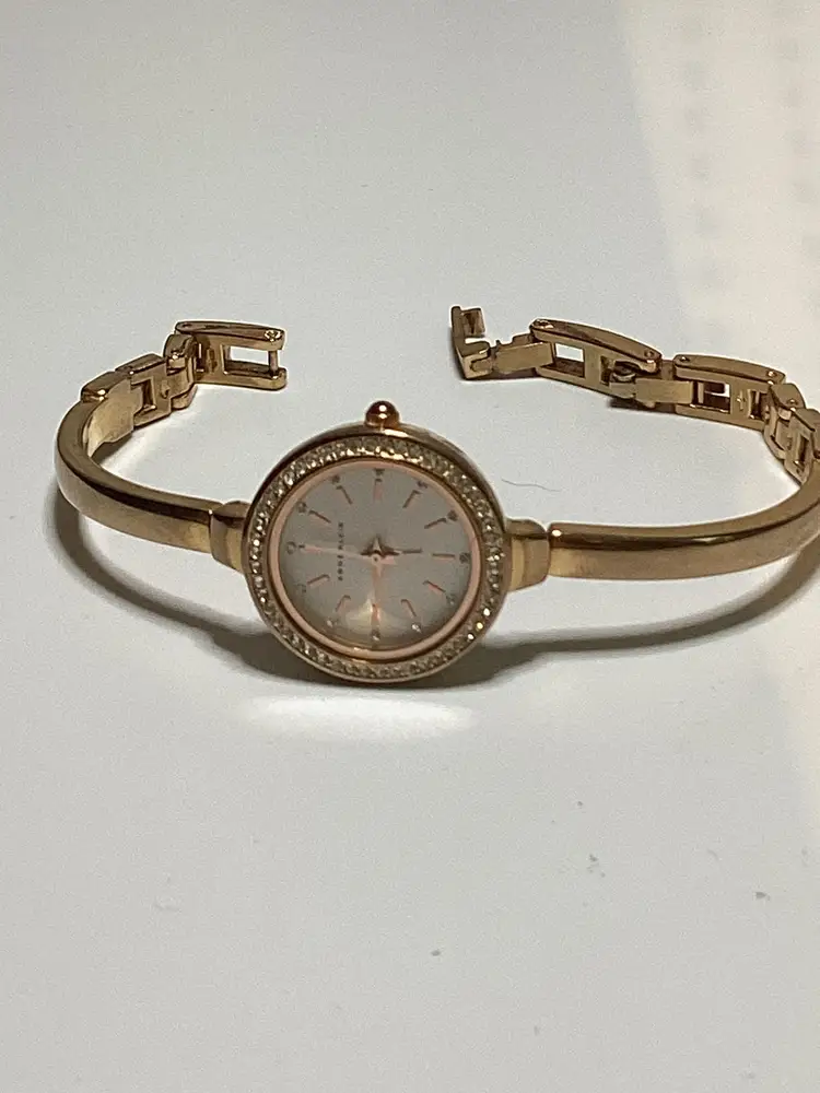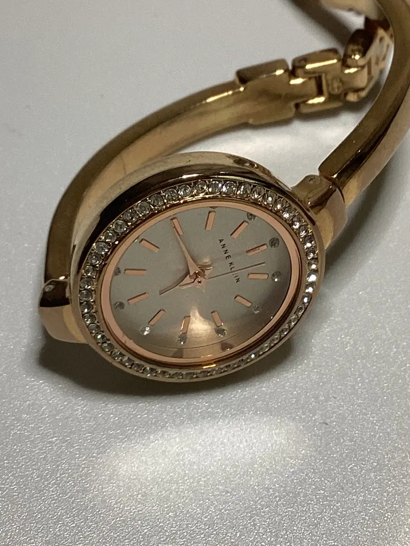 RETAIL: $65 needs battery Water resistant to 30meters Rose gold tone Adjustable link 24mm round case Crystal accents at bezel Crystal hour markers Quartz movement