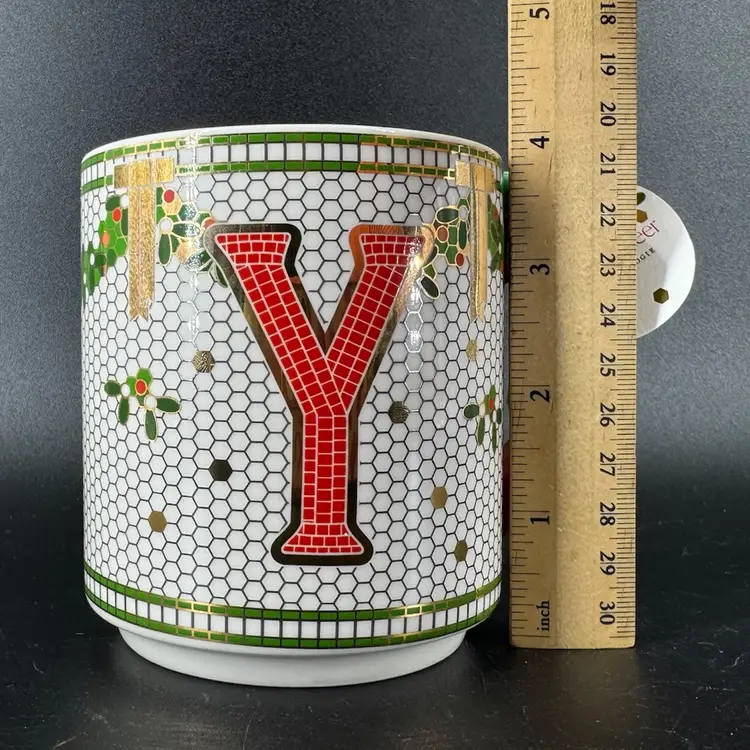 This Anthropology Letter Y Christmas Mug is approximately 4” in height. There are no chips or cracks on it. Also it is marked Anthropology on it.