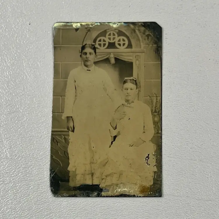 Antique 1800s Photo Portrait Tin Type Tintype Two Women Young Ladies White Dresses