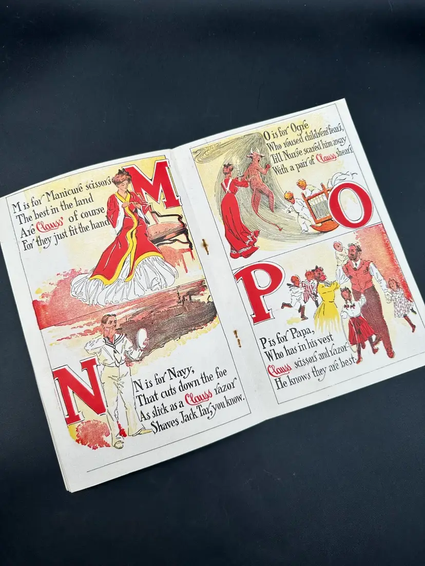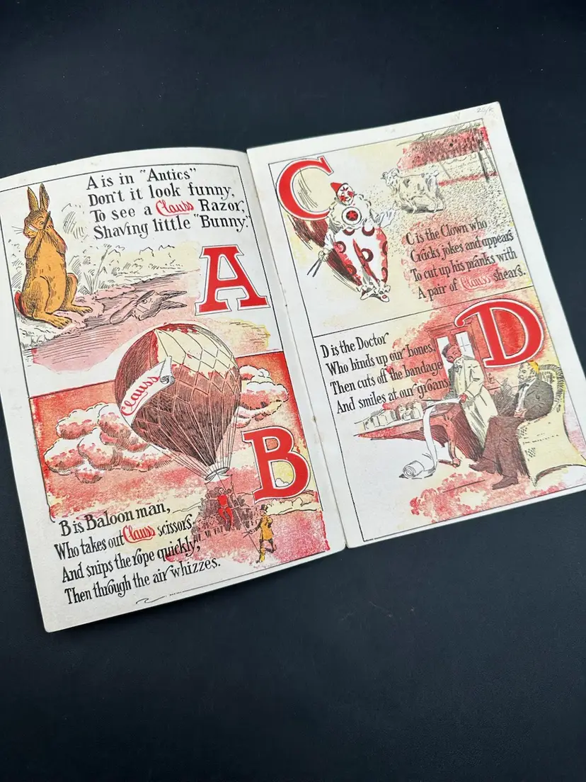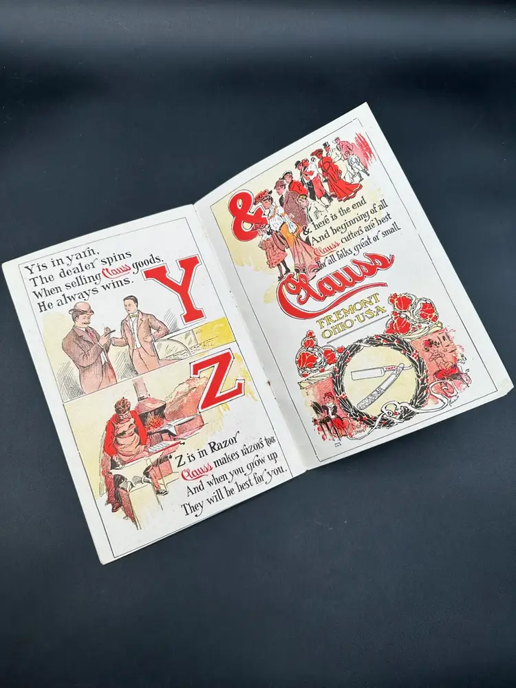 Scarce 1902 Advertising Booklet Child's Alphabet Primer with Outstanding Illustrations Accompanied by Rhymes for a Major World Manufacturer of Scissors and Shearsin Ohio, USA No author. CLAUSS PRIMER . Cleveland Privately printed for the Clauss Shear Co., Fremont, OH by Manz-Holilister, 1902.