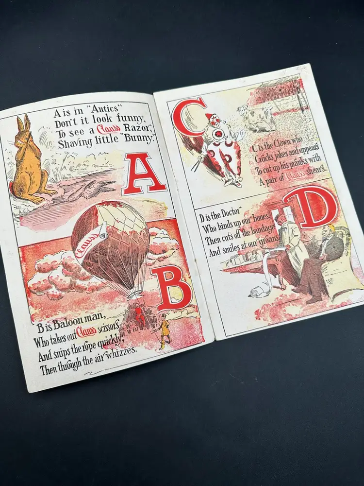 Advertising pieces in the form of children's alphabet books were not uncommon in this era. But this one is larger and more handsomely illustrated than most. The rhymes for some letters are without reference to Clauss Shear Co. but most make specific mention of Clauss scissors, shears, or other products.