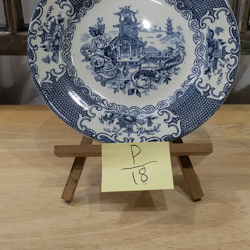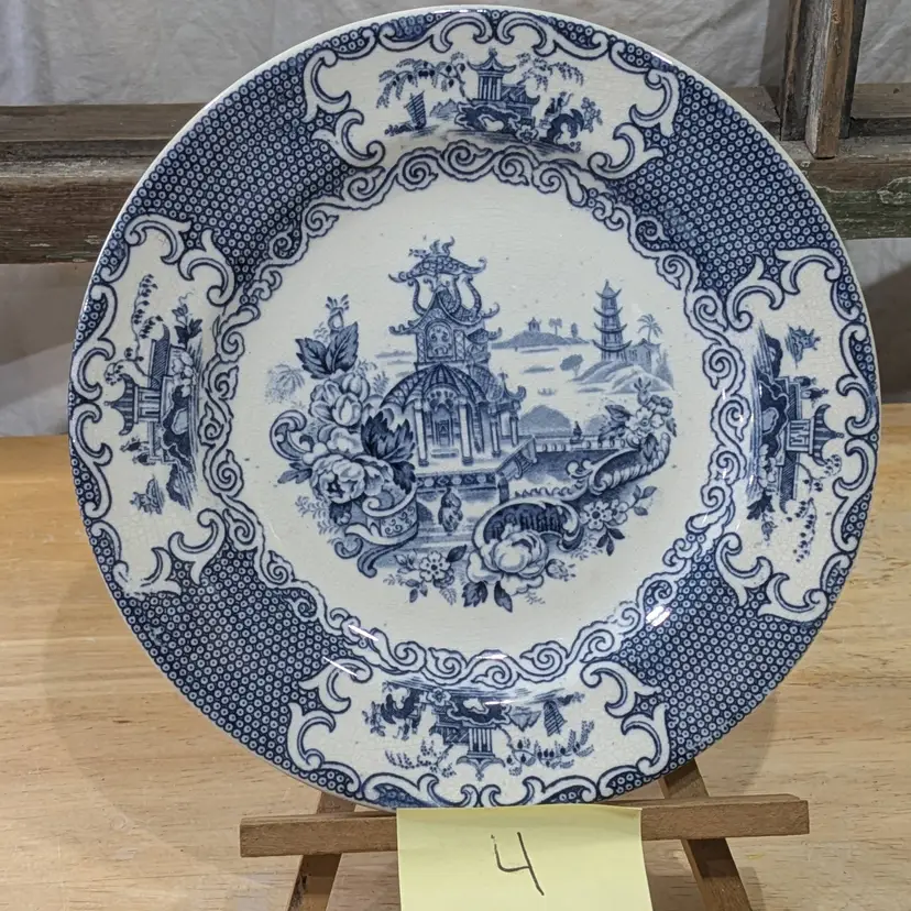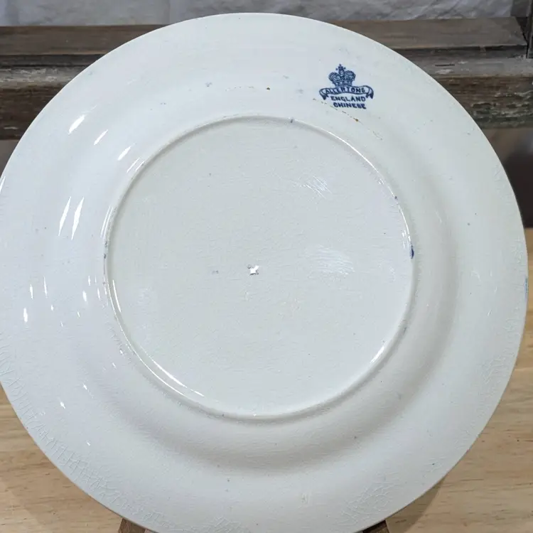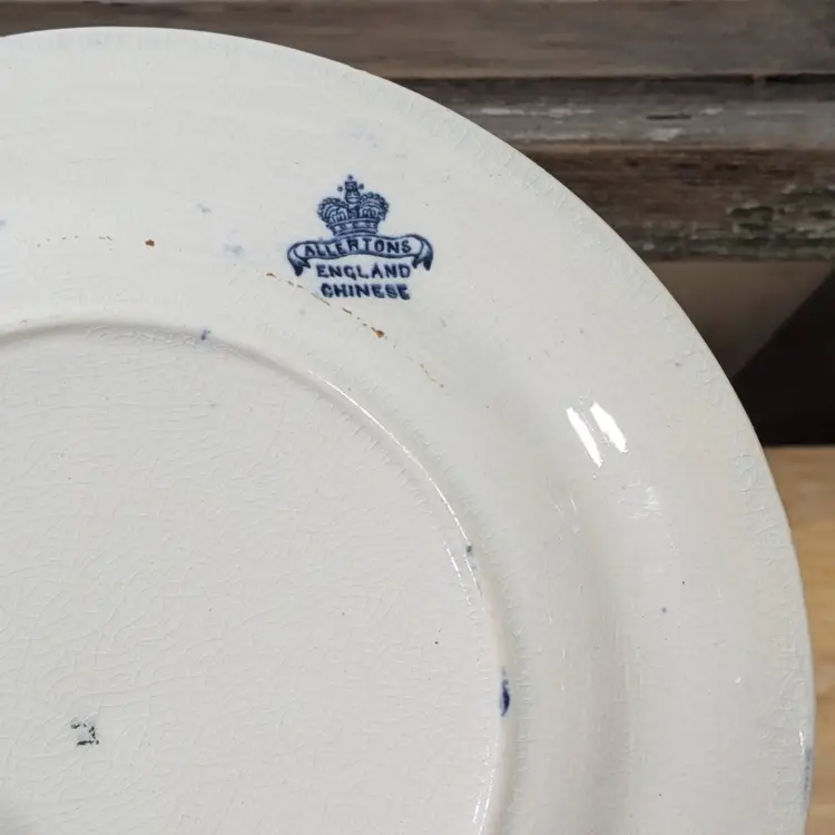 The Antique 1903-1912 Allertons England Transferware Chinese Blue & White Plate is a vintage collector's item featuring a traditional Chinese pattern in blue and white. Made of fine china by the Allerton brand in England during the Edwardian era, this round plate with a diameter of 6.75 inches is a flow blue production style piece that would make a decorative addition to any collector's display. Its English culture and origins add to its collectible appeal for those with a taste for antique decorative pieces from the early 20th century. P-18-4