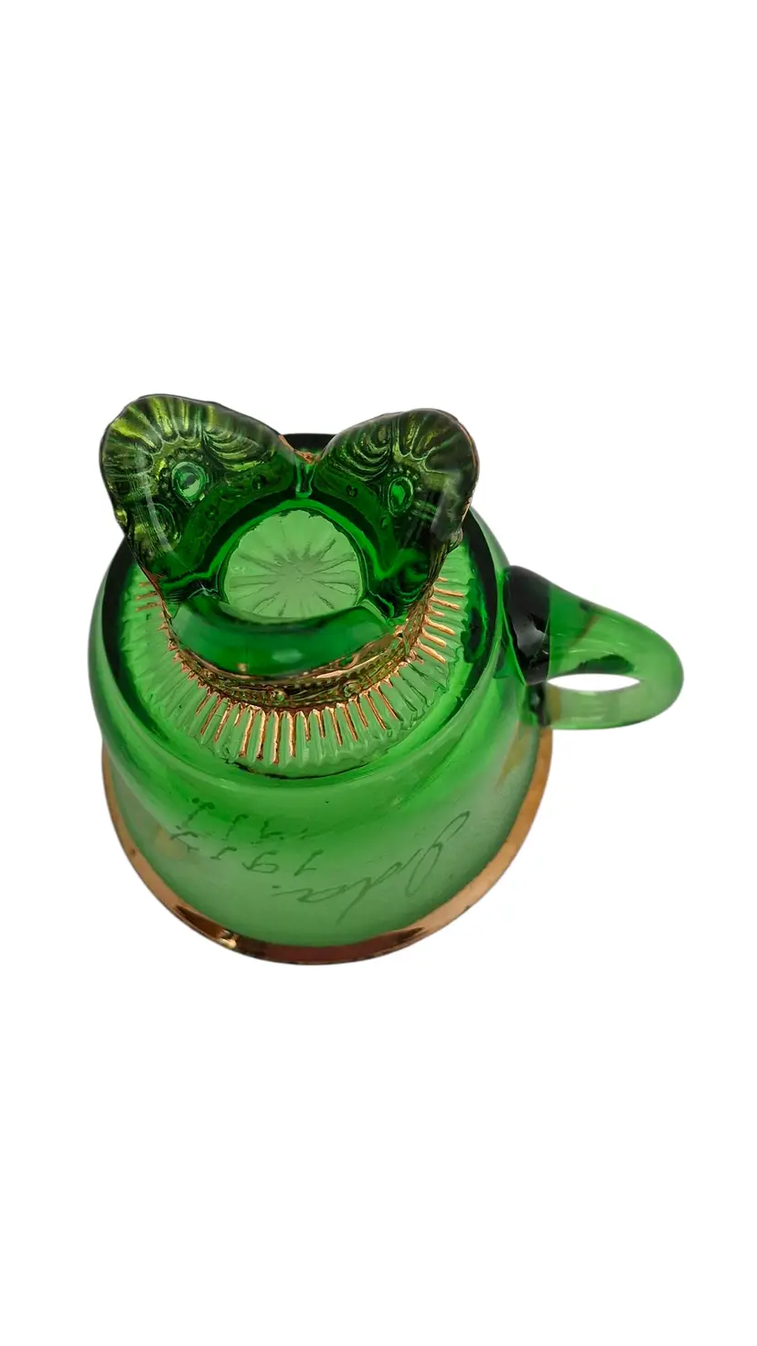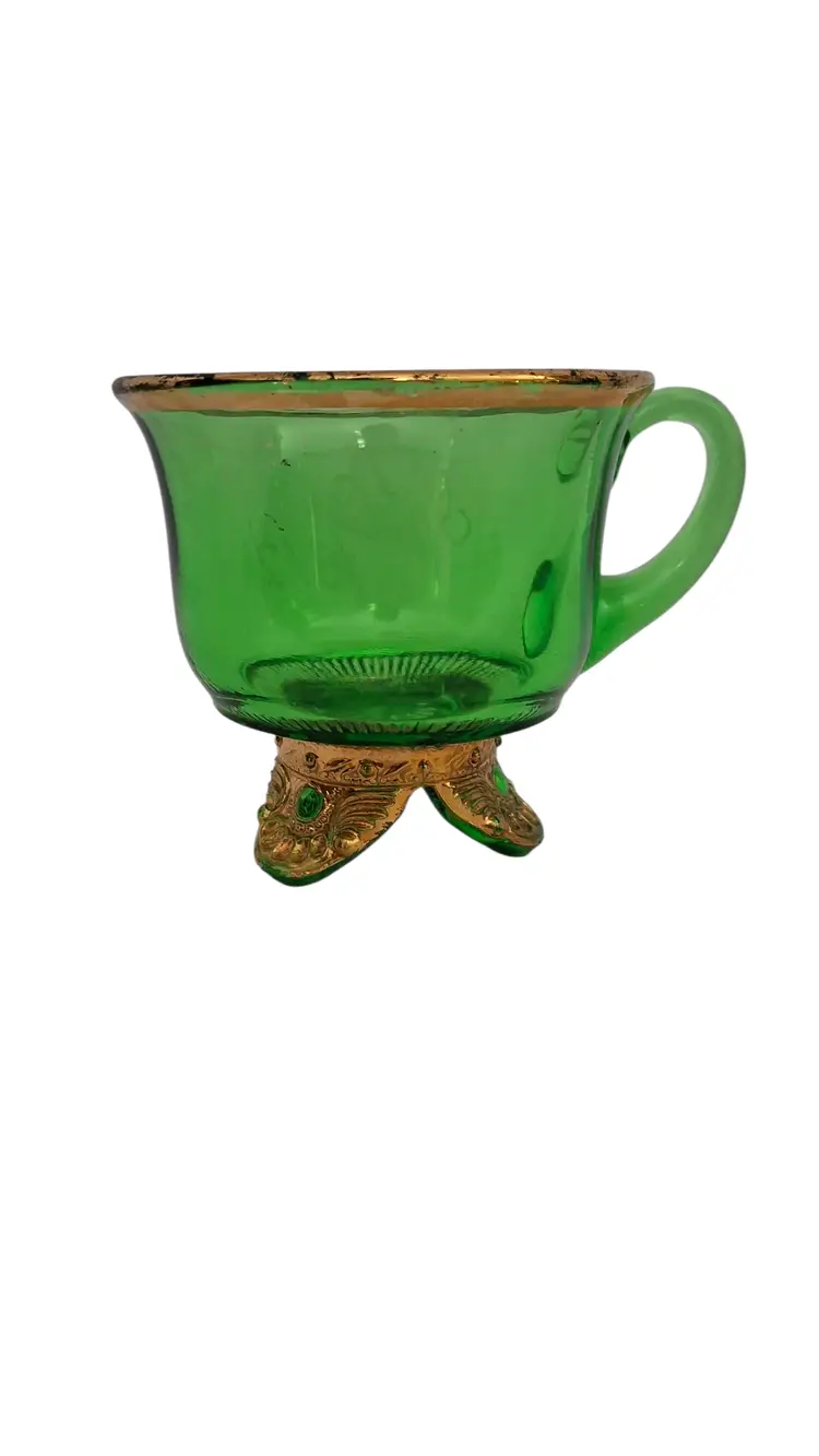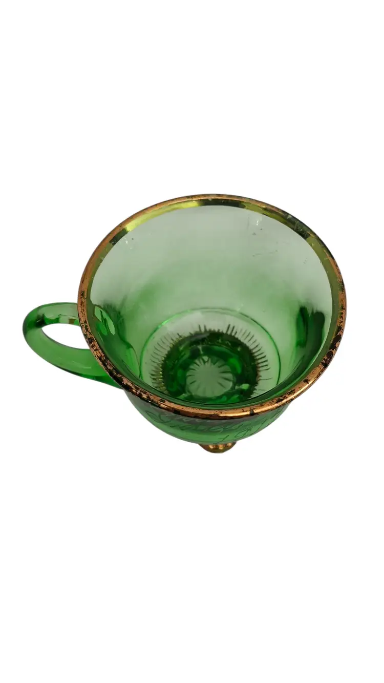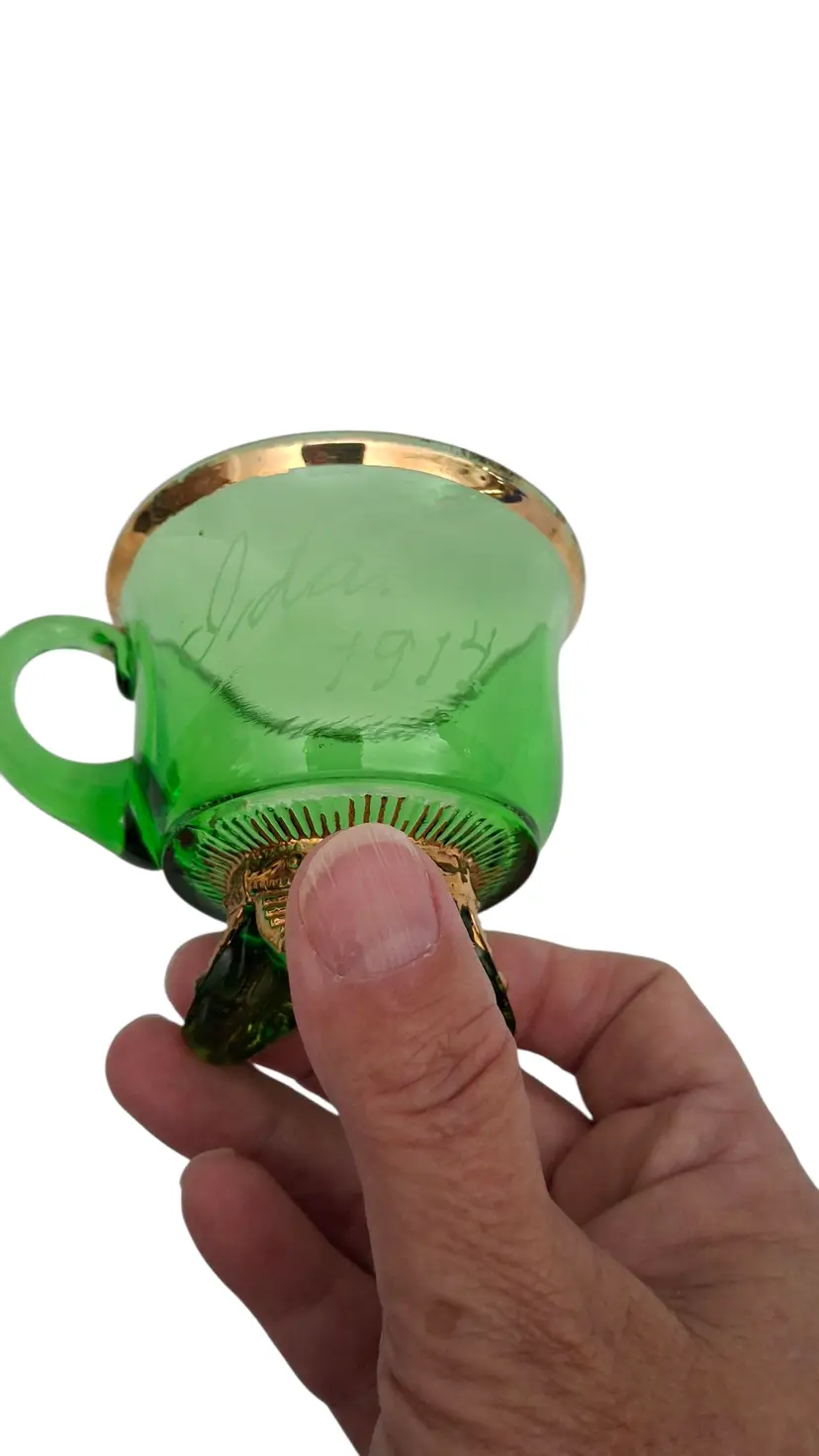 Antique 1914 U.S. Glass Colorado Lacy Medallion Souvenir Cup – Green EAPG Gold Footed Punch Cup – Etched “Ida” – Early American Pressed Glass This emerald green souvenir punch cup is part of the Colorado (Lacy Medallion) pattern, produced by U.S. Glass Co. in the early 1900s. These cups were often sold as fair souvenirs or keepsake gifts and then hand-engraved with names and dates to mark special occasions. This example is engraved “Ida – 1914,” adding history and charm. The cup features the classic Lacy Medallion raised scroll and shield design, along with a graceful applied handle and a beautifully molded three-footed gold-decorated base. The original gold finish is still strong on the footed base, with expected age wear along the top rim. Measurements: • Height: 2 ¾ inches • Width (including handle): 3 ½ inches • Pattern: Colorado (Lacy Medallion) • Maker: U.S. Glass Co. • Date Engraved: 1914 • Color: Emerald Green Pressed Glass Condition: No chips or cracks. Gold trim on rim is worn, but gold on base is richly intact. Glass remains clear with no clouding. Handle secure. A charming addition for: • EAPG and U.S. Glass pattern collectors • Antique barware or drinkware displays • Victorian-era décor styling • Sentimental or personalized gift collections This piece carries the sweet sentiment of a cherished gift, preserved for over a century.