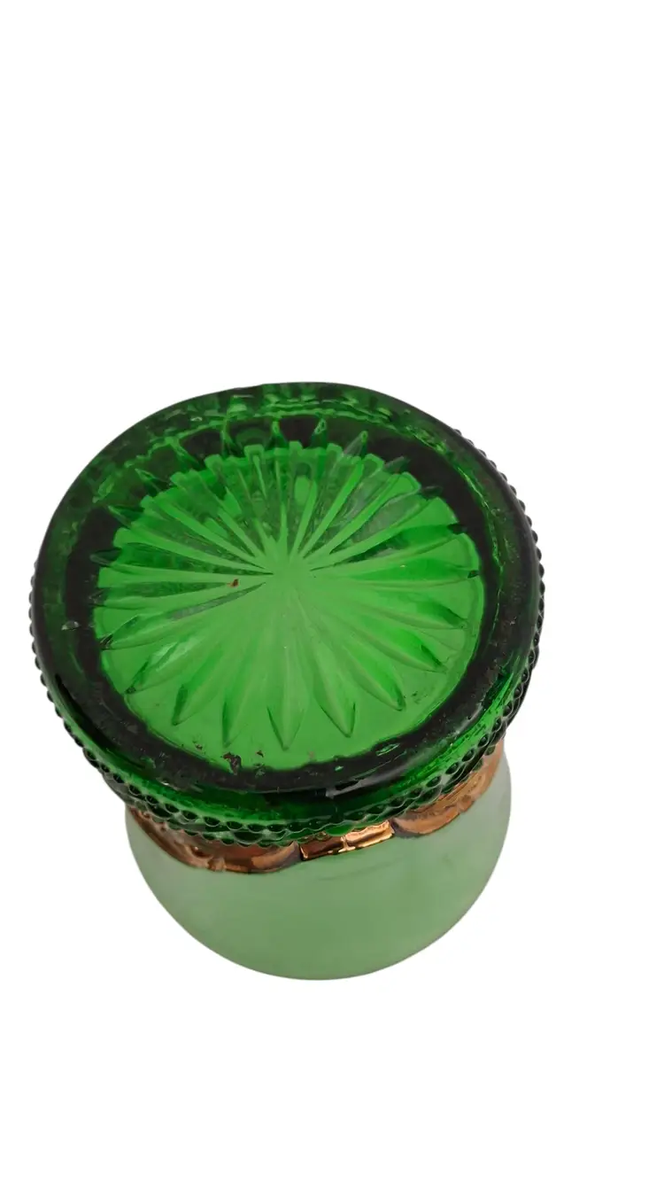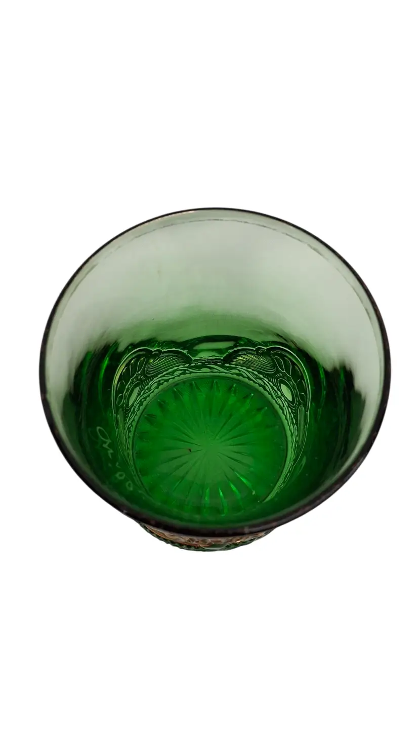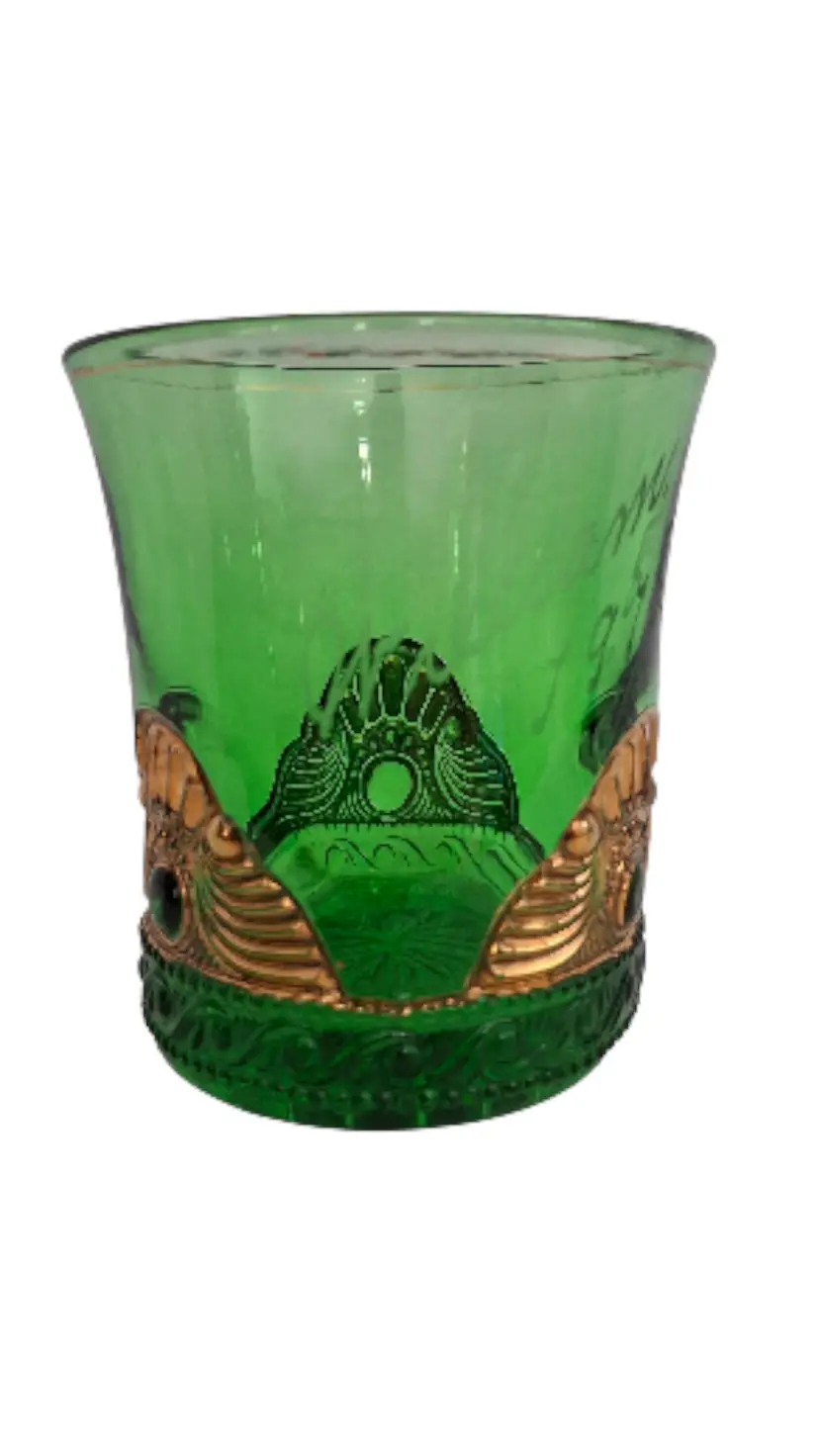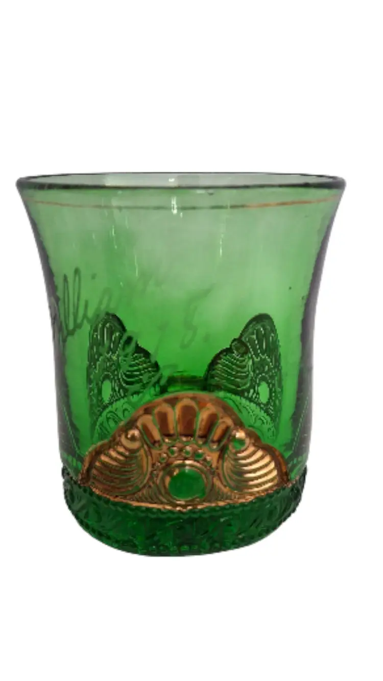 Antique 1918 U.S. Glass Colorado Lacy Medallion Souvenir Tumbler – Green EAPG Gold Decorated Gift Glass – Etched “William” – Victorian Era This emerald green souvenir tumbler features the classic Colorado (Lacy Medallion) pattern produced by U.S. Glass Co. in the early 1900s. The piece is hand-engraved “William – 1918,” marking it as a personal keepsake gift from the era when engraved presentation glass was a popular tradition at fairs, graduations, reunions, and milestones. The Colorado / Lacy Medallion pattern displays raised shield-like medallions, scrolling flourishes, and a beautifully textured lower band. The gold trim is still richly intact along the lower design, with expected age wear around the upper rim — very characteristic of genuine antique EAPG souvenir pieces. Measurements: • Height: 3 ½ inches • Diameter: approx. 2 ¾ inches • Maker: U.S. Glass Co. • Pattern: Colorado (Lacy Medallion) • Engraved Date: 1918 • Color: Emerald Green Pressed Glass • Technique: Hand-Engraved Souvenir Glass Condition: No chips or cracks. Gold is strong on the lower band, with light to moderate expected wear at the rim. Glass is clear with no clouding. Perfect for: • EAPG collectors • U.S. Glass pattern completists • Victorian or Edwardian era display • Sentimental or name-themed memorabilia collections • Antique shelf styling / study room décor A lovely, personalized piece of American glass history.