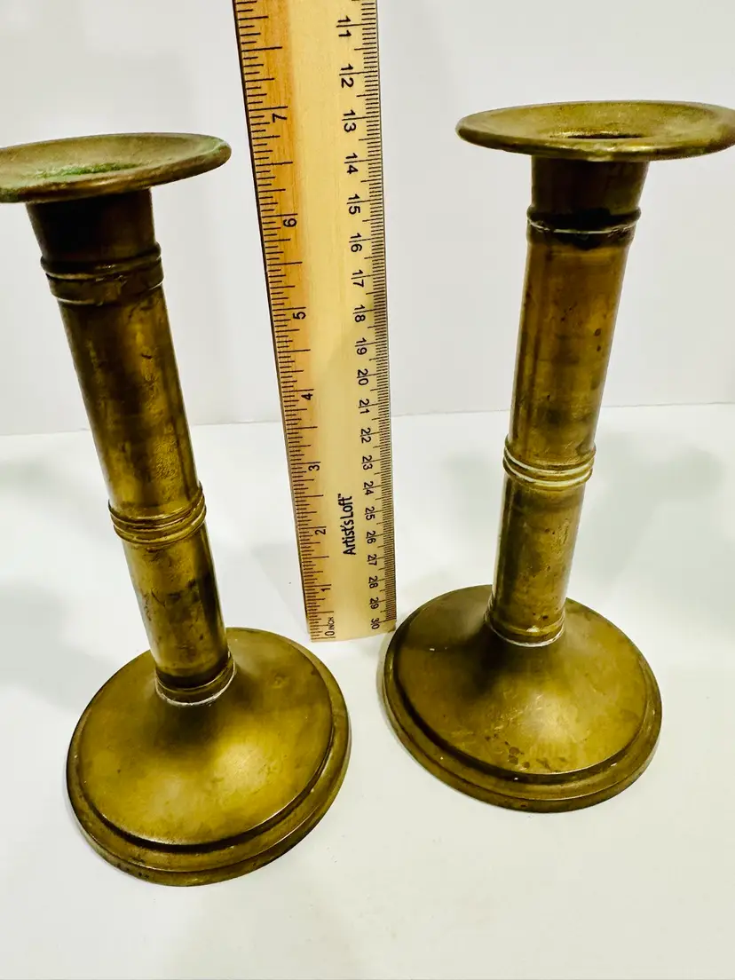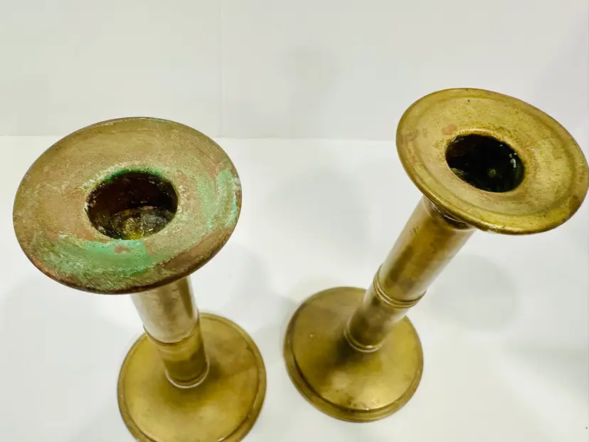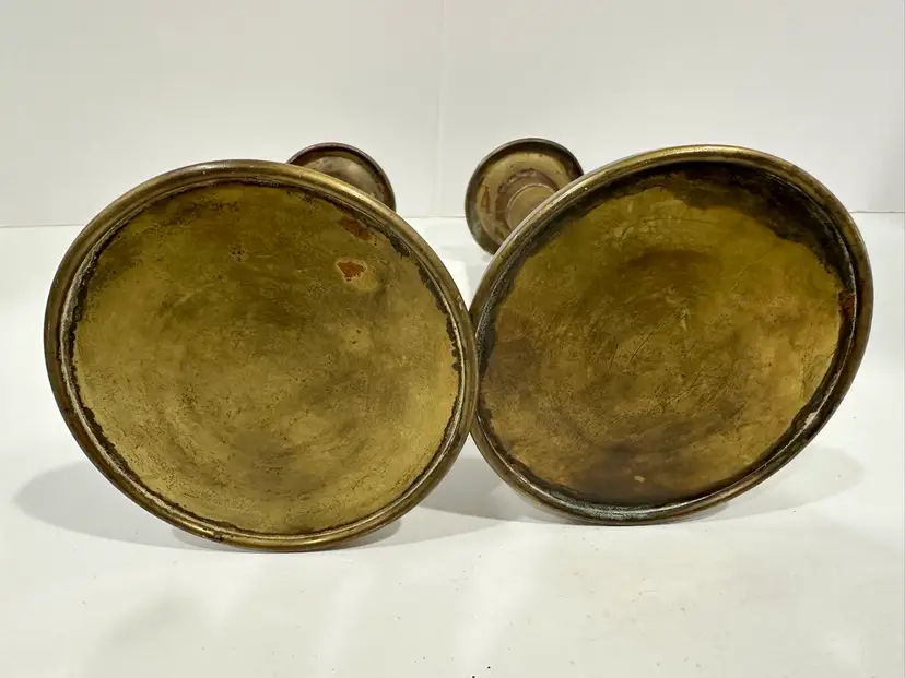Add timeless elegance to your space with this stunning pair of antique brass candlestick holders. Beautifully crafted, these candle holders showcase the intricate detailing and craftsmanship of vintage pieces. Their warm brass finish and classic design make them perfect for creating a cozy, inviting ambiance in any room.